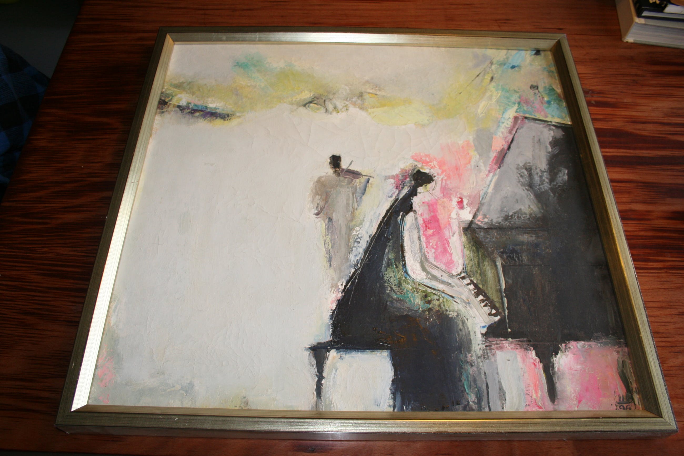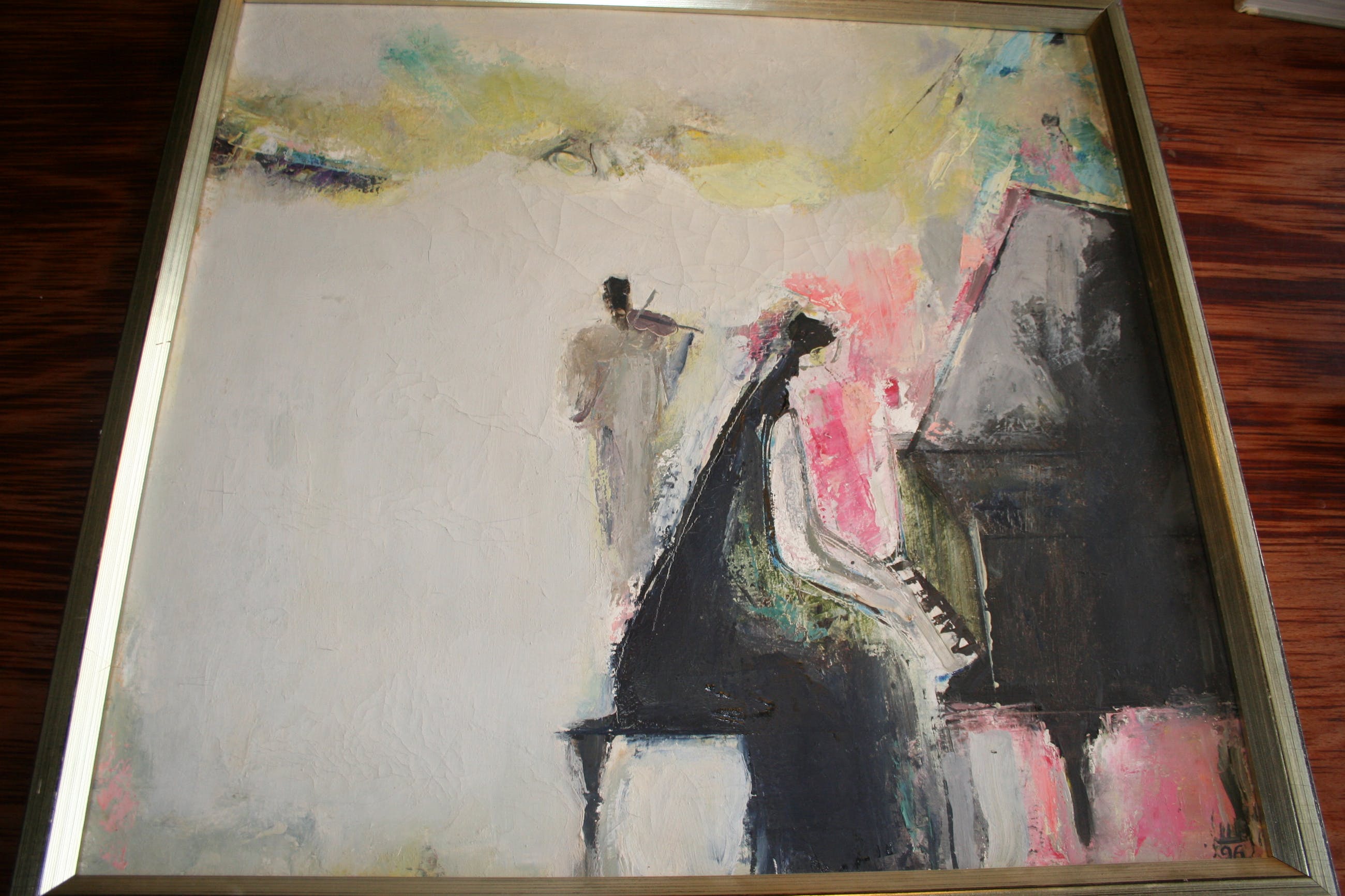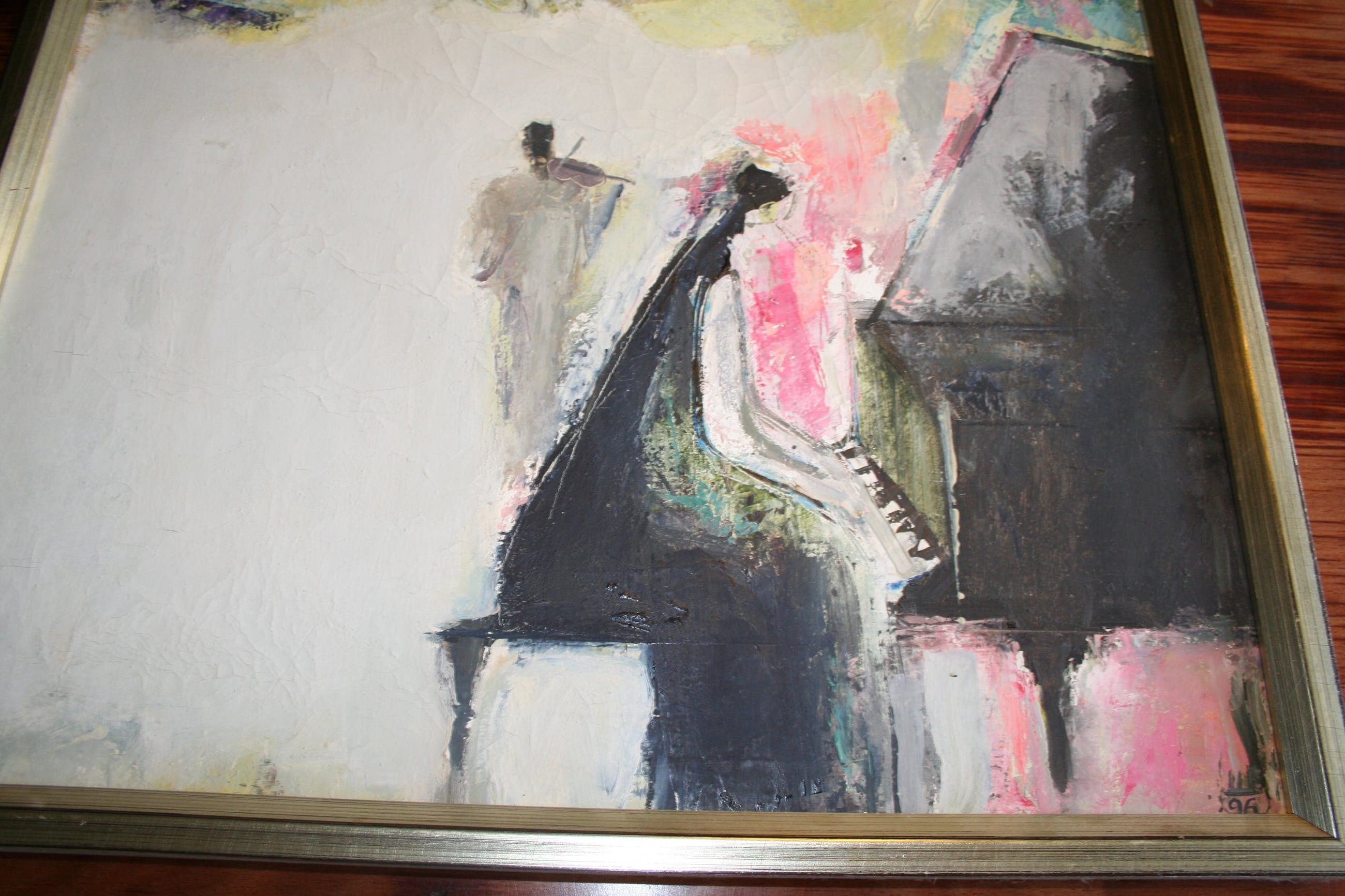 Een tweetal schilderijen,fraai van kleur en compositie.Het onderwerp van het ene schilderij is een harpiste,de ander een pianiste.Achterop de schilderijen staat informatie in het Russisch,een taal die ik helaas niet machtig ben.Beide schilderijen verkeren in goede staat.