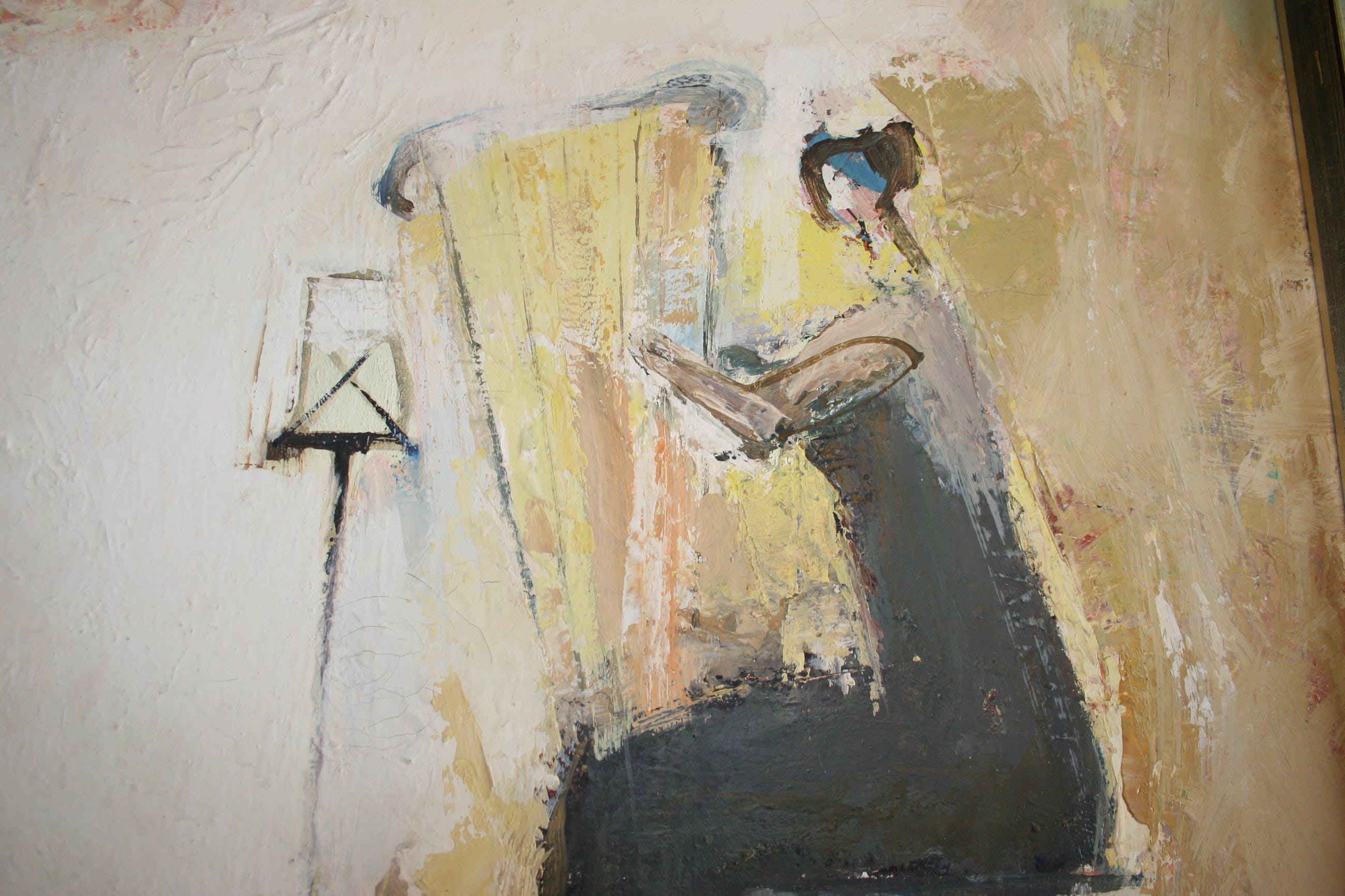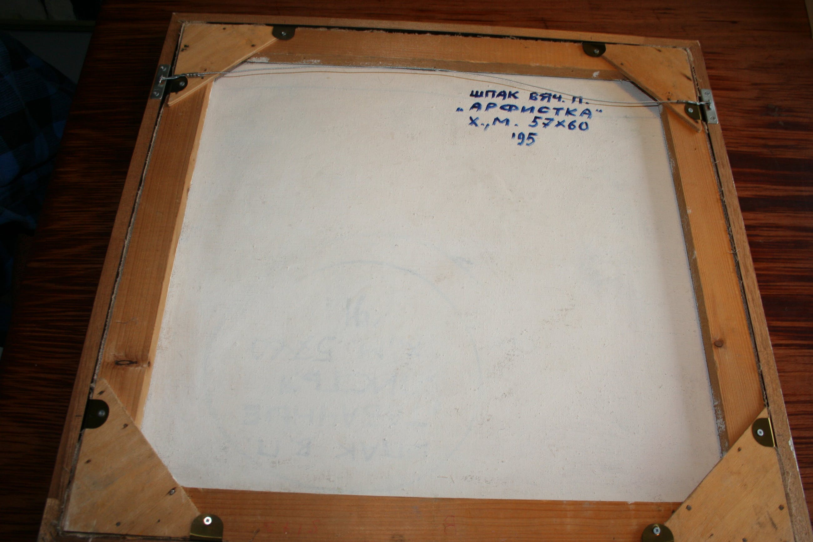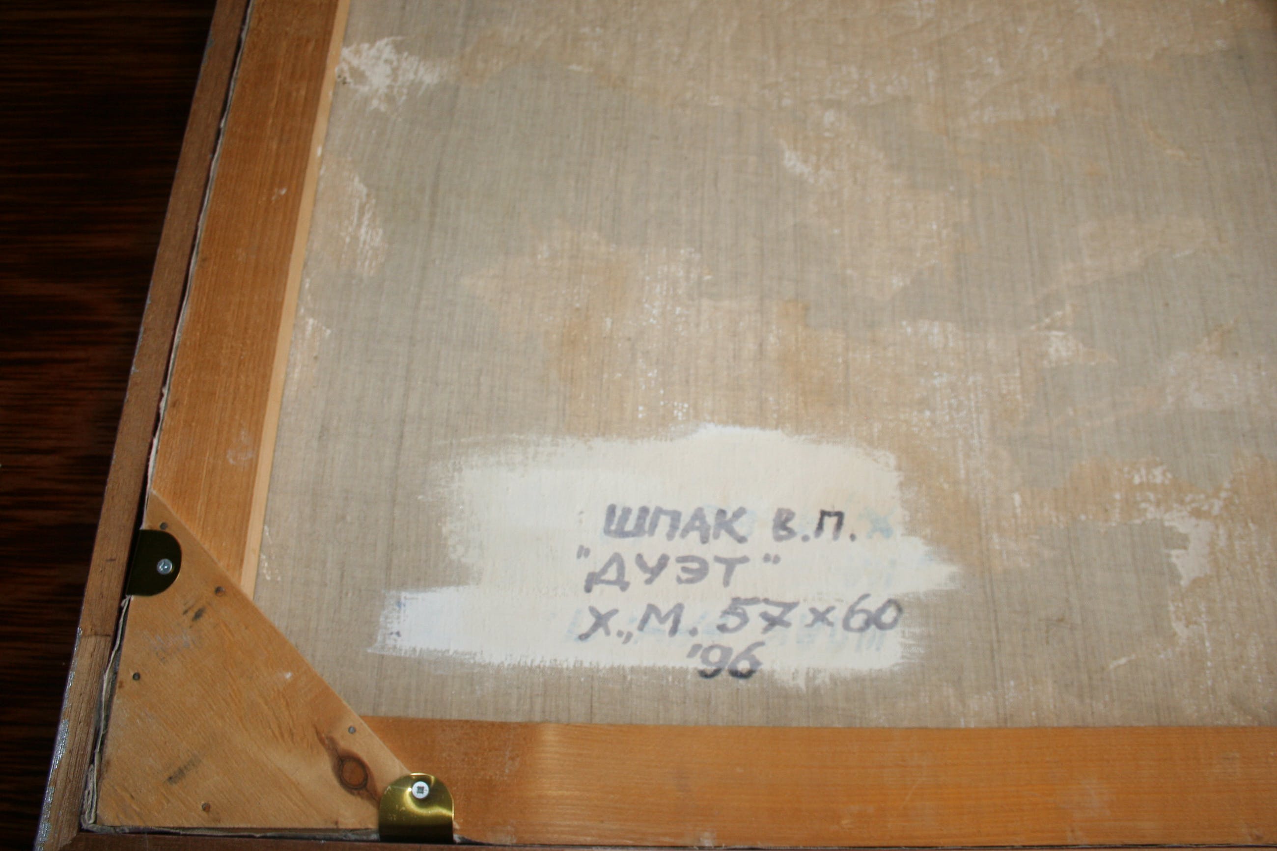 Een tweetal schilderijen,fraai van kleur en compositie.Het onderwerp van het ene schilderij is een harpiste,de ander een pianiste.Achterop de schilderijen staat informatie in het Russisch,een taal die ik helaas niet machtig ben.Beide schilderijen verkeren in goede staat.