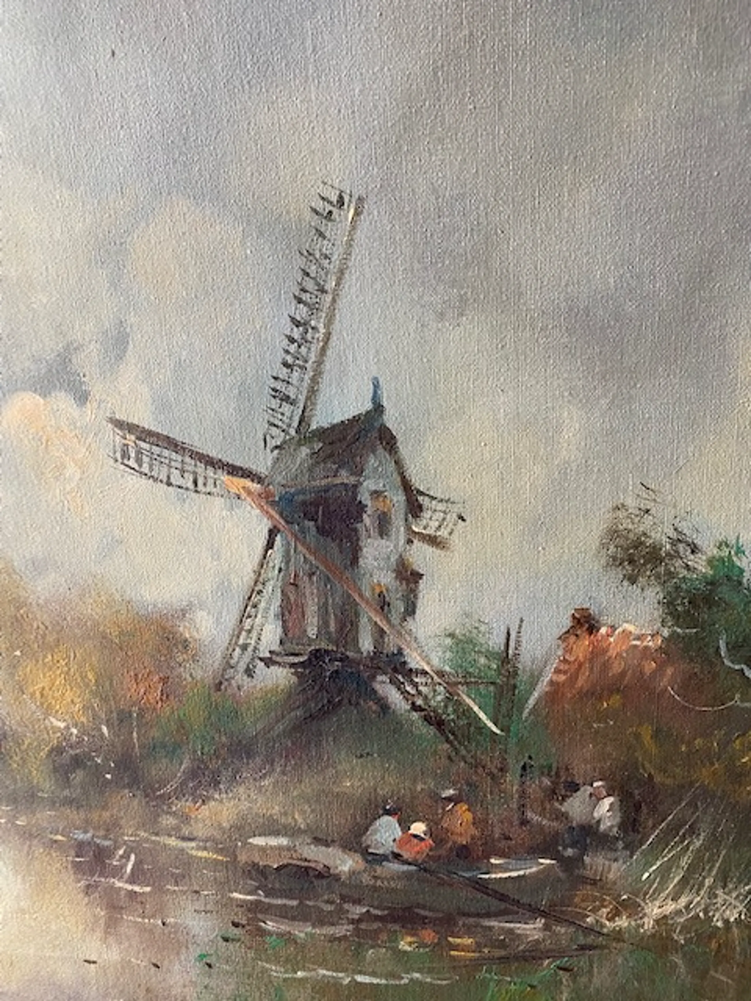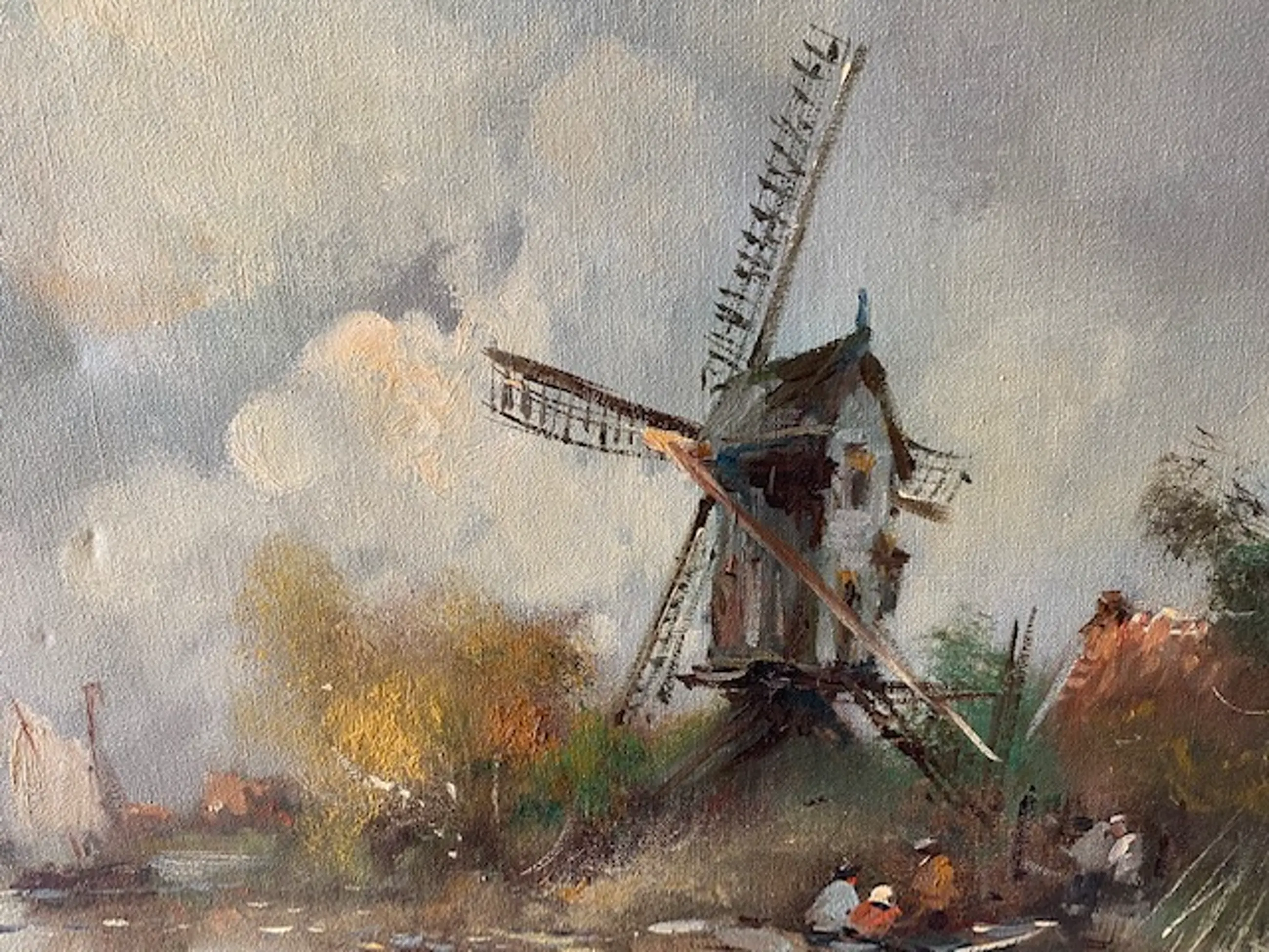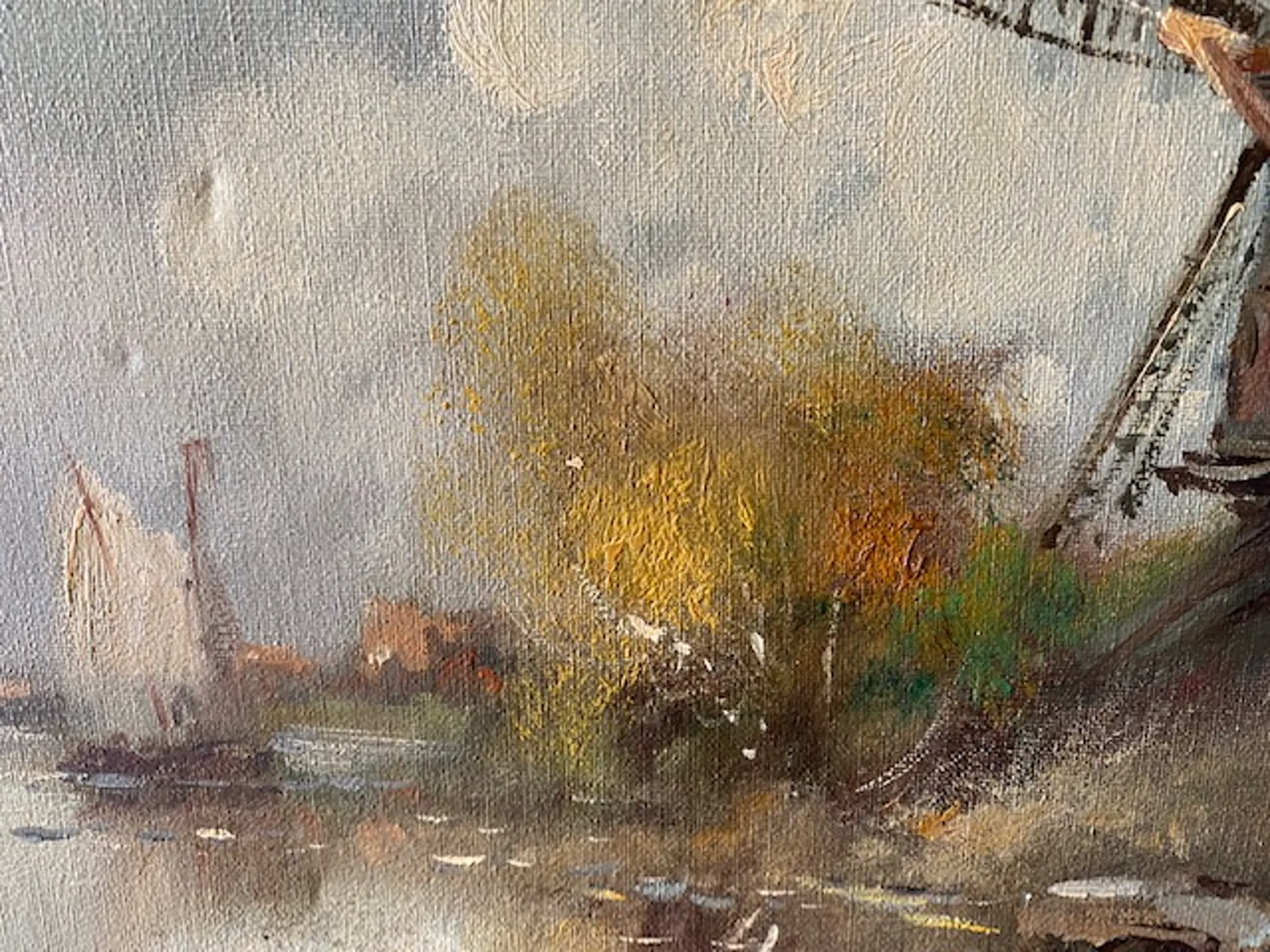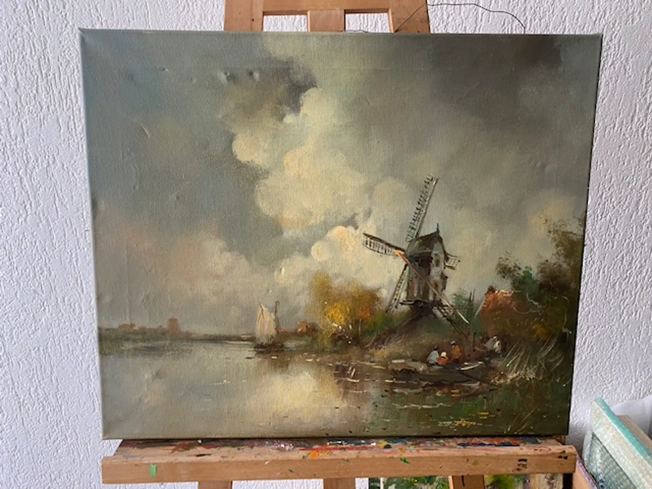 Een typisch Hollands polderlandschap met een houten molen uit het begin van de vorige eeuw. Het doek is niet ingelijst en vertoont gebruiks- en ouderdomssporen.
