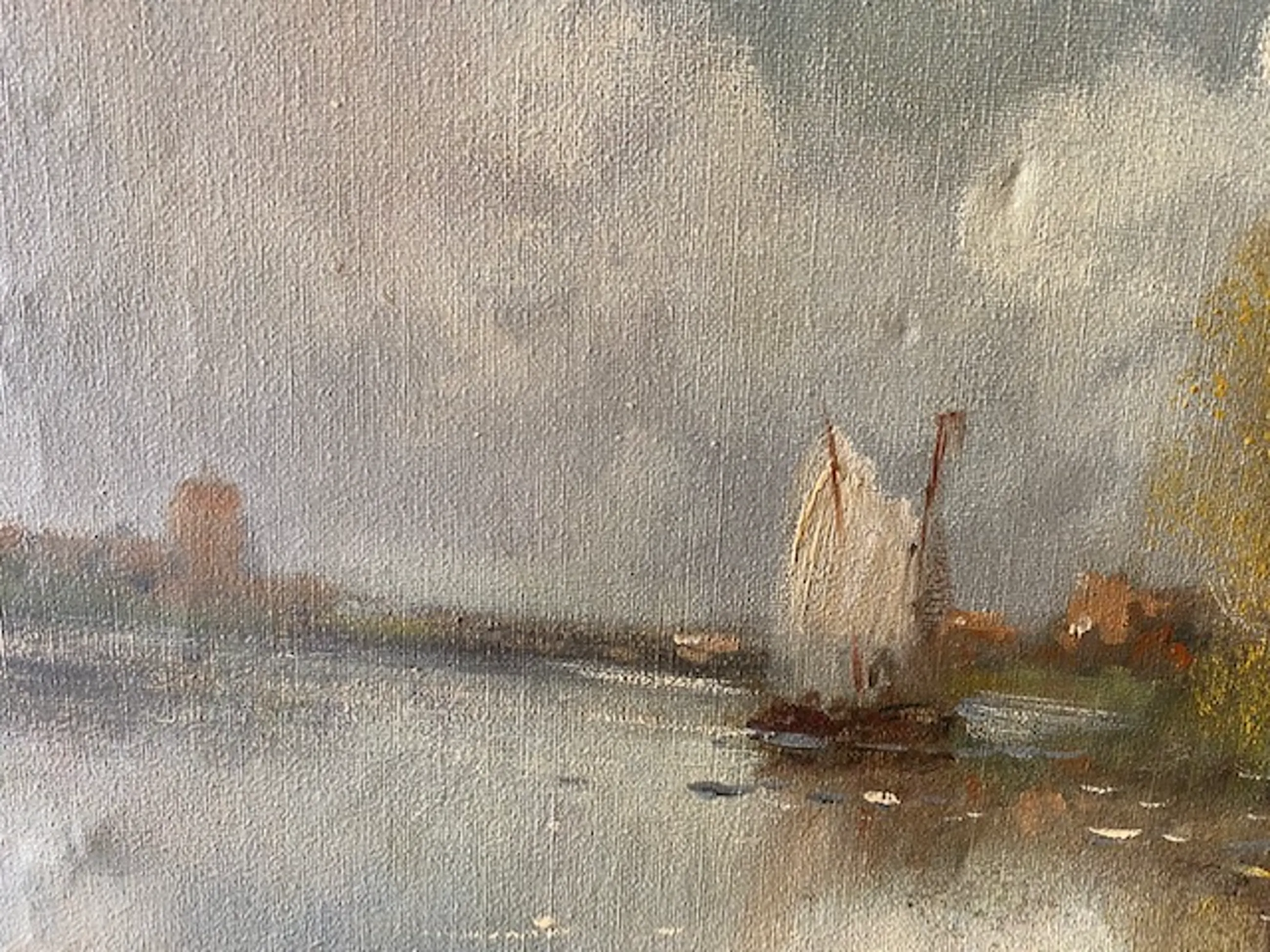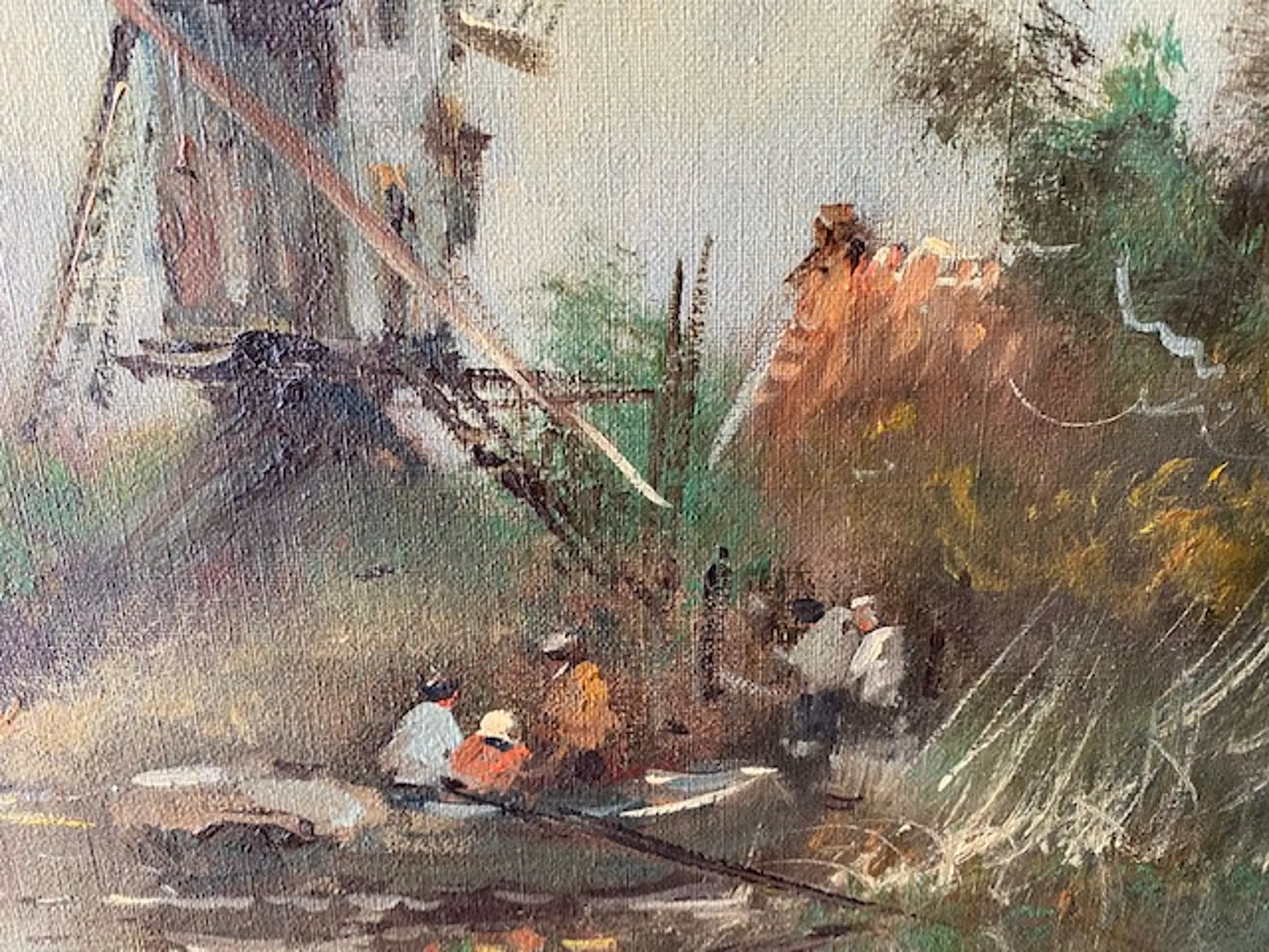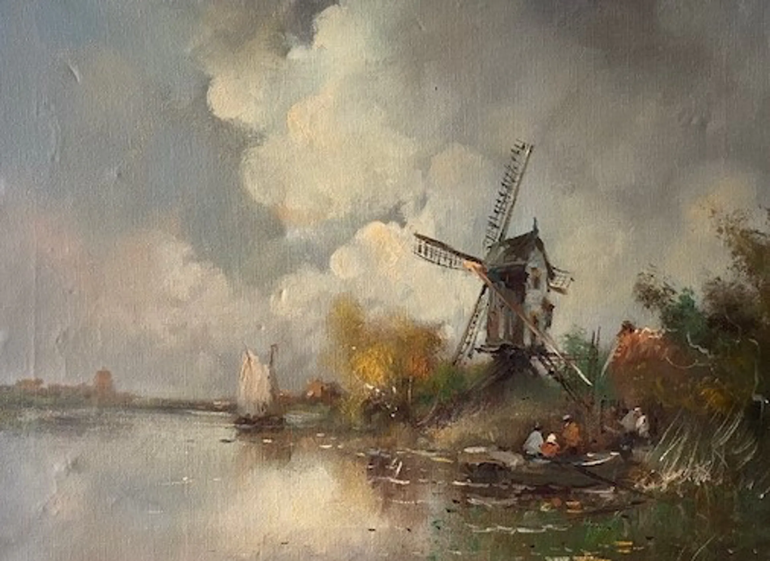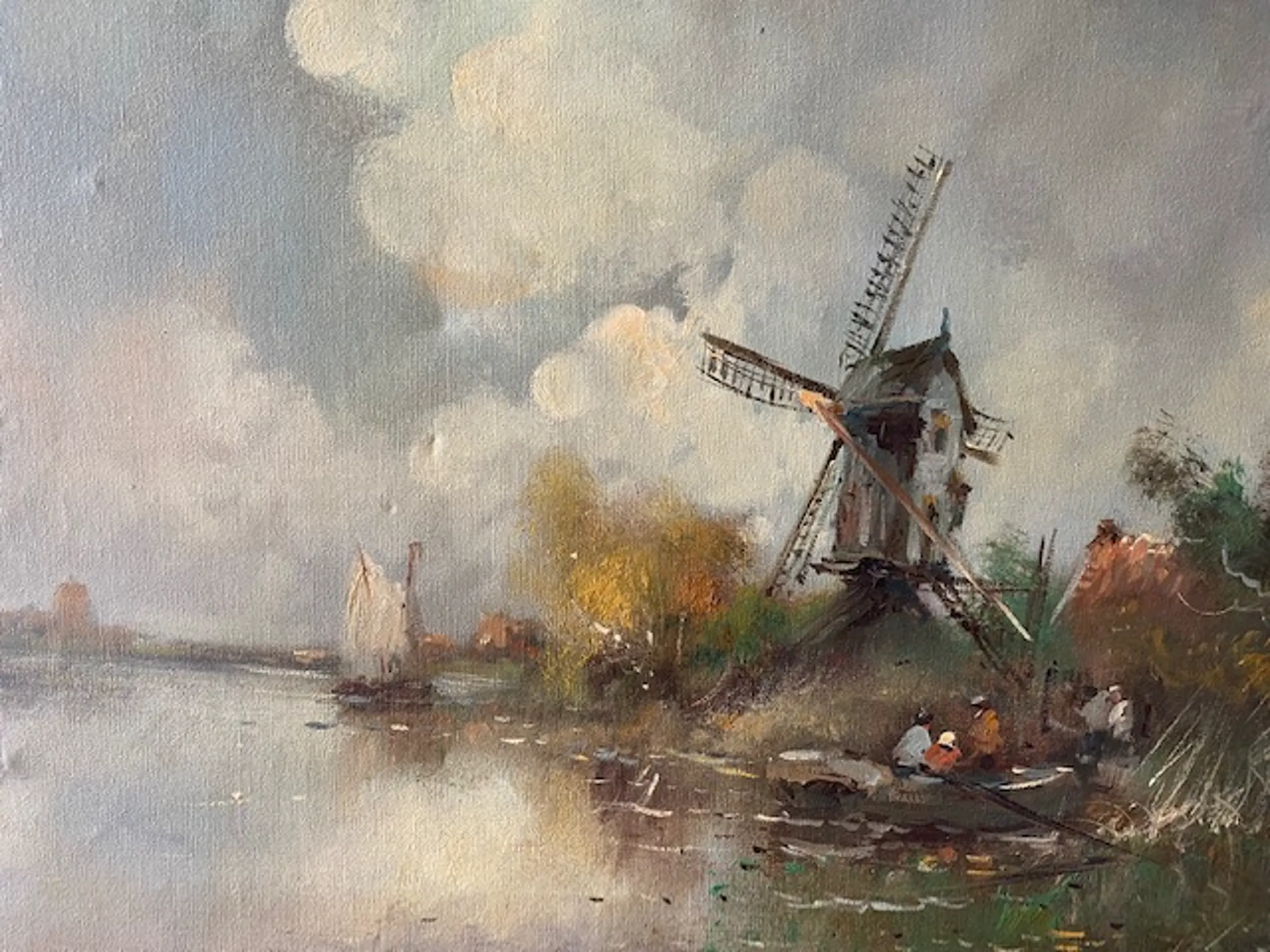 Een typisch Hollands polderlandschap met een houten molen uit het begin van de vorige eeuw. Het doek is niet ingelijst en vertoont gebruiks- en ouderdomssporen.