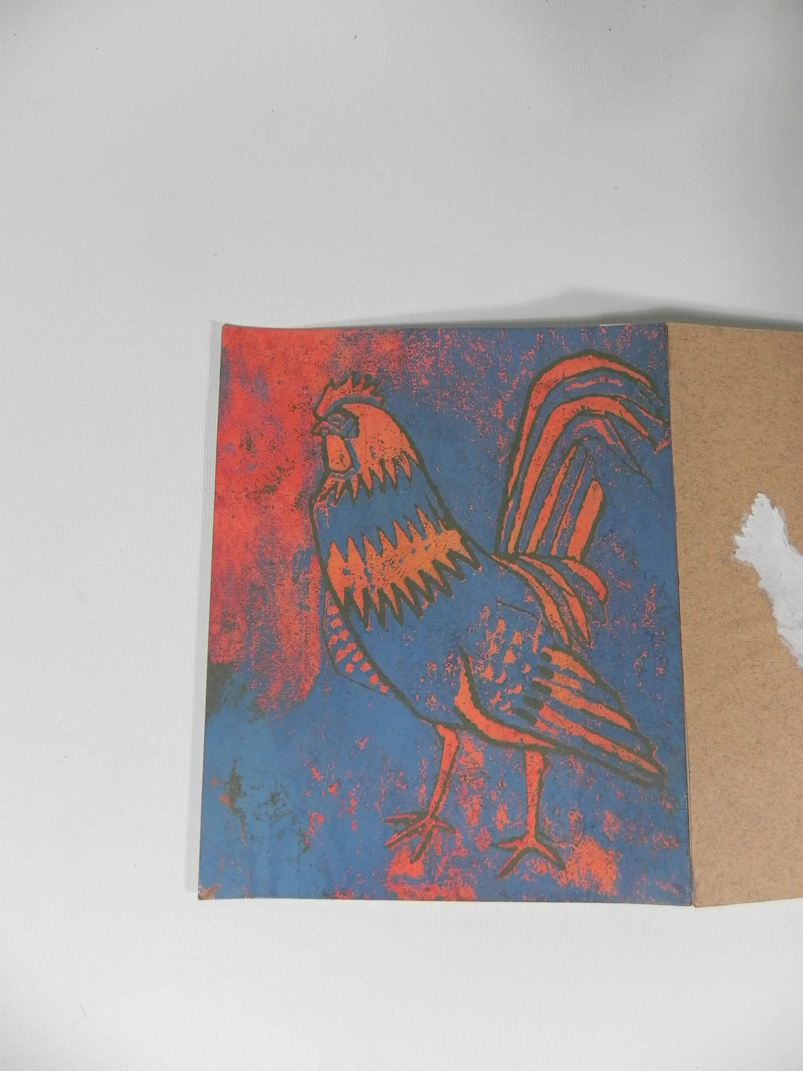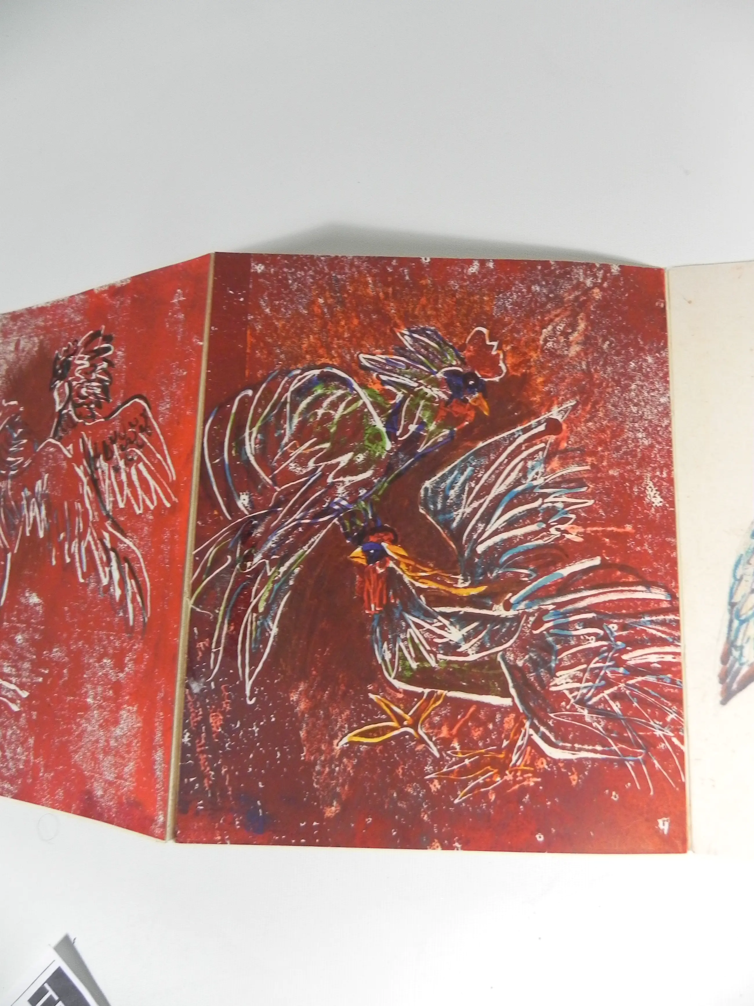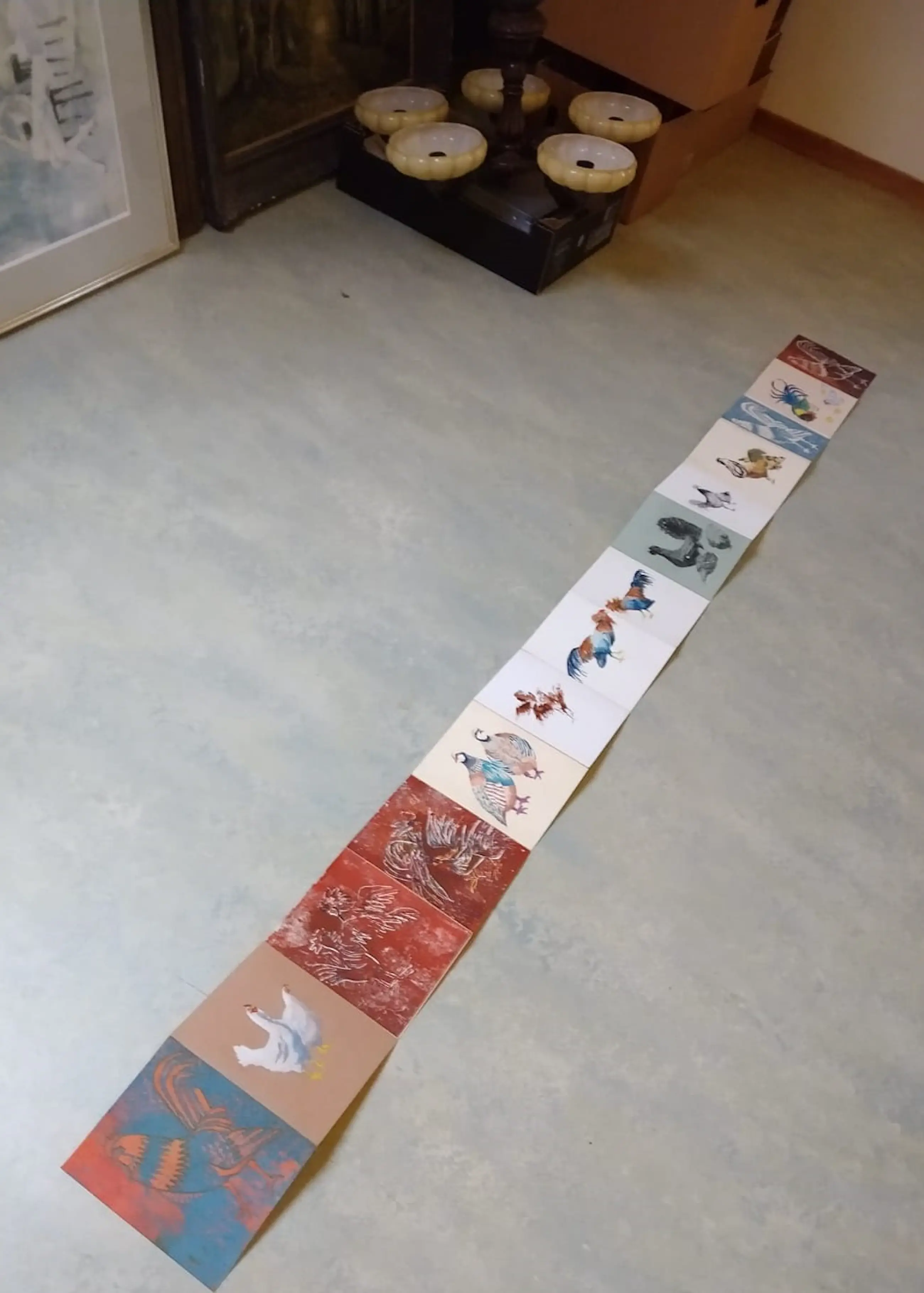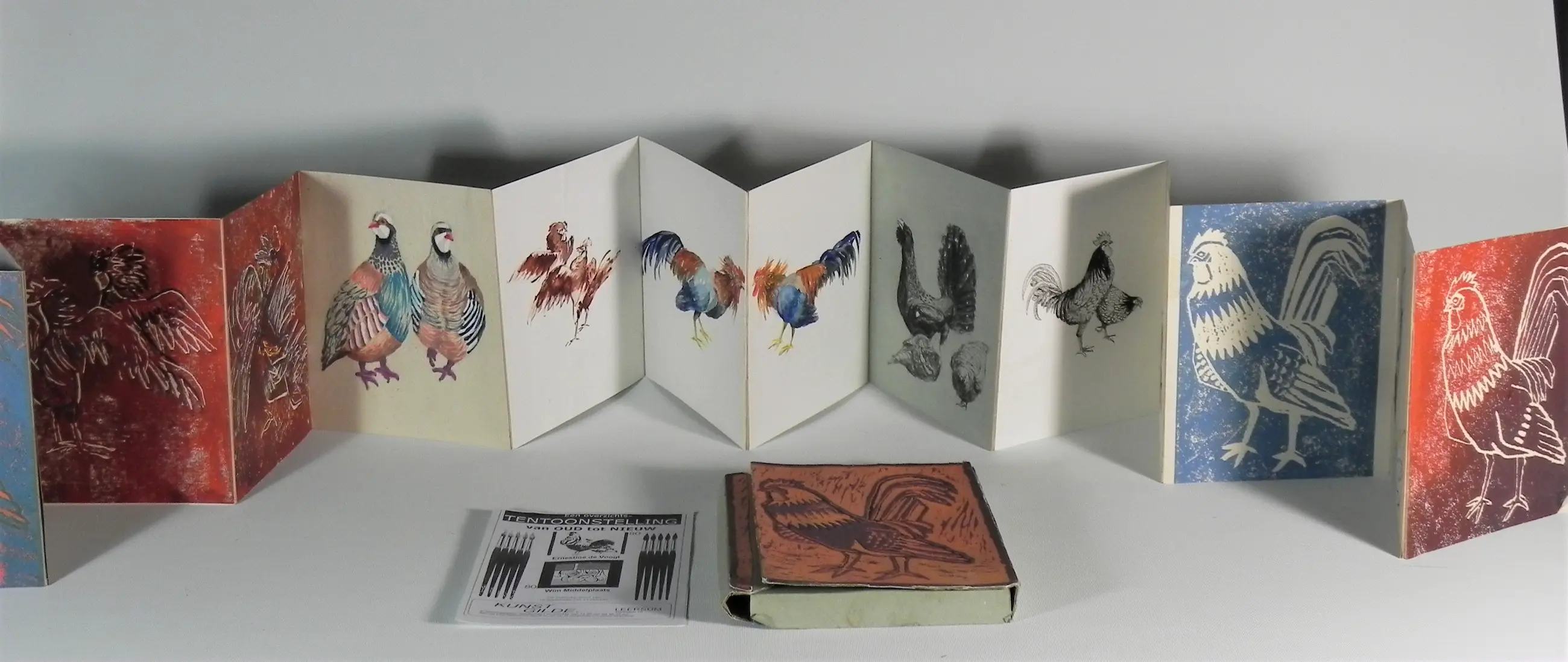 Alles op kartonnen delen geplakt die met elkaar verbonden zijn en tot één groot opvouwbaar schilderij zijn verwerkt. Opgevouwen past het in een speciale kartonnen doosje.