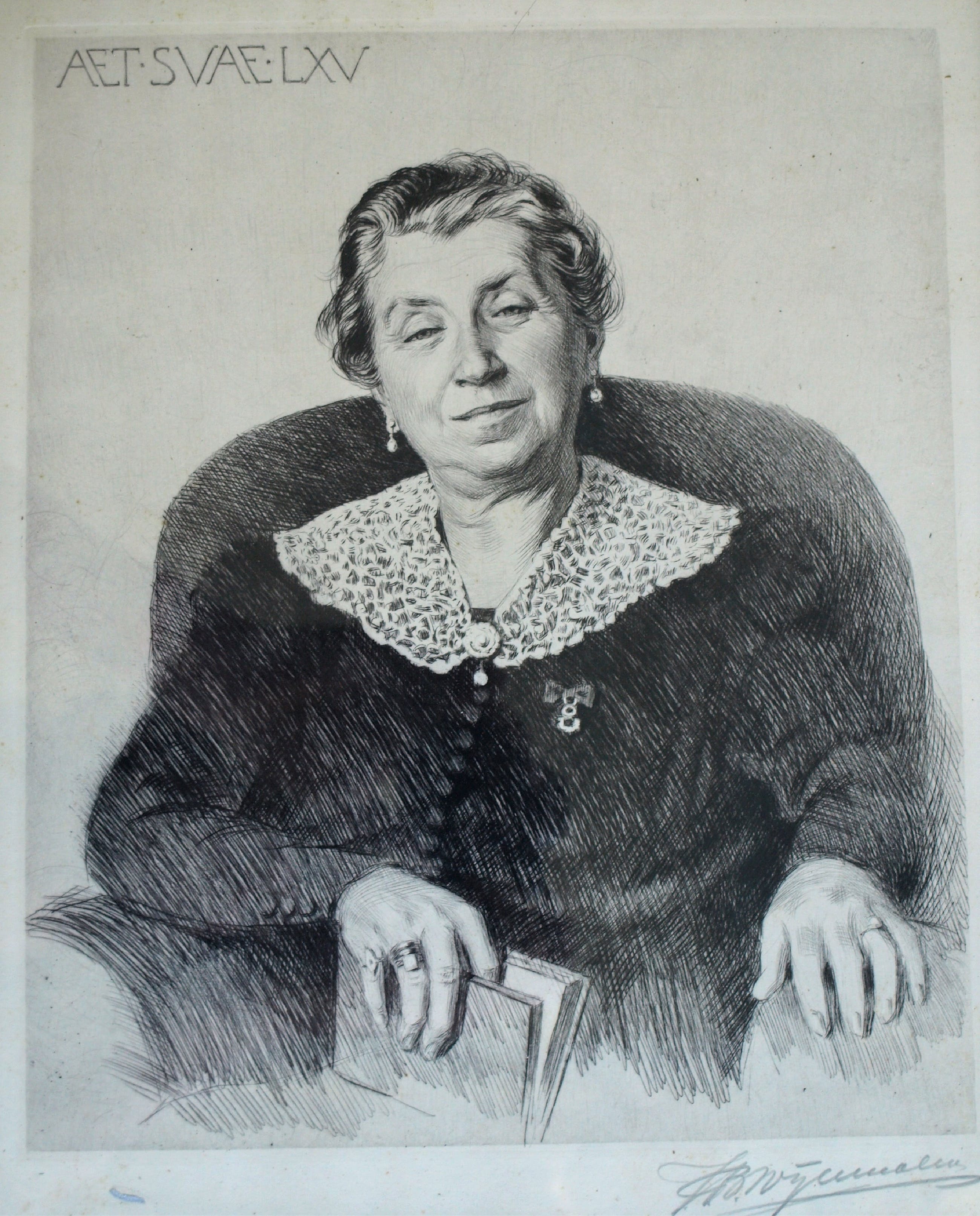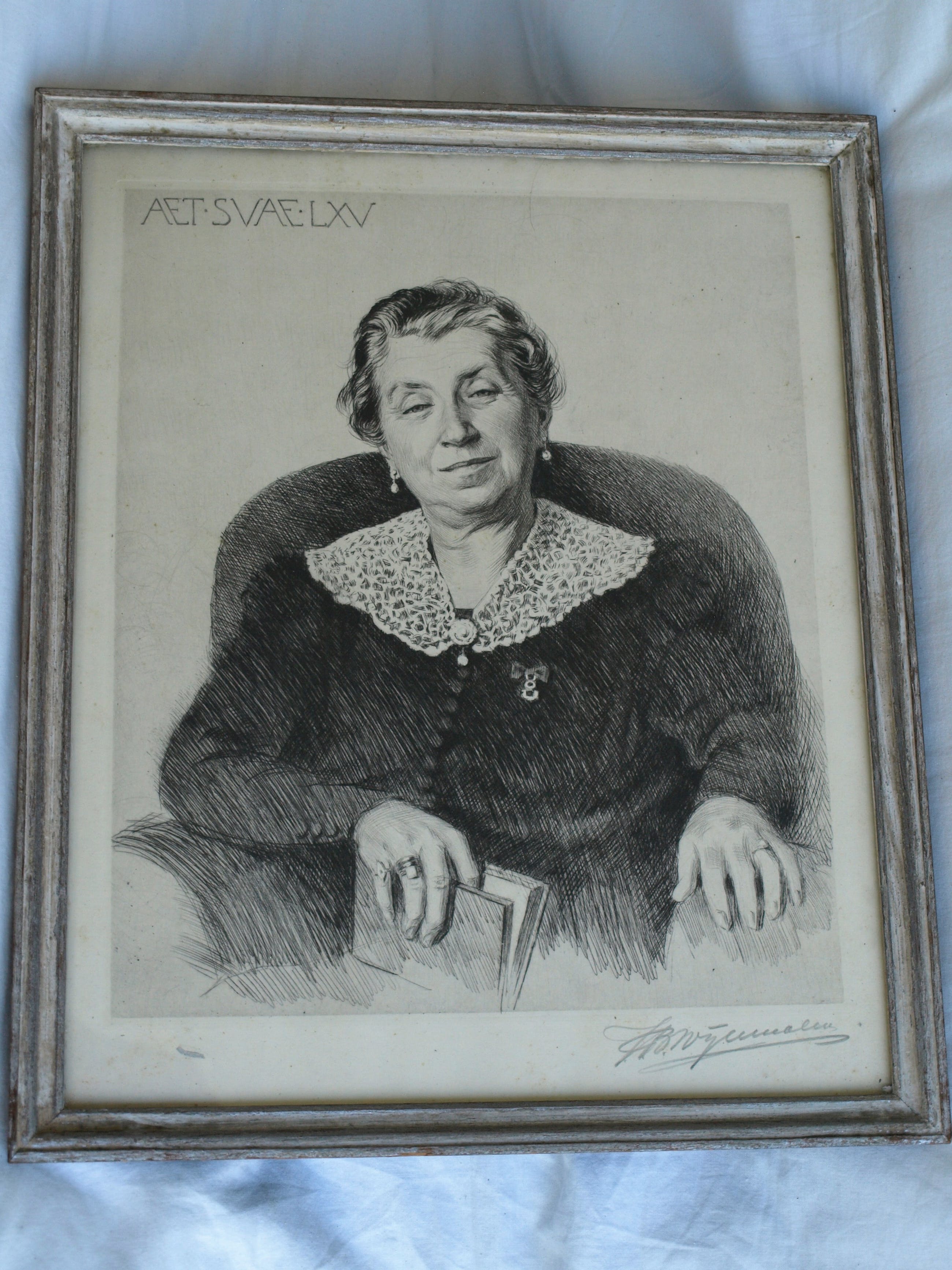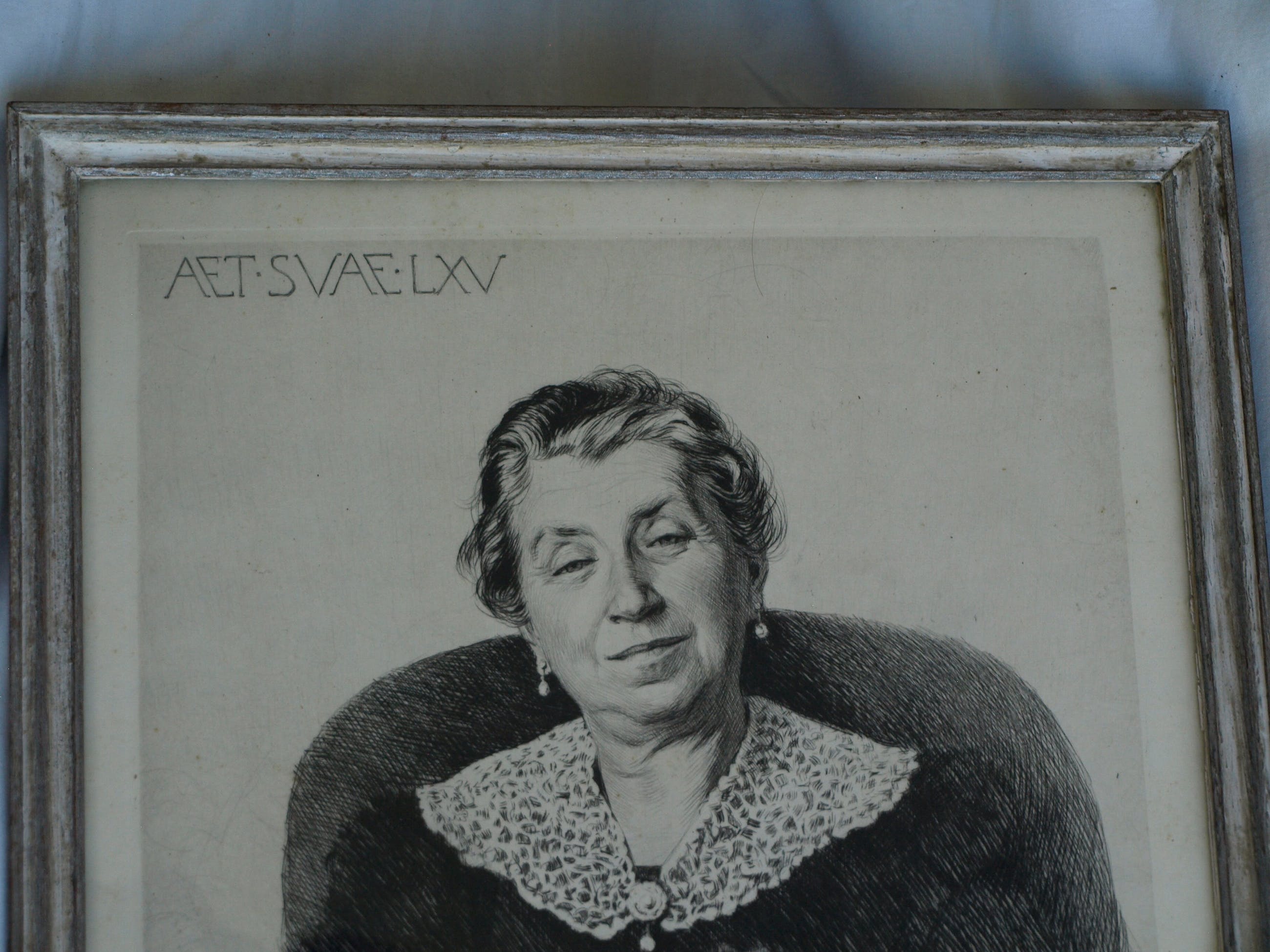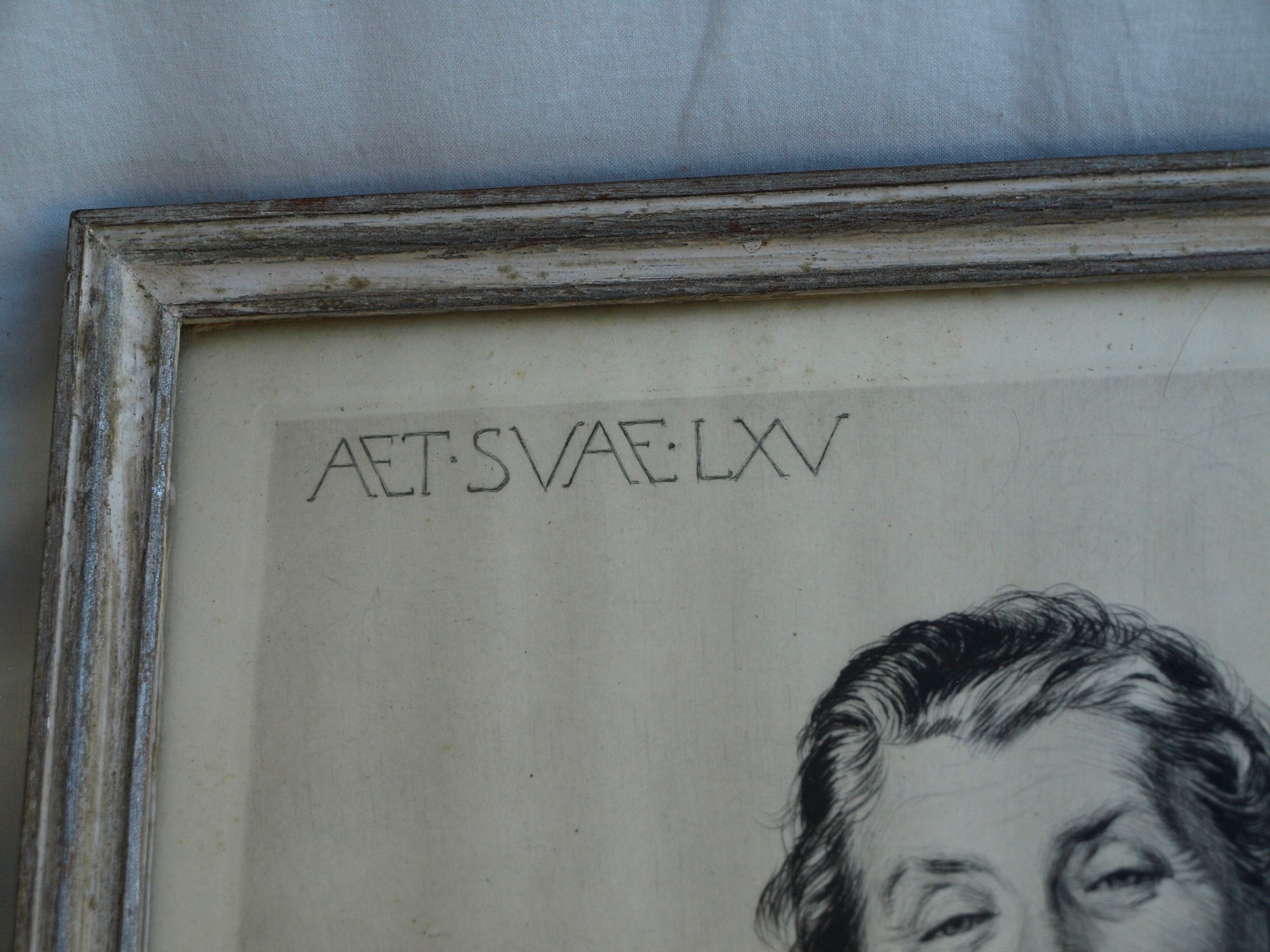 Een ets van een ons onbekende kunstenaar met een portret van een vrouw, gemaakt ter gelegenheid van haar 65e verjaardag (“aetatis suae” = ‘op de leeftijd van’. LXV = 65 in het Latijn).