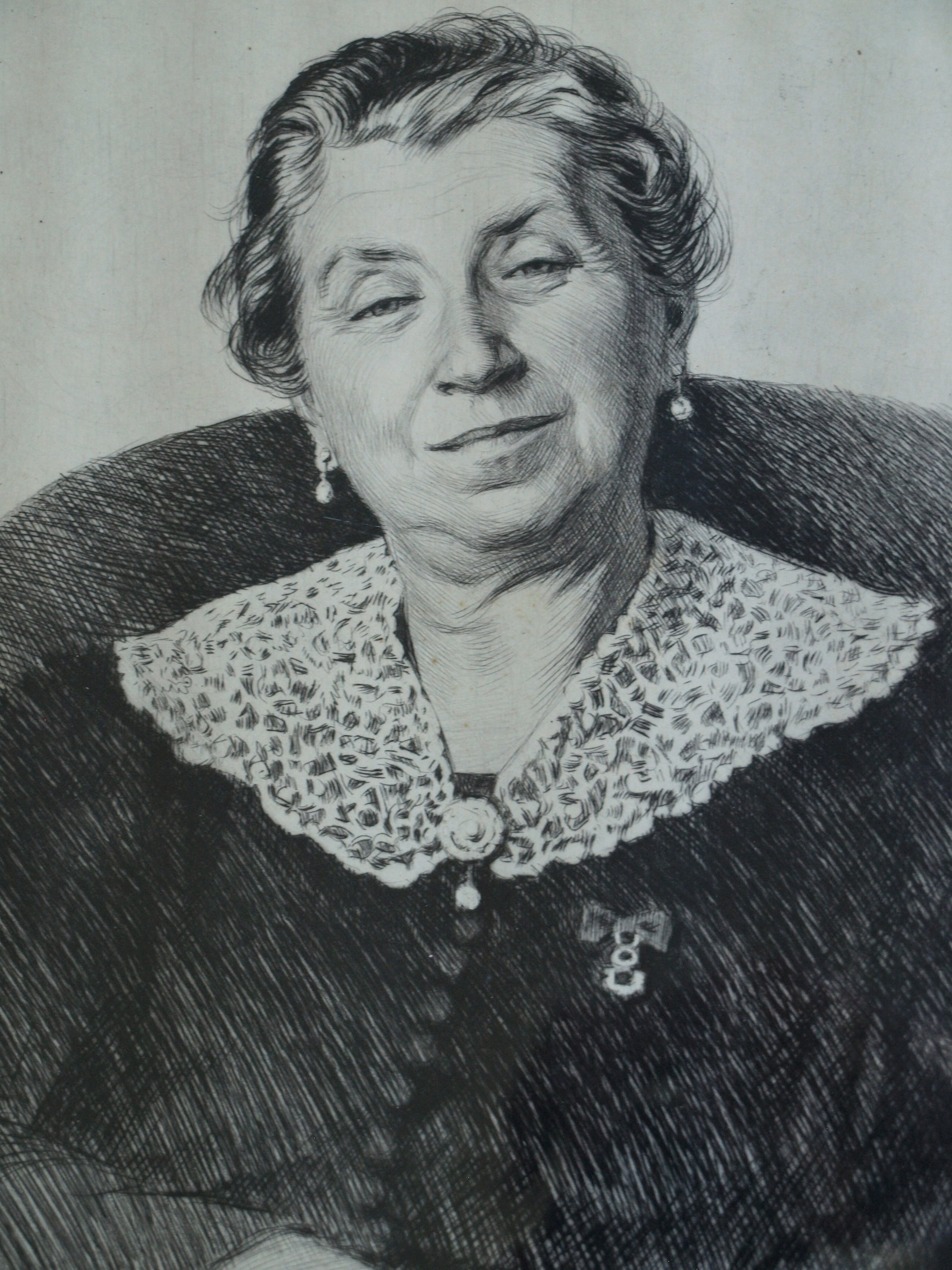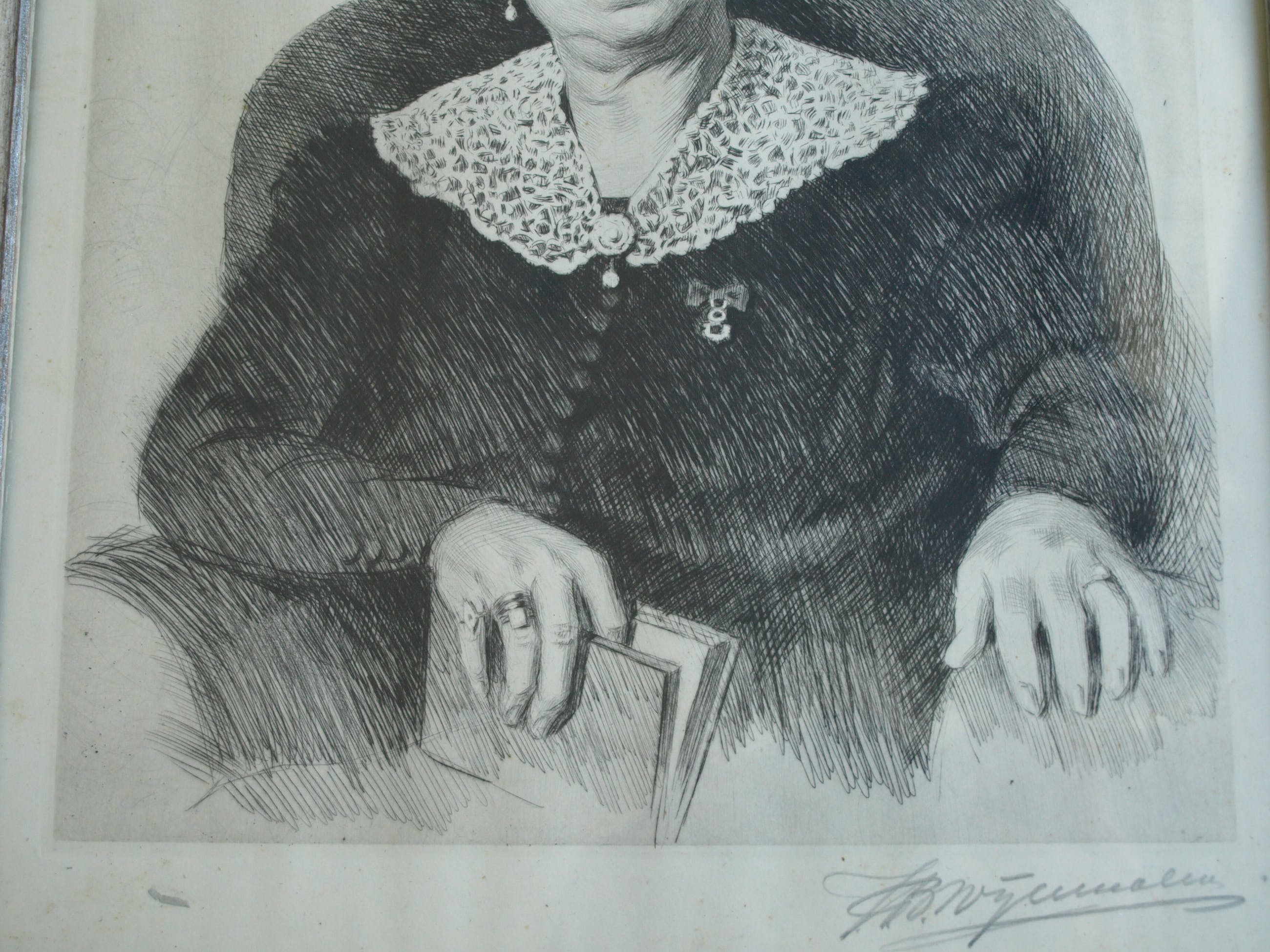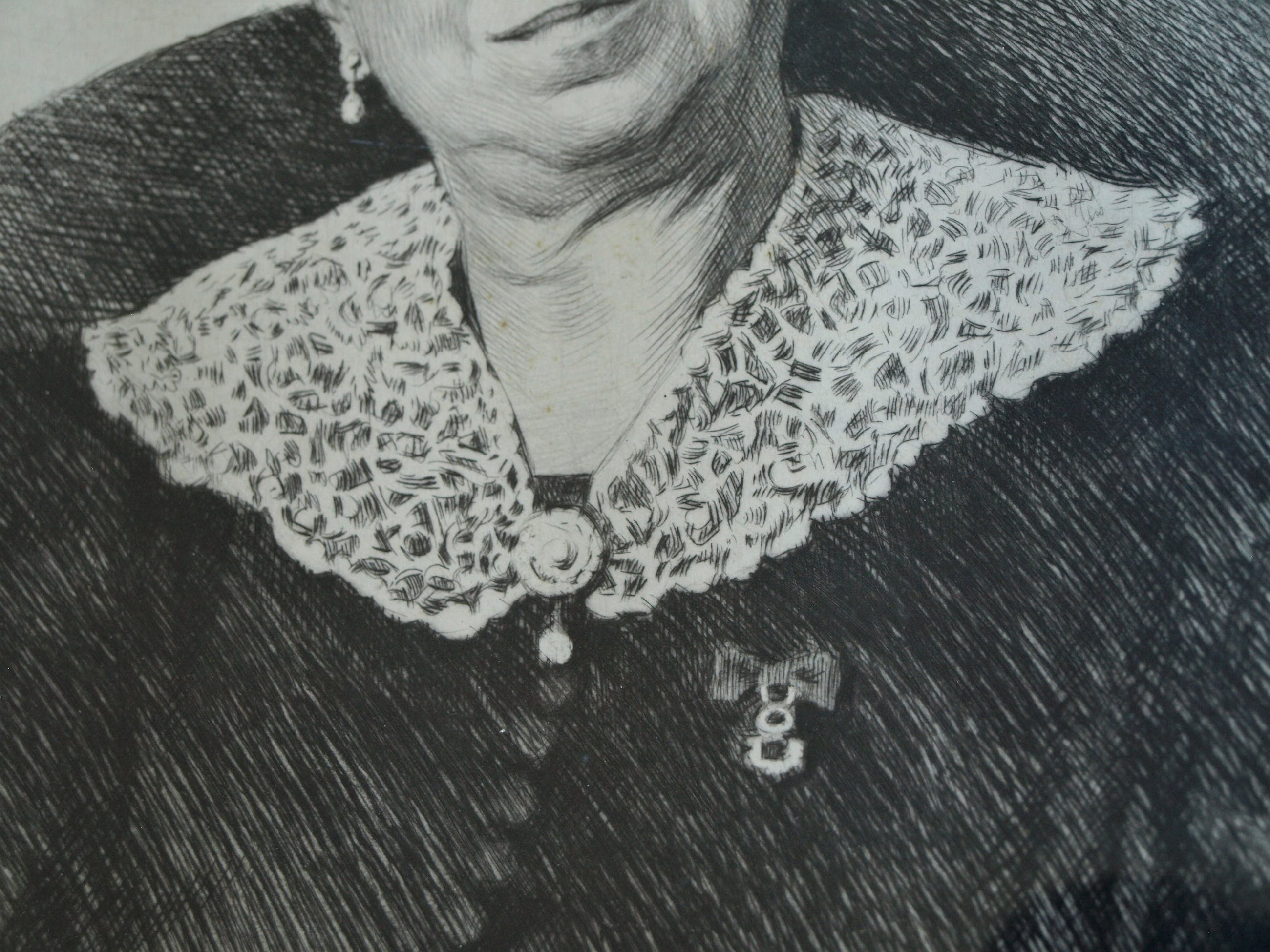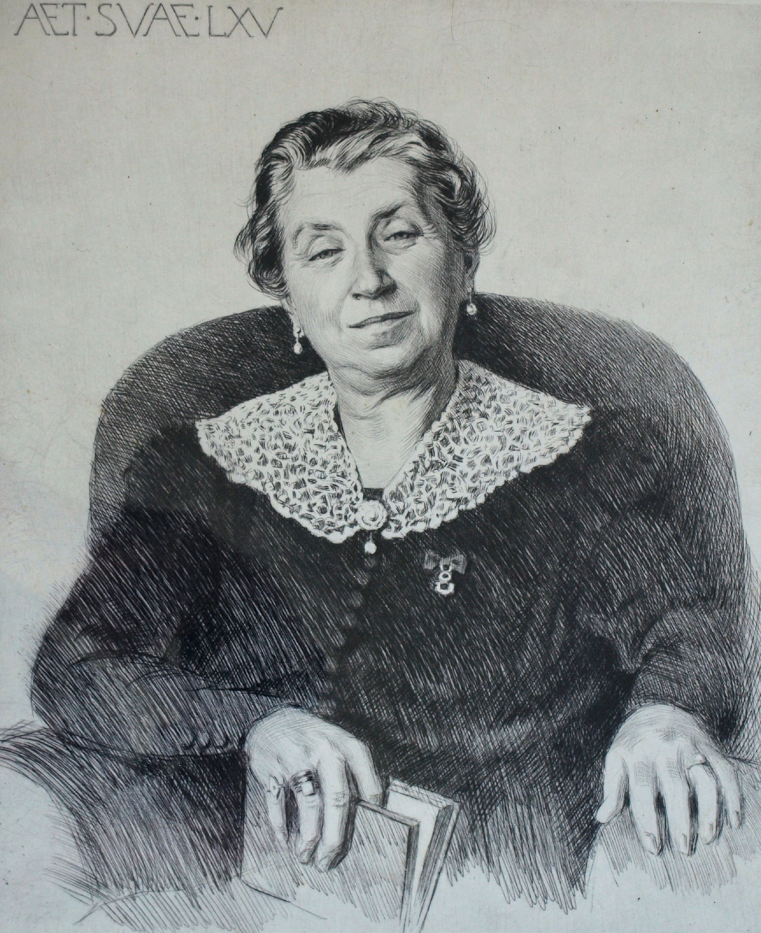 Een ets van een ons onbekende kunstenaar met een portret van een vrouw, gemaakt ter gelegenheid van haar 65e verjaardag (“aetatis suae” = ‘op de leeftijd van’. LXV = 65 in het Latijn).