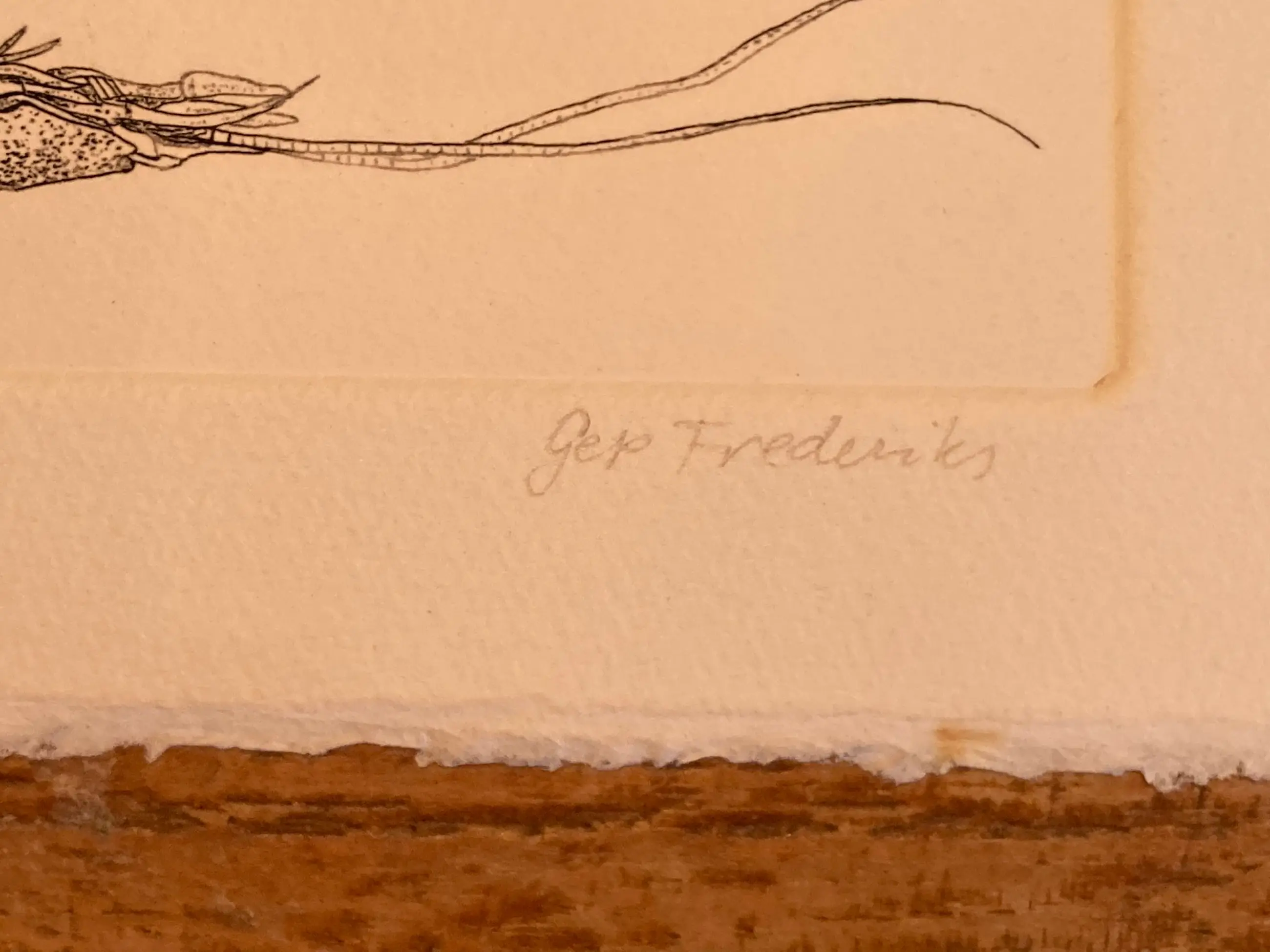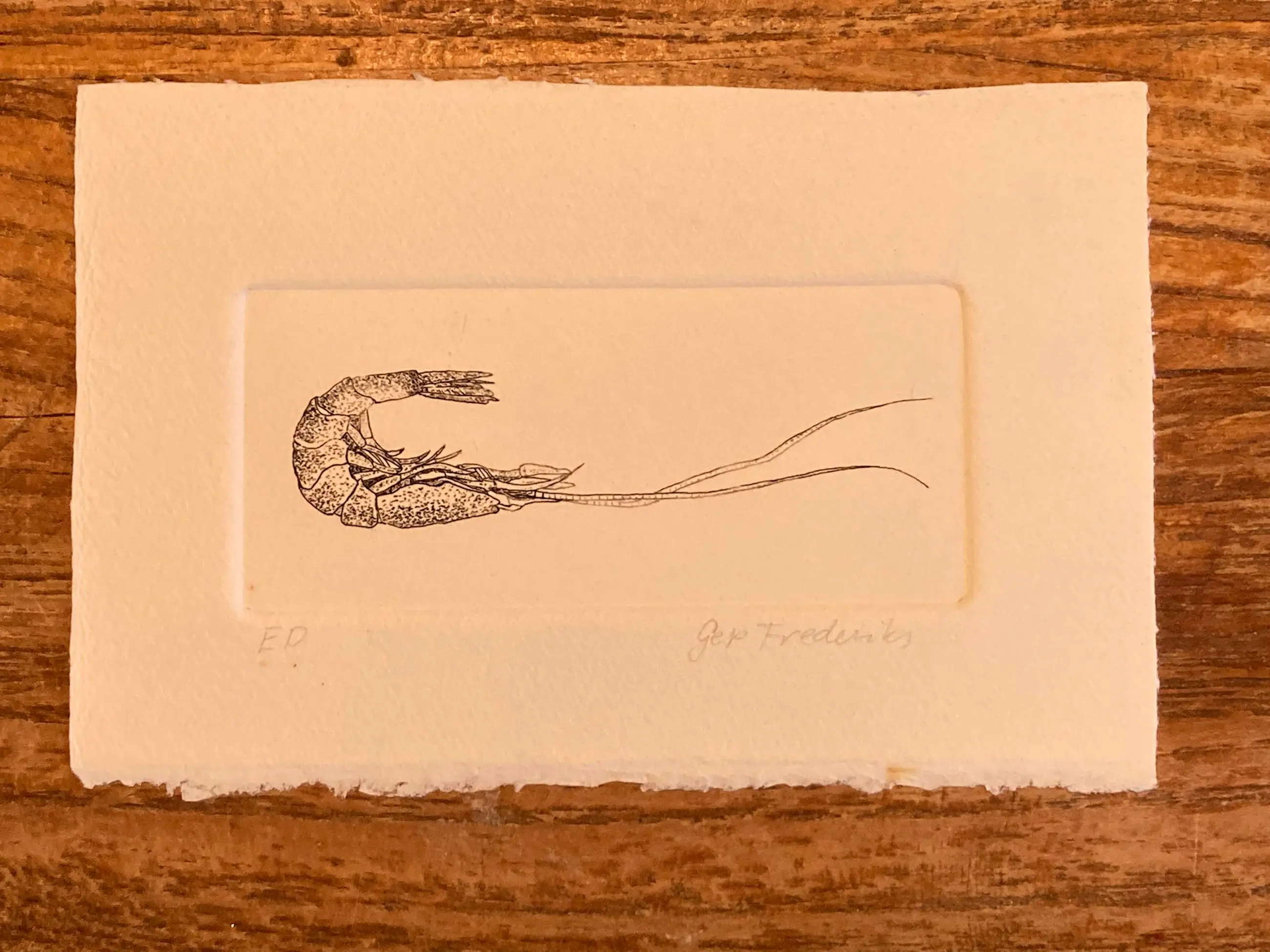 Kleine Ets (15 x 10cm) van de Oosterbeekse Kunstenaar Gep Frederiks. Betreft een eigen druk (E.D.) Betreft een druk van een realistische Gamba / Garnaal.