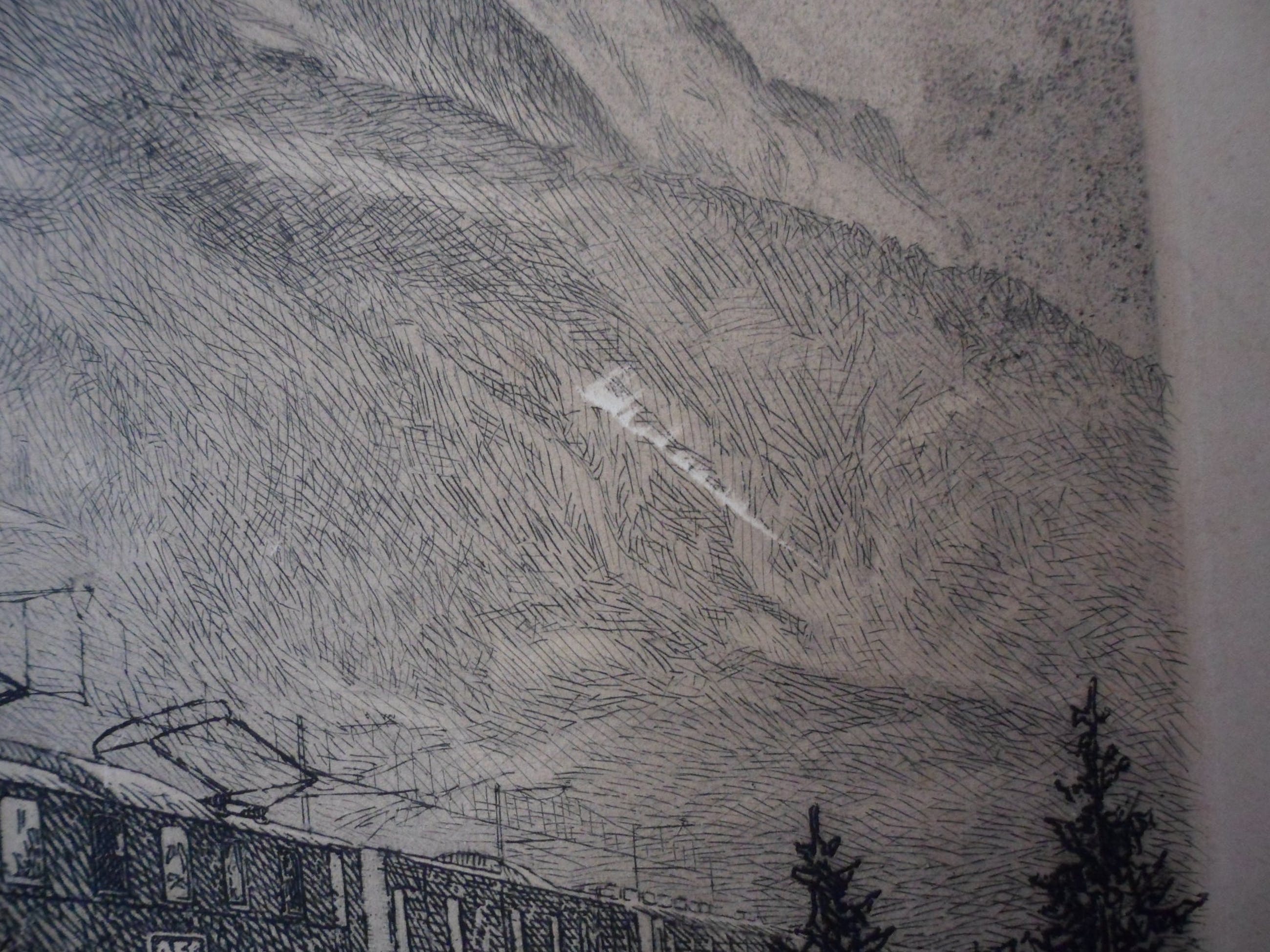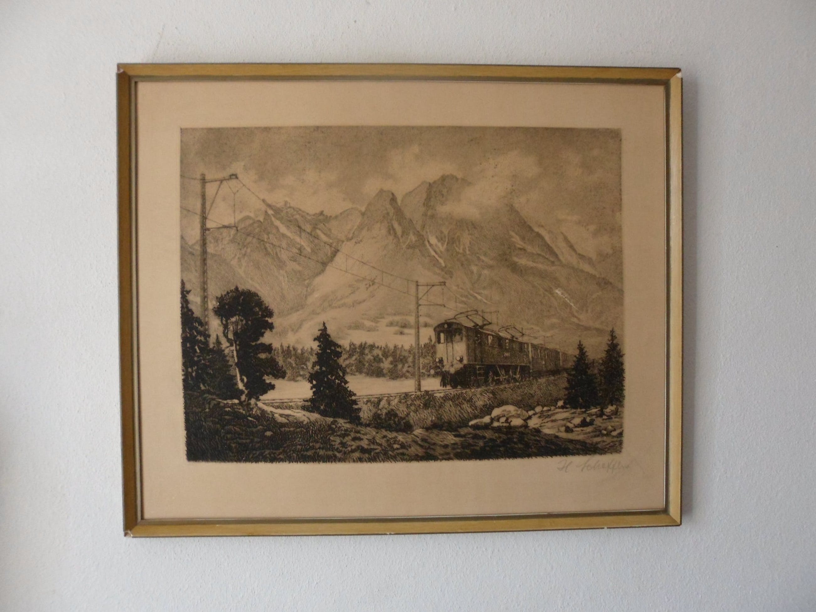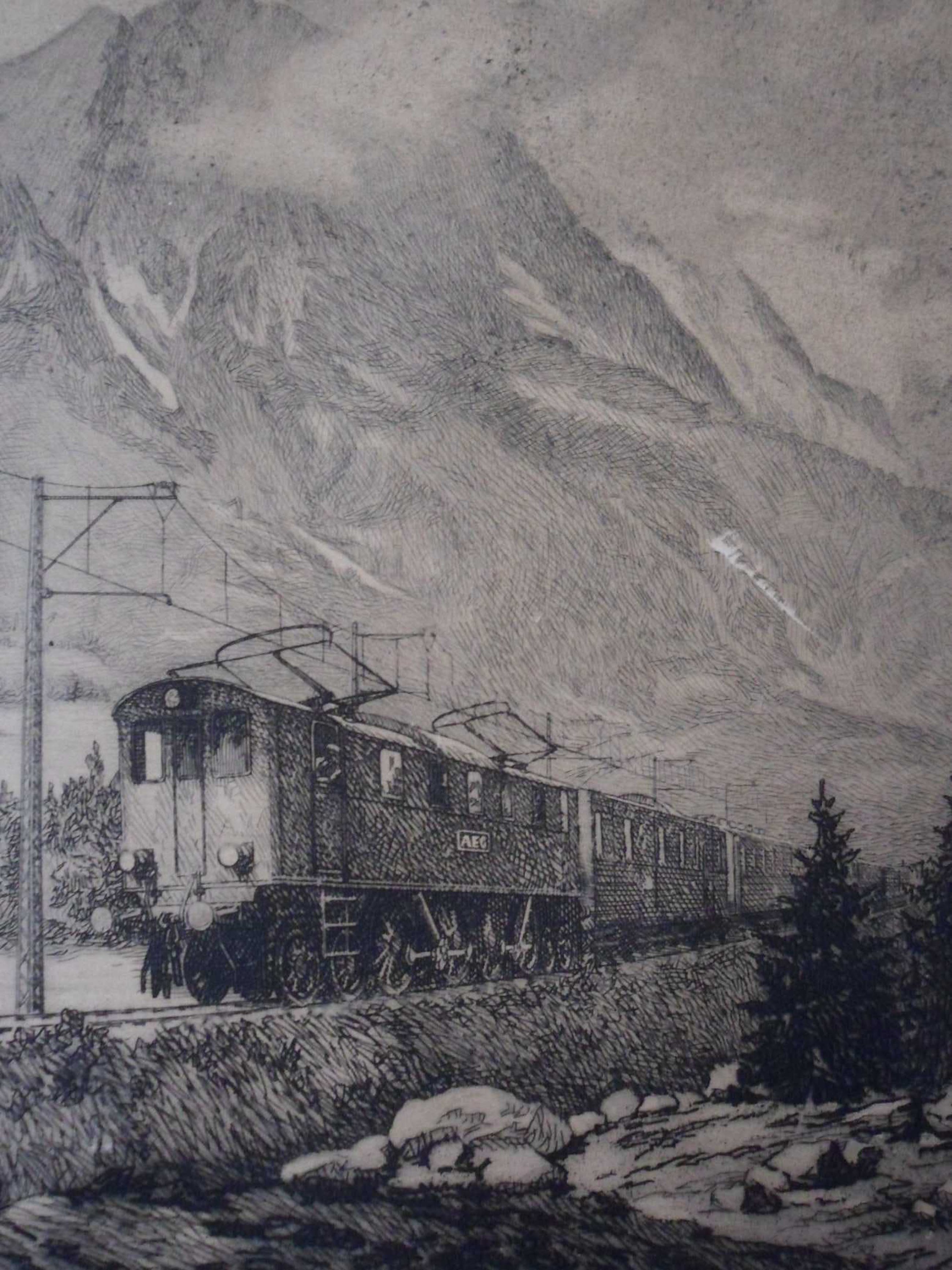 Een mooie grote ets van een trein in een berglandschap. Jammer van het krasje.
