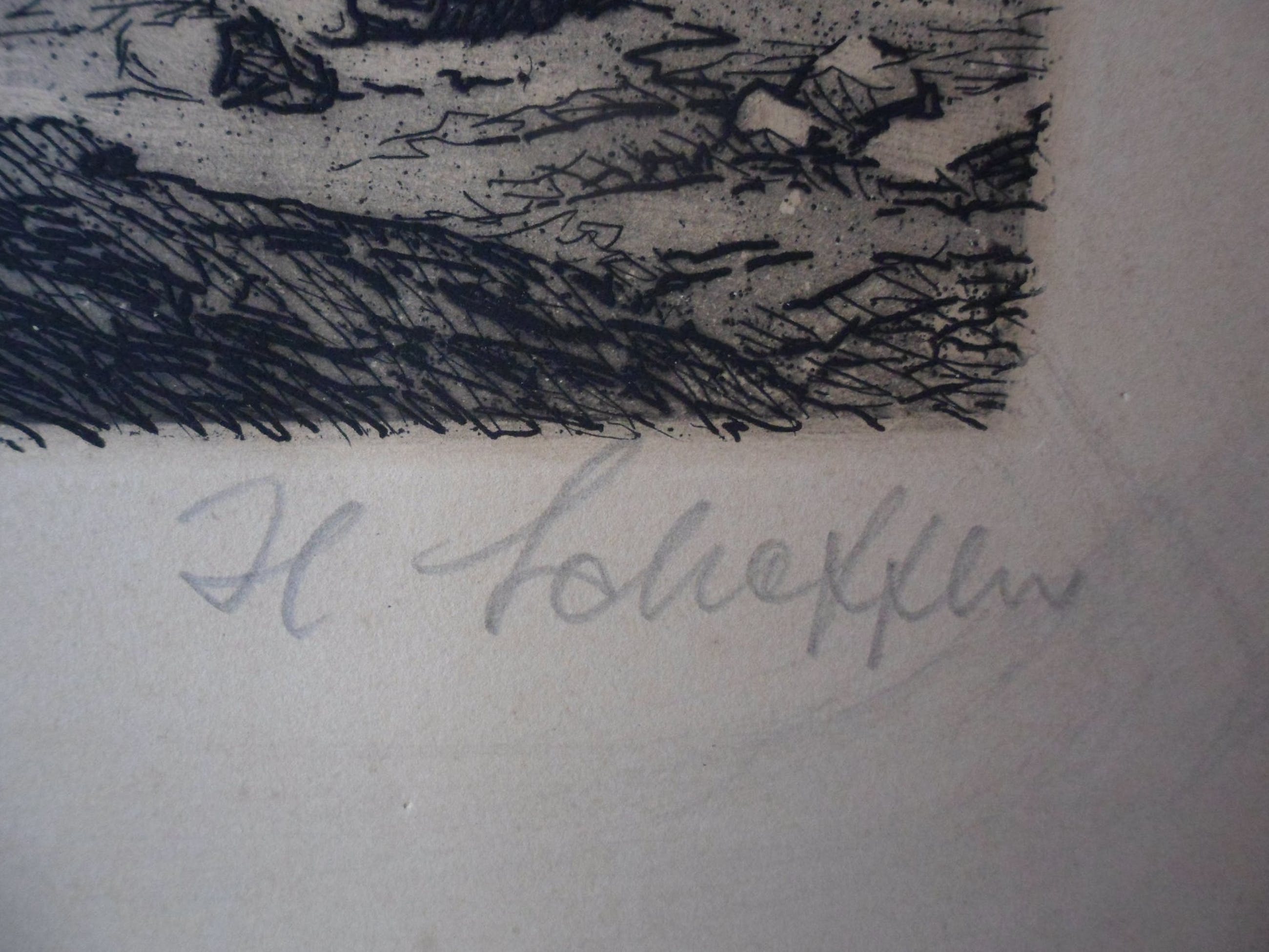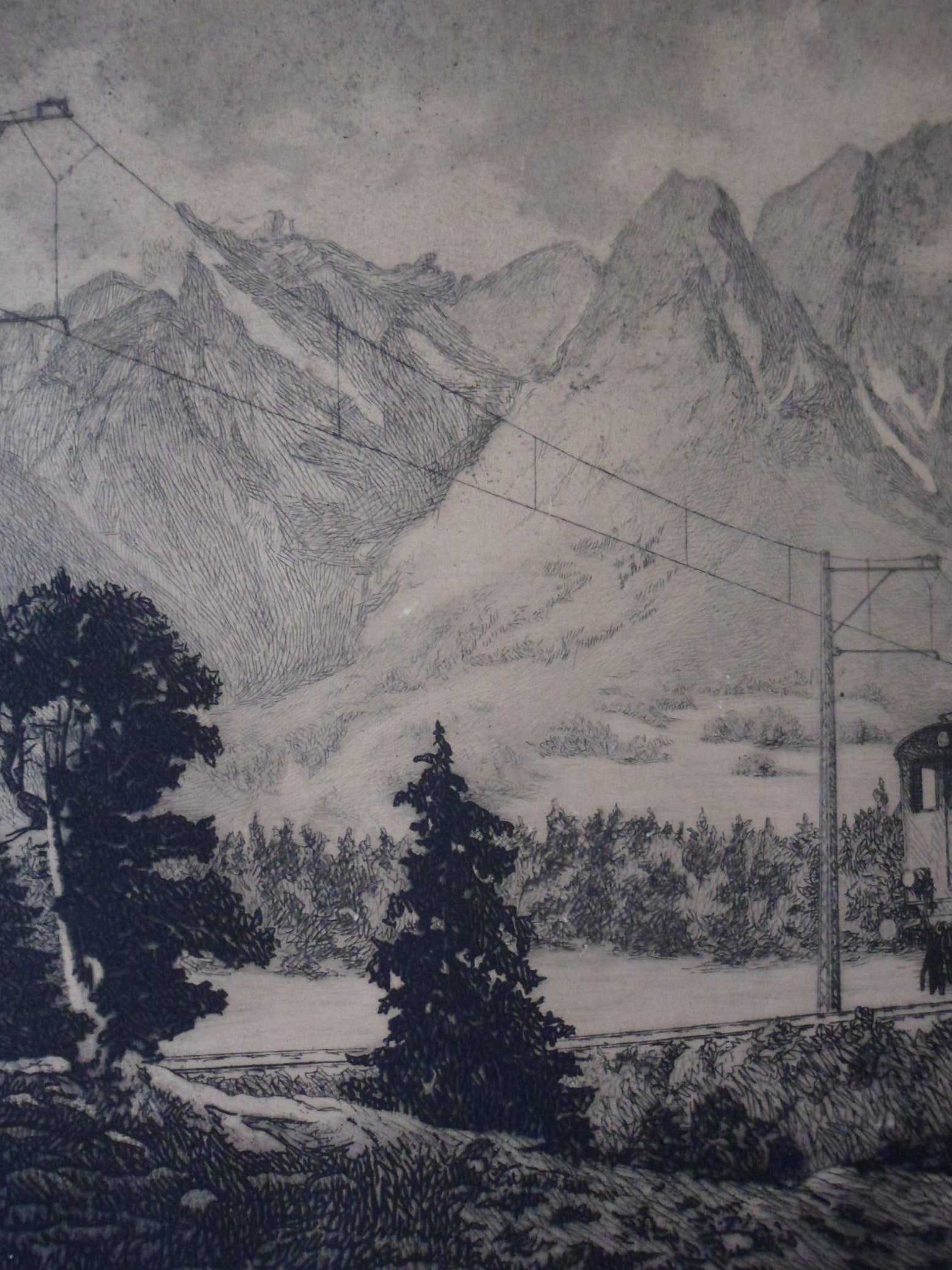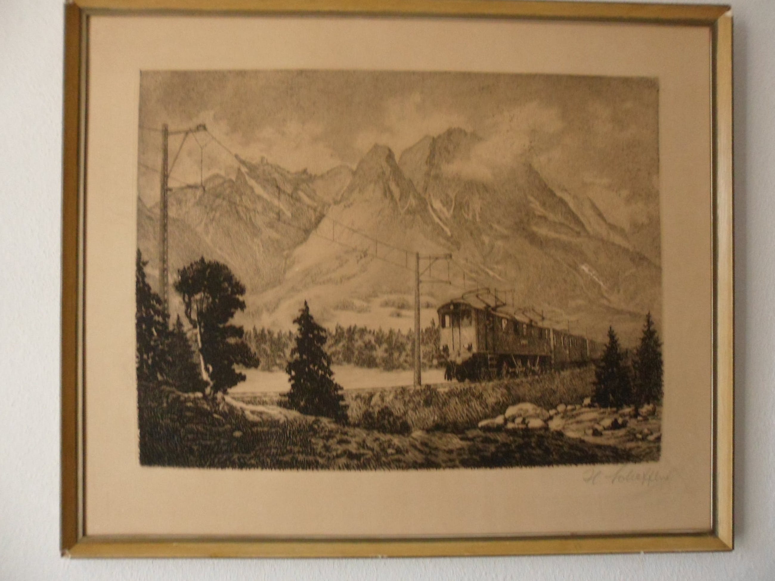 Een mooie grote ets van een trein in een berglandschap. Jammer van het krasje.