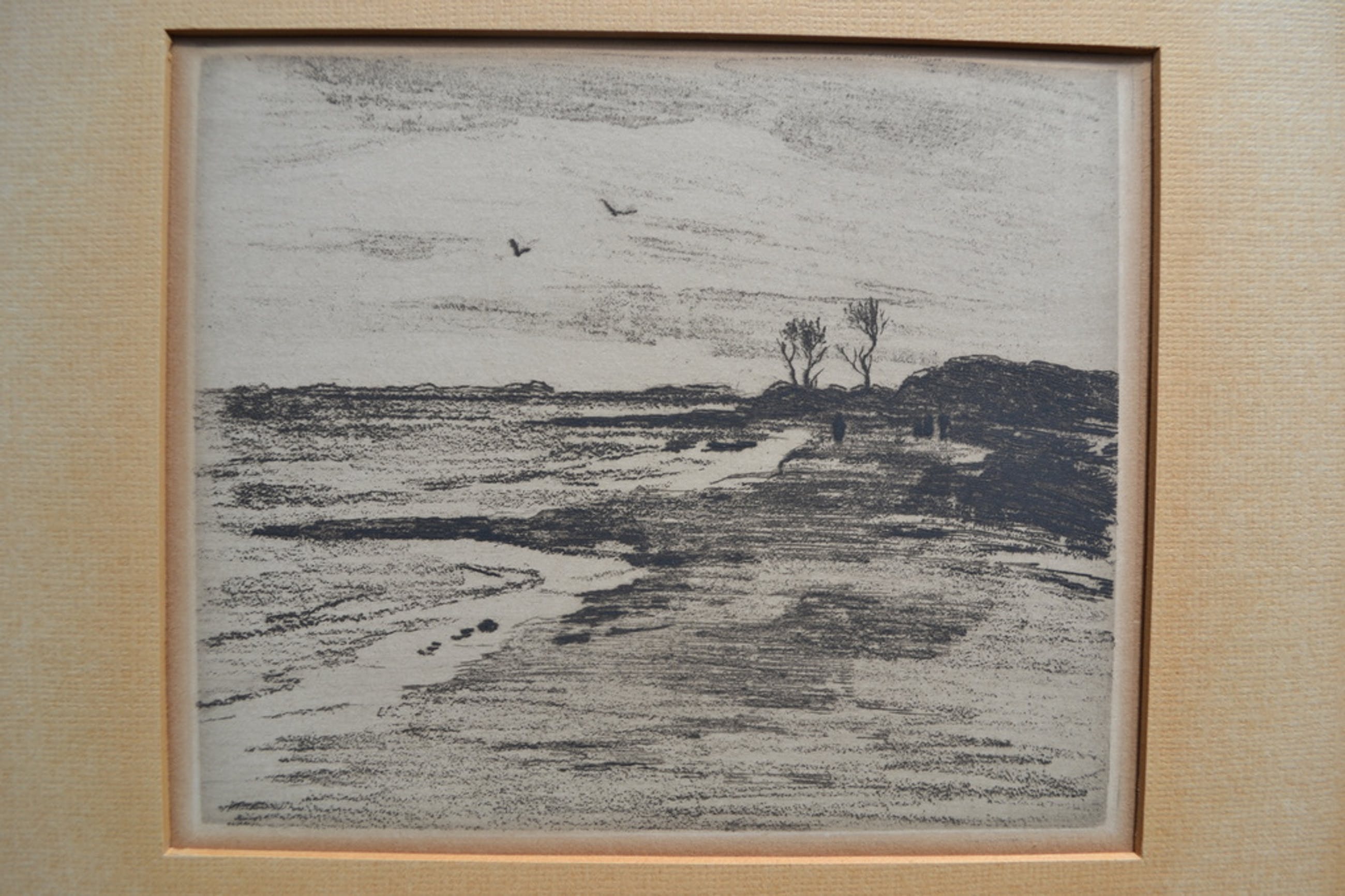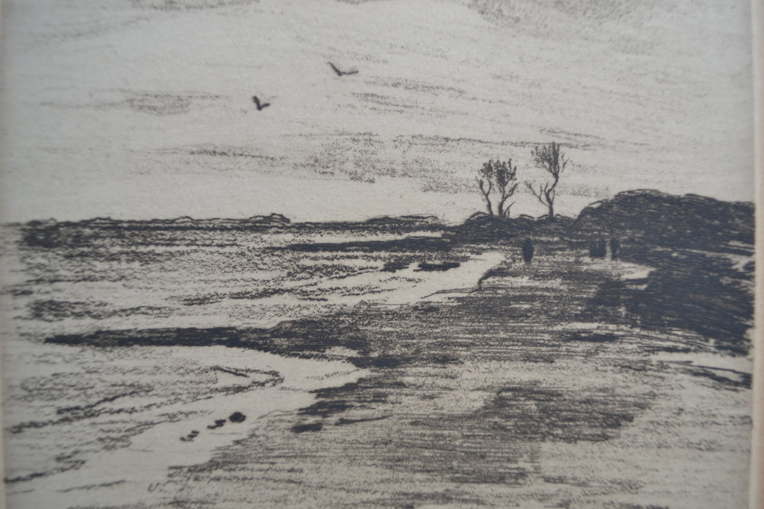 Betreft sfeervolle ets van landschapje met in de verte enkele wanderlaars. Helaas niet gesigneerd, wel in goede staat. Afmetingen ets 17x14 en van passe-partout 28x24cm.