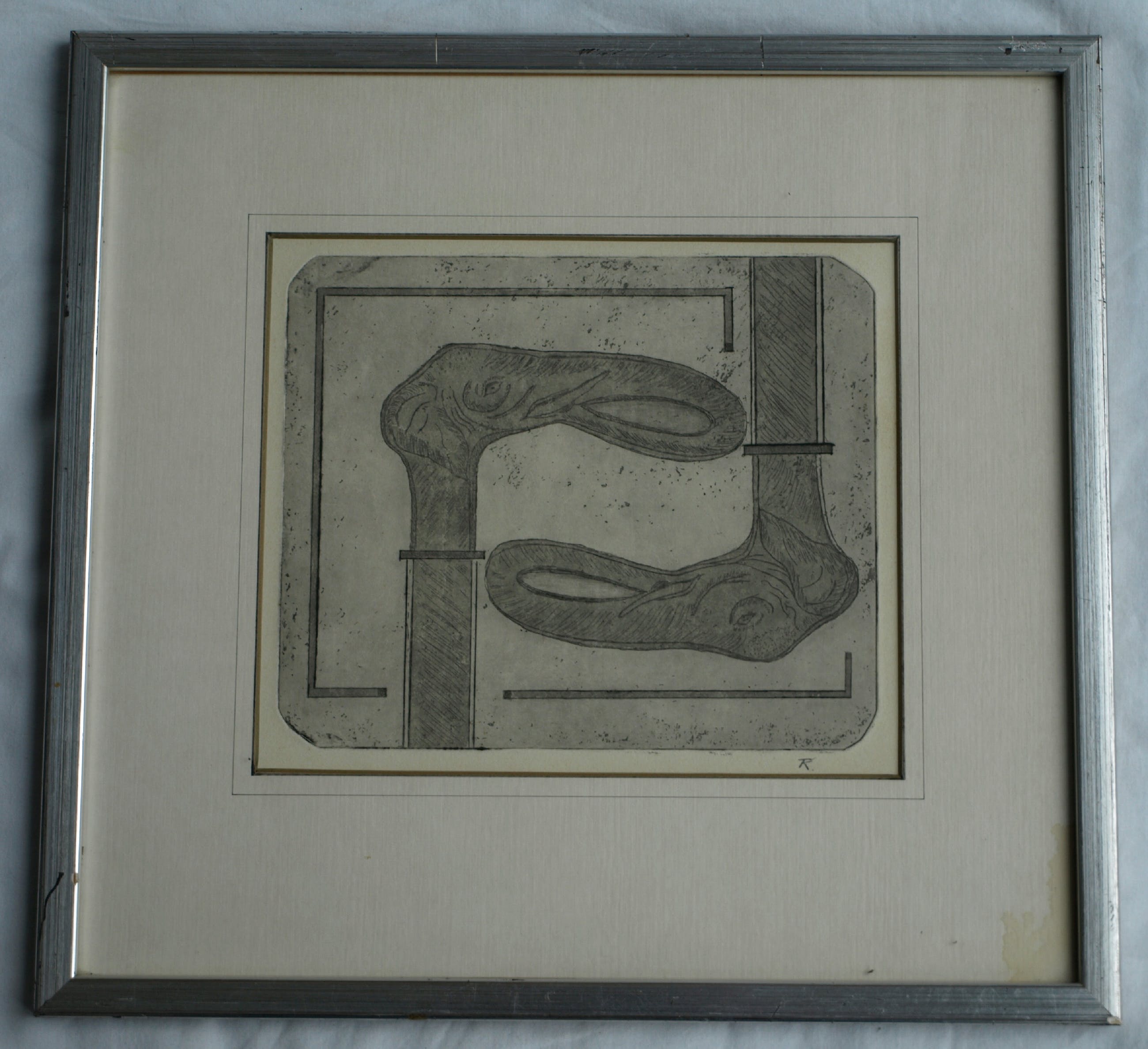 Conditie: De ets is in zeer goede staat. De lijst heeft slijtplekjes en het passe-partout heeft een vlek rechtsonder.