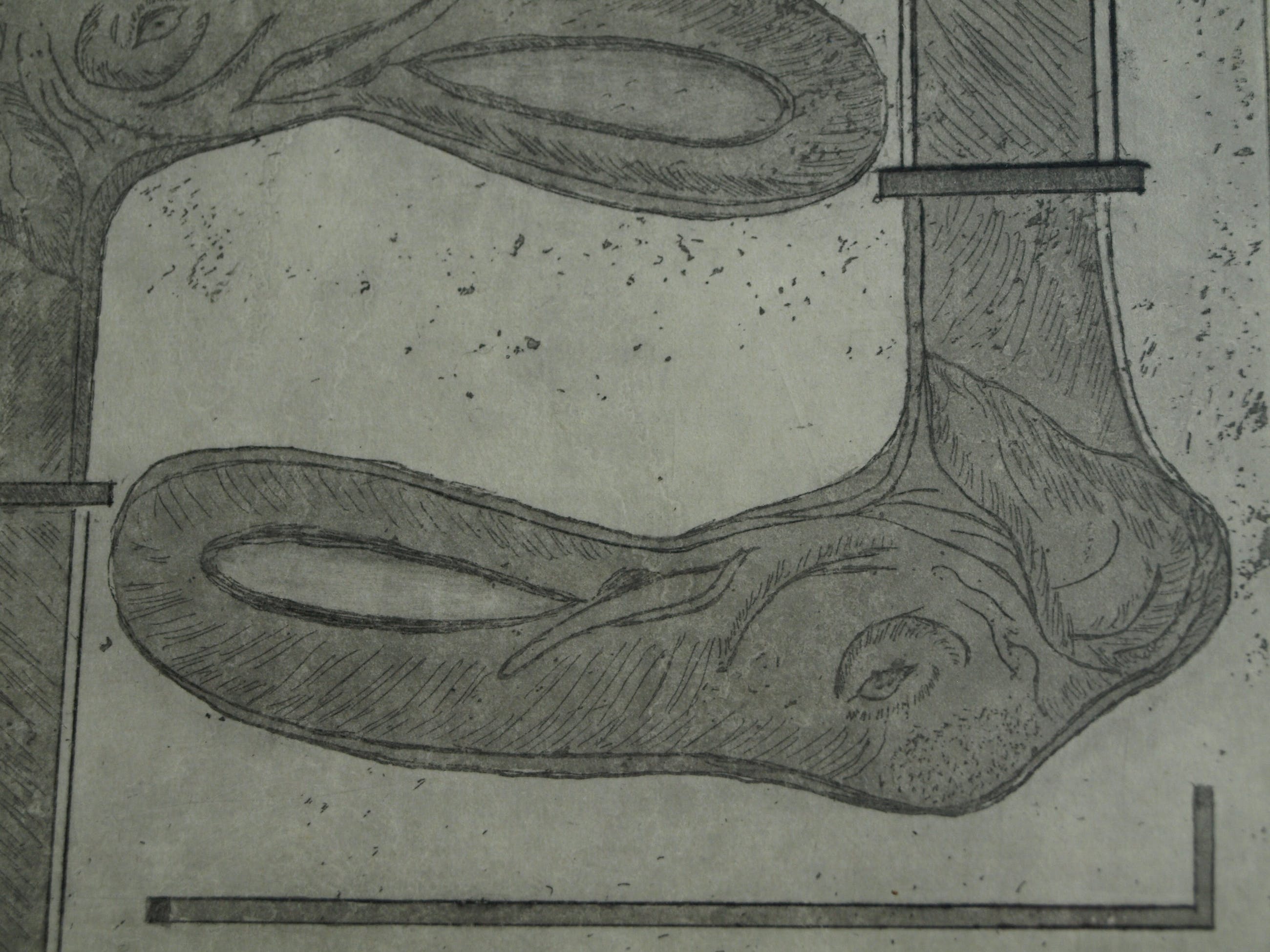 De ets is in zeer goede staat. De lijst heeft slijtplekjes en het passe-partout heeft een vlek rechtsonder. | |||