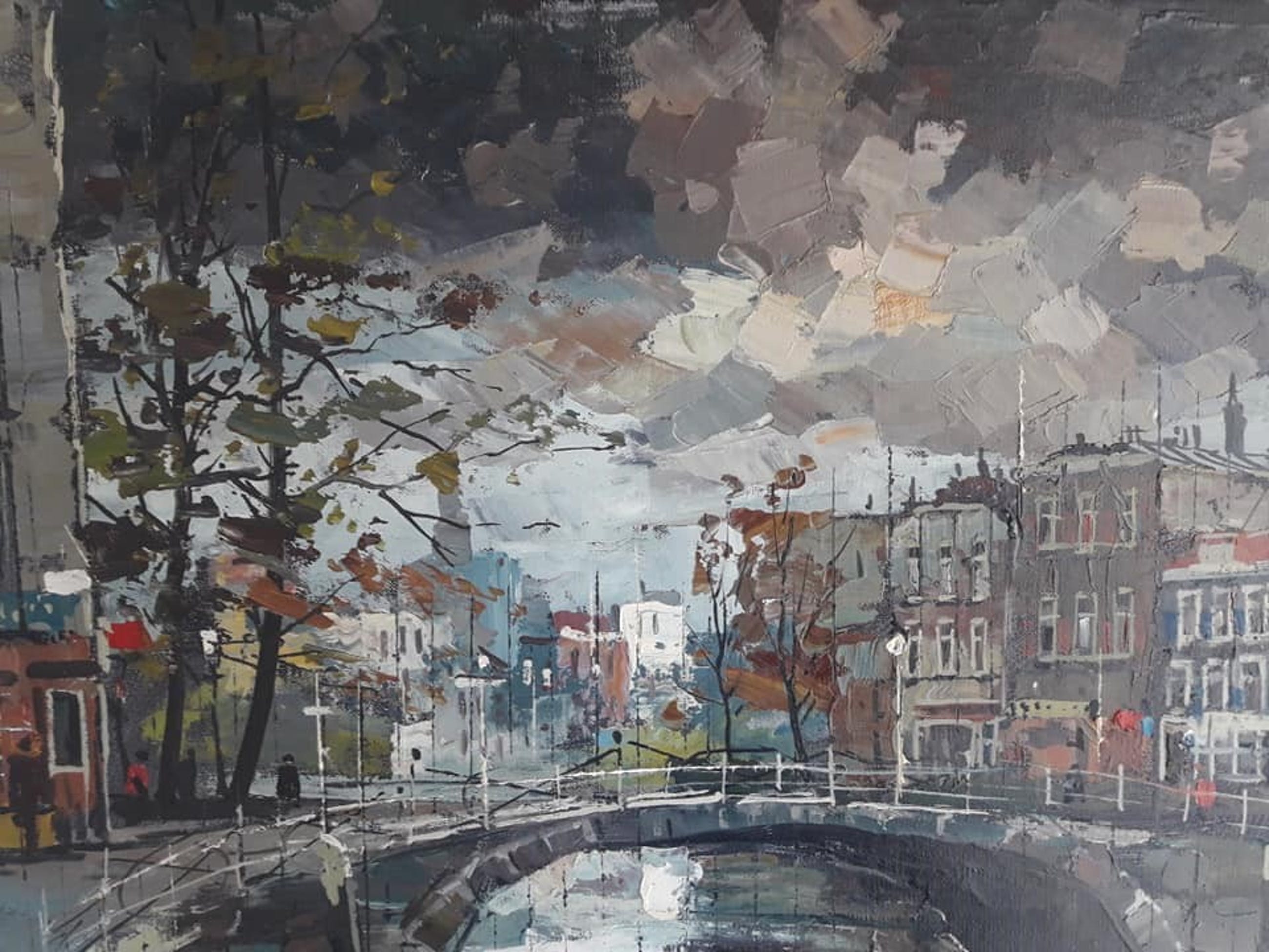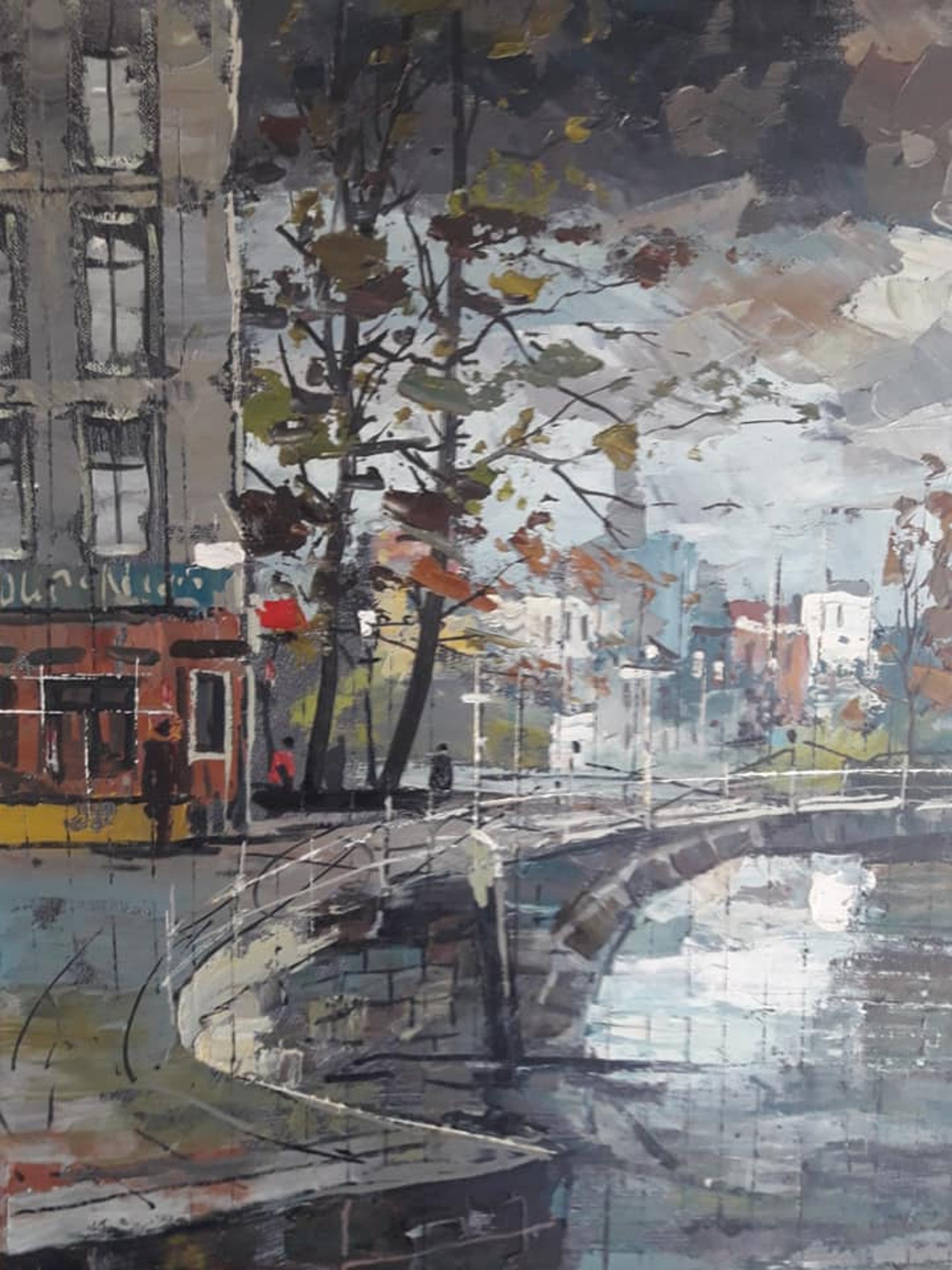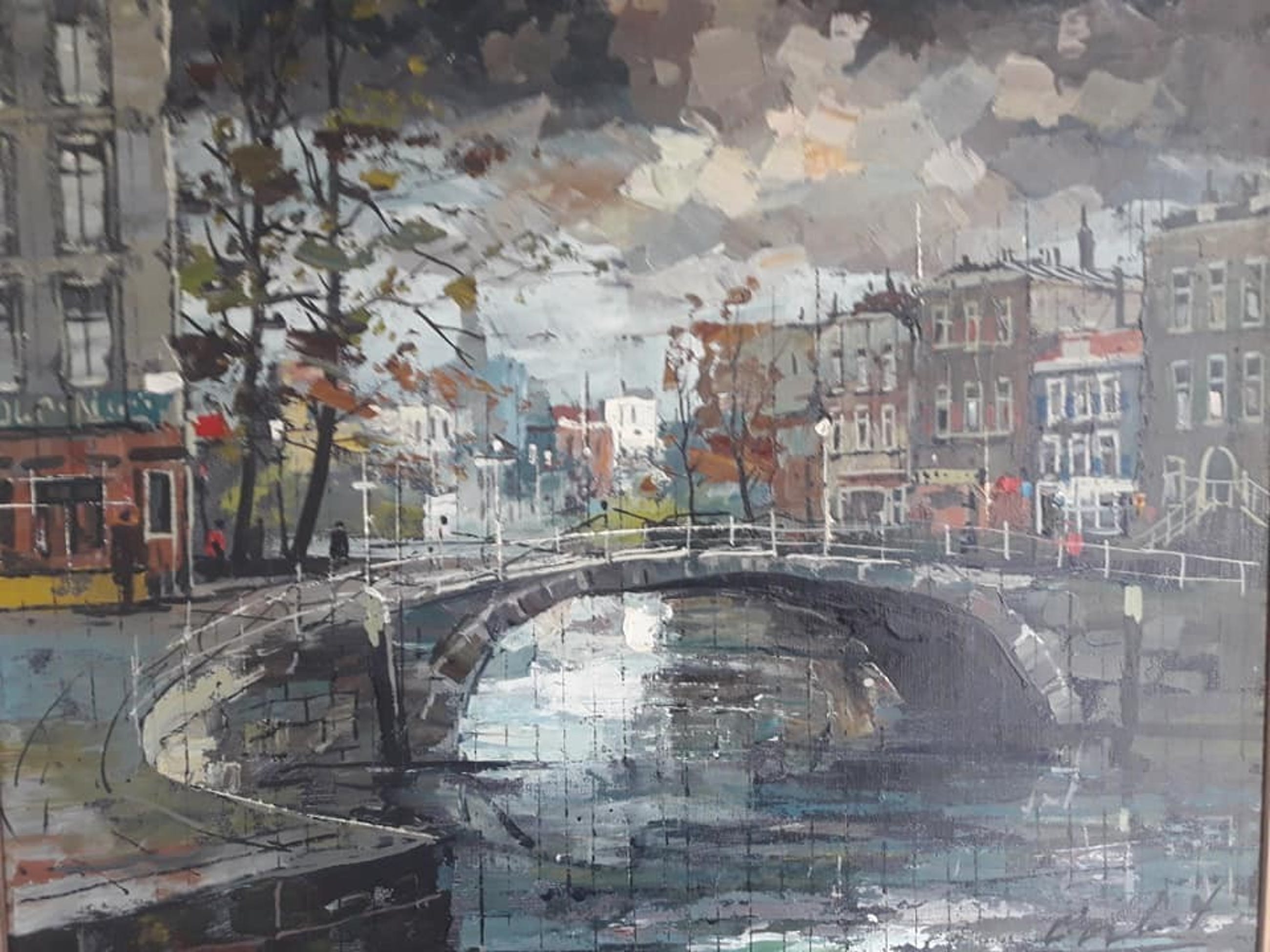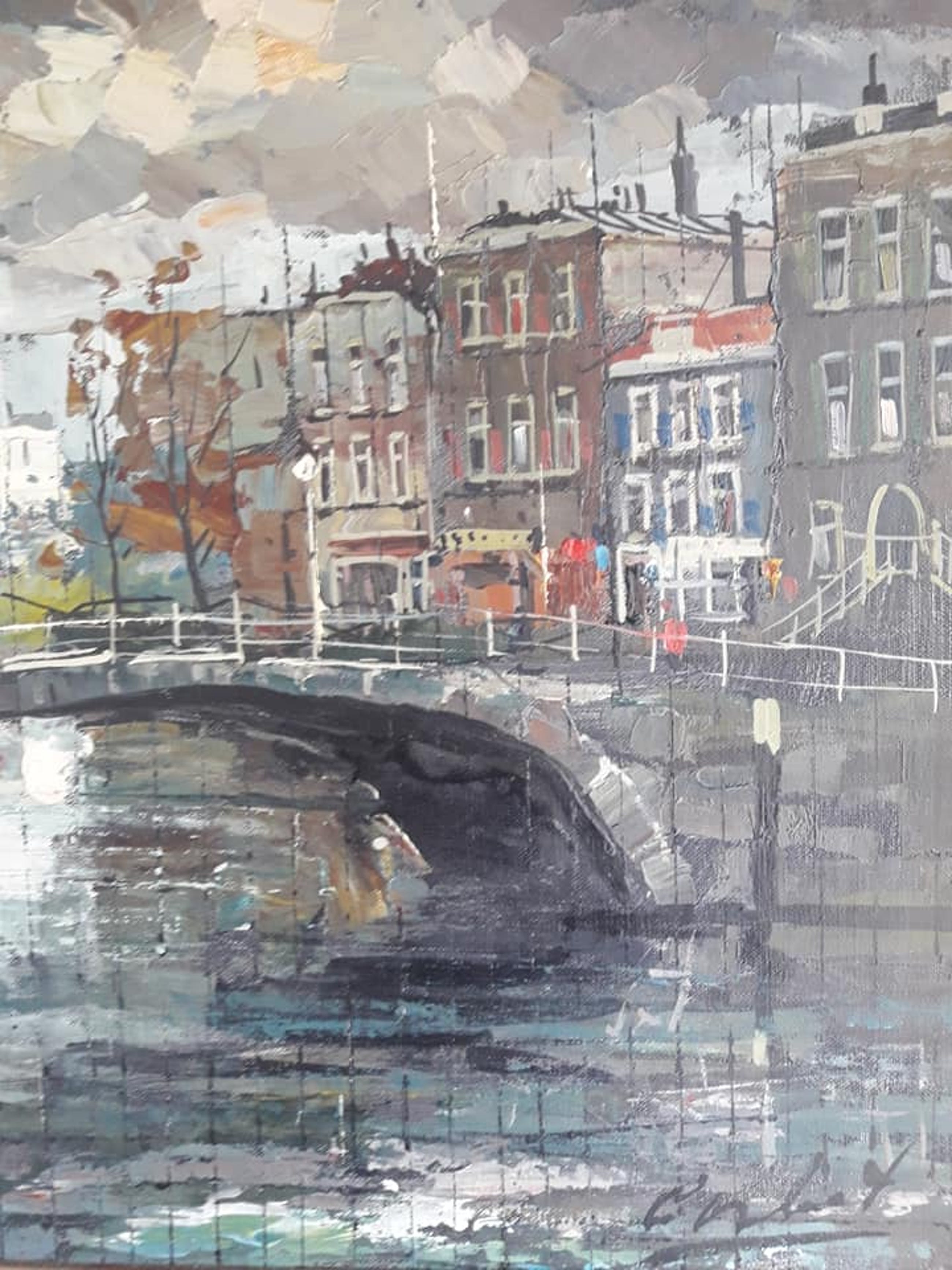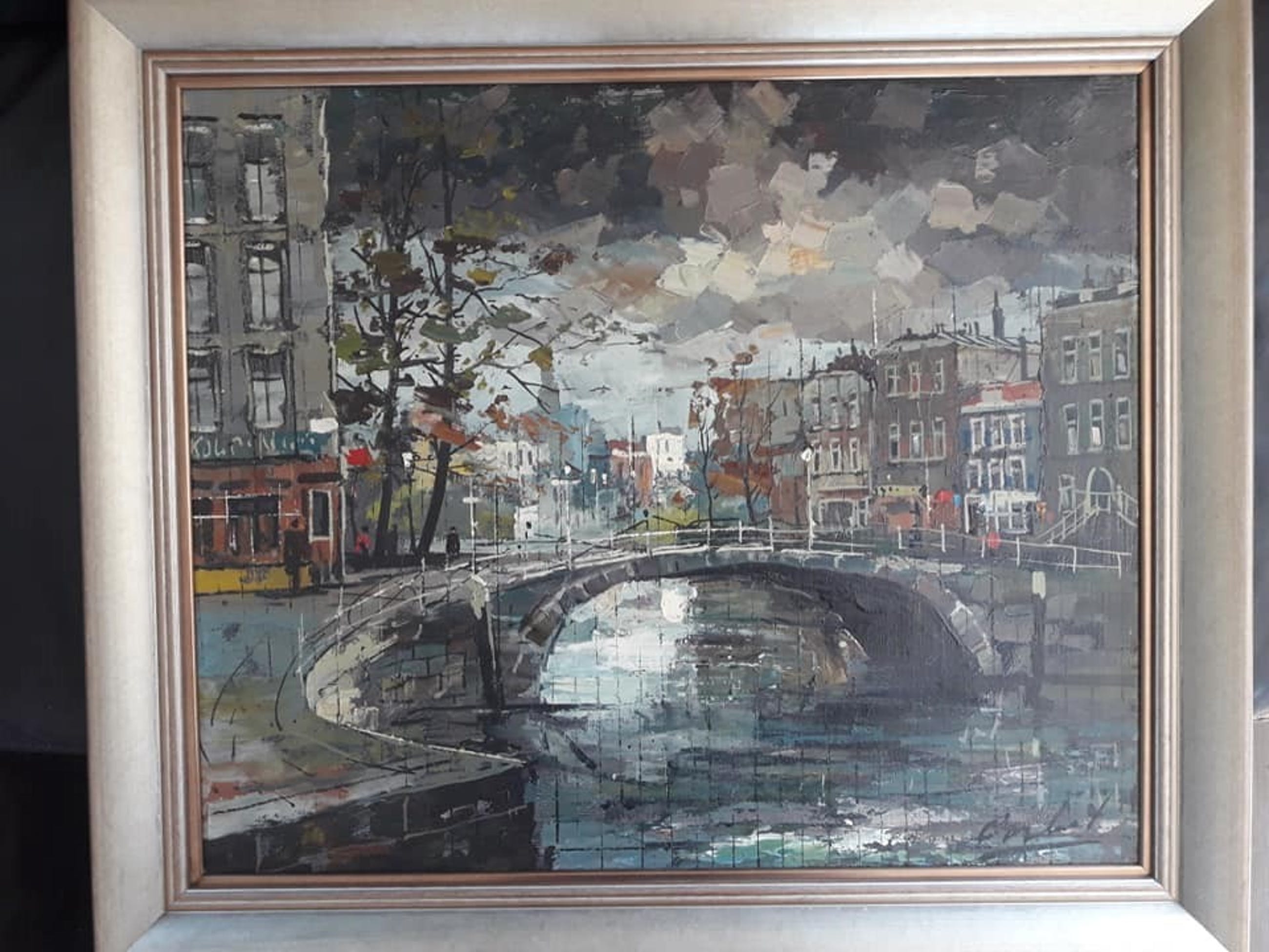 Schitterend werk van een Europese stadsgracht. Wellicht Amsterdam of Parijs? De signatuur is niet te herkennen maar Lijkt een Franse naam. Het werk is in zeer goede staat en is professioneel ingelijst in een mooie en onbeschadigde passende lijst.Het zal worden verzonden in een op maat gemaakte kist om beschadiging te voorkomen.Ophalen kan ook, in IJmuiden of Bodegraven.
