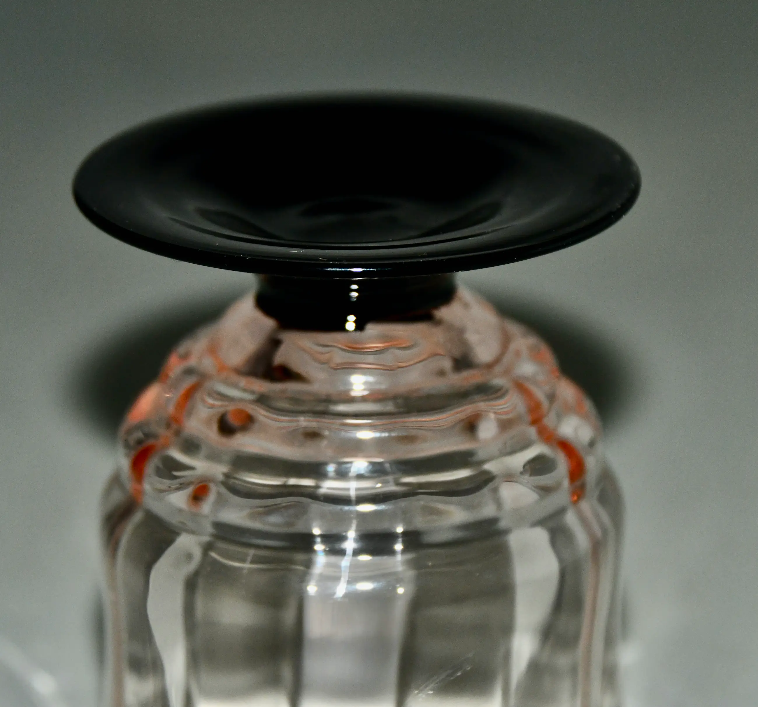 6 Zeer zeldzame Art Deco glazen in rosaline glas met zwarte glazen voetjes.