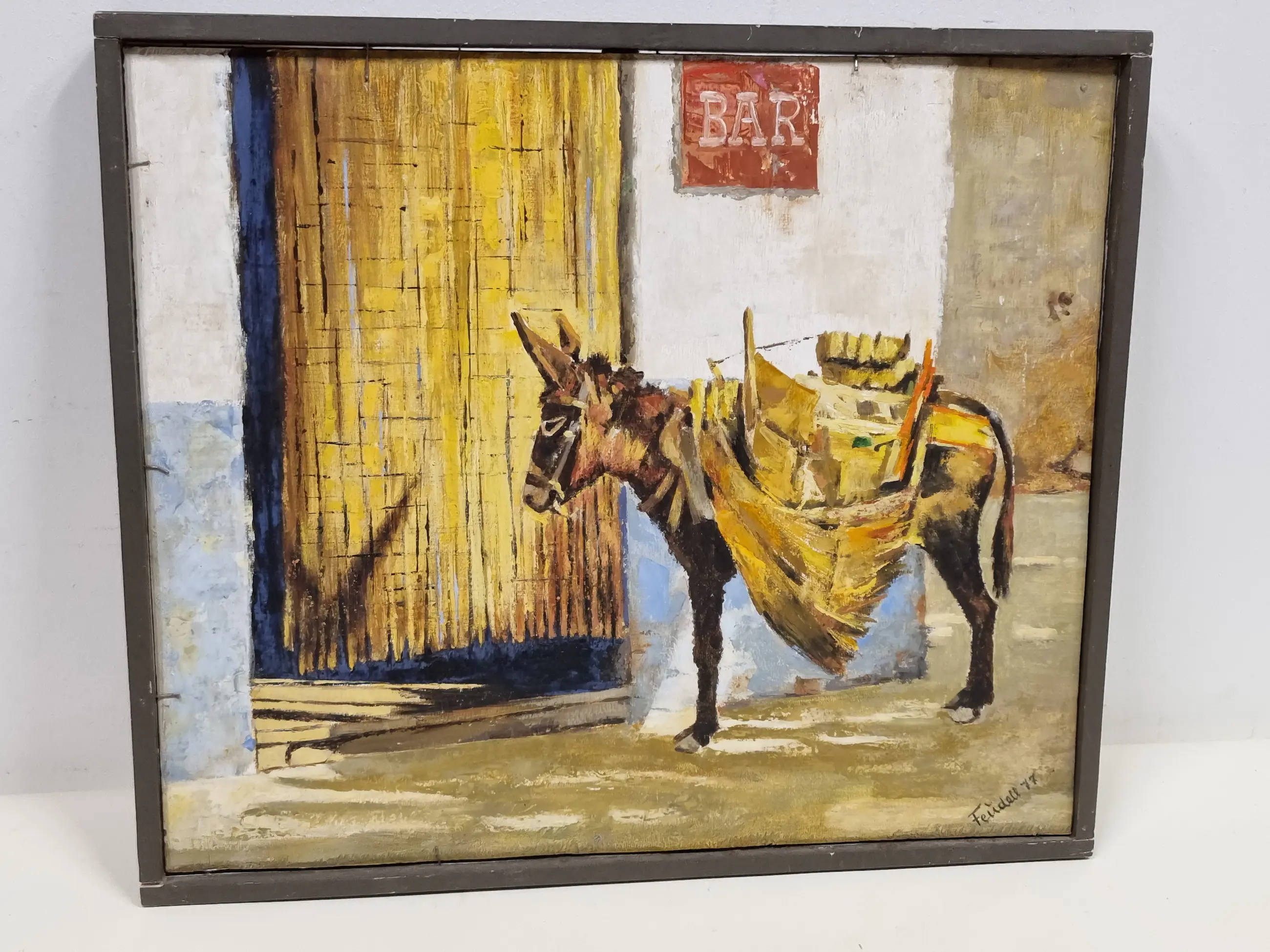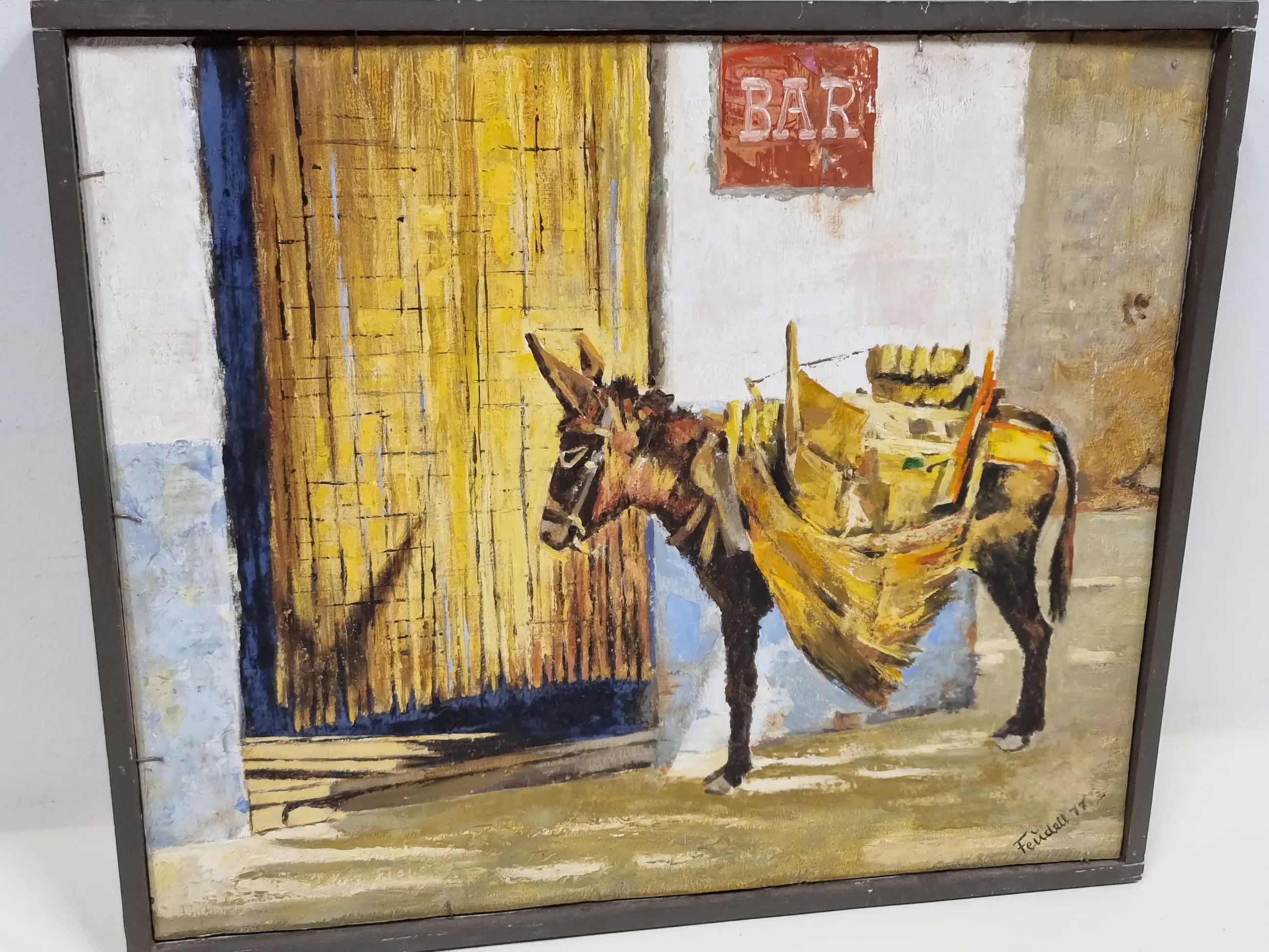 Zeer aandoenlijk schilderij van een ezel wachtende buiten bij een (Zuid-Amerikaanse) bar
