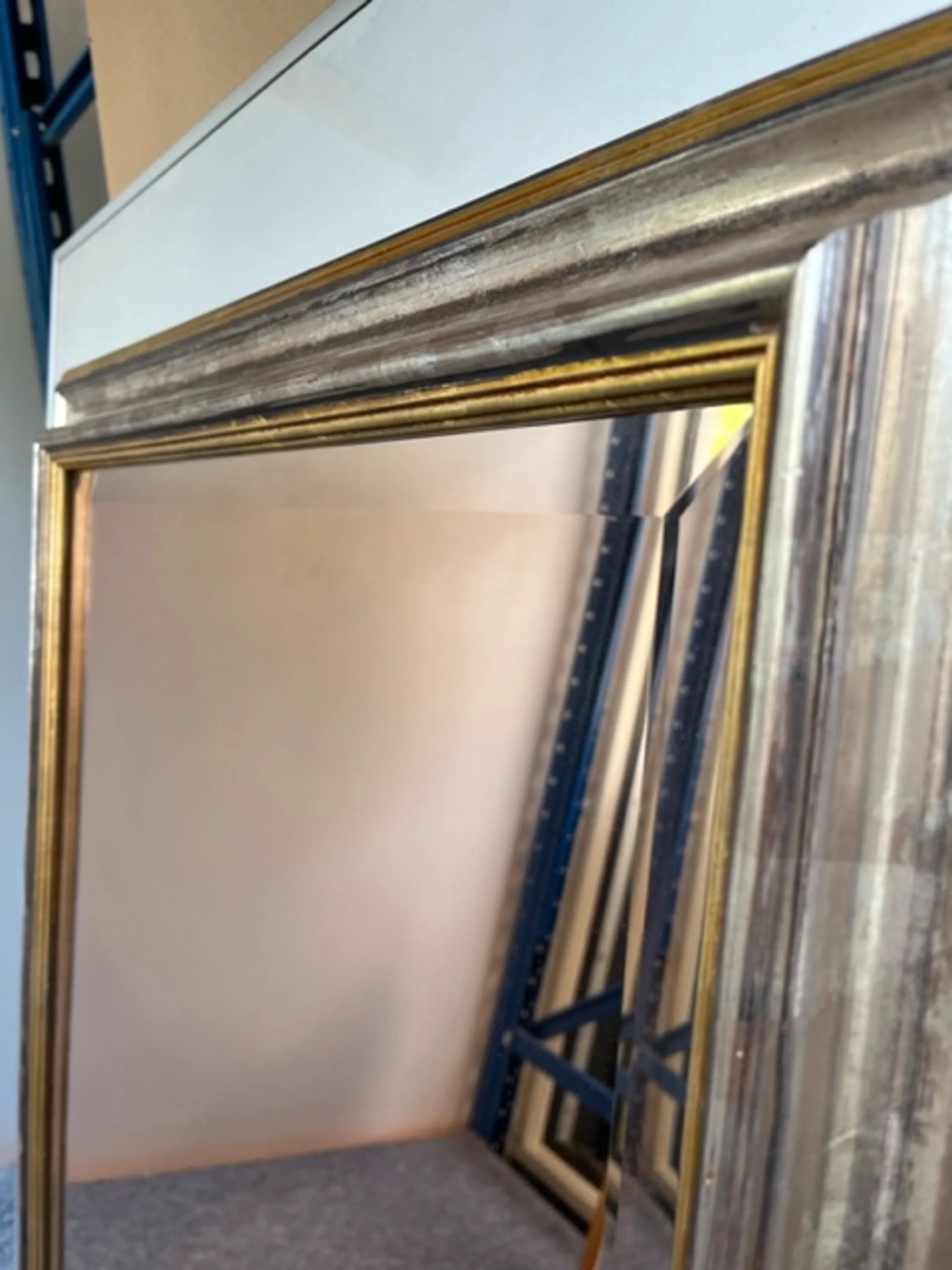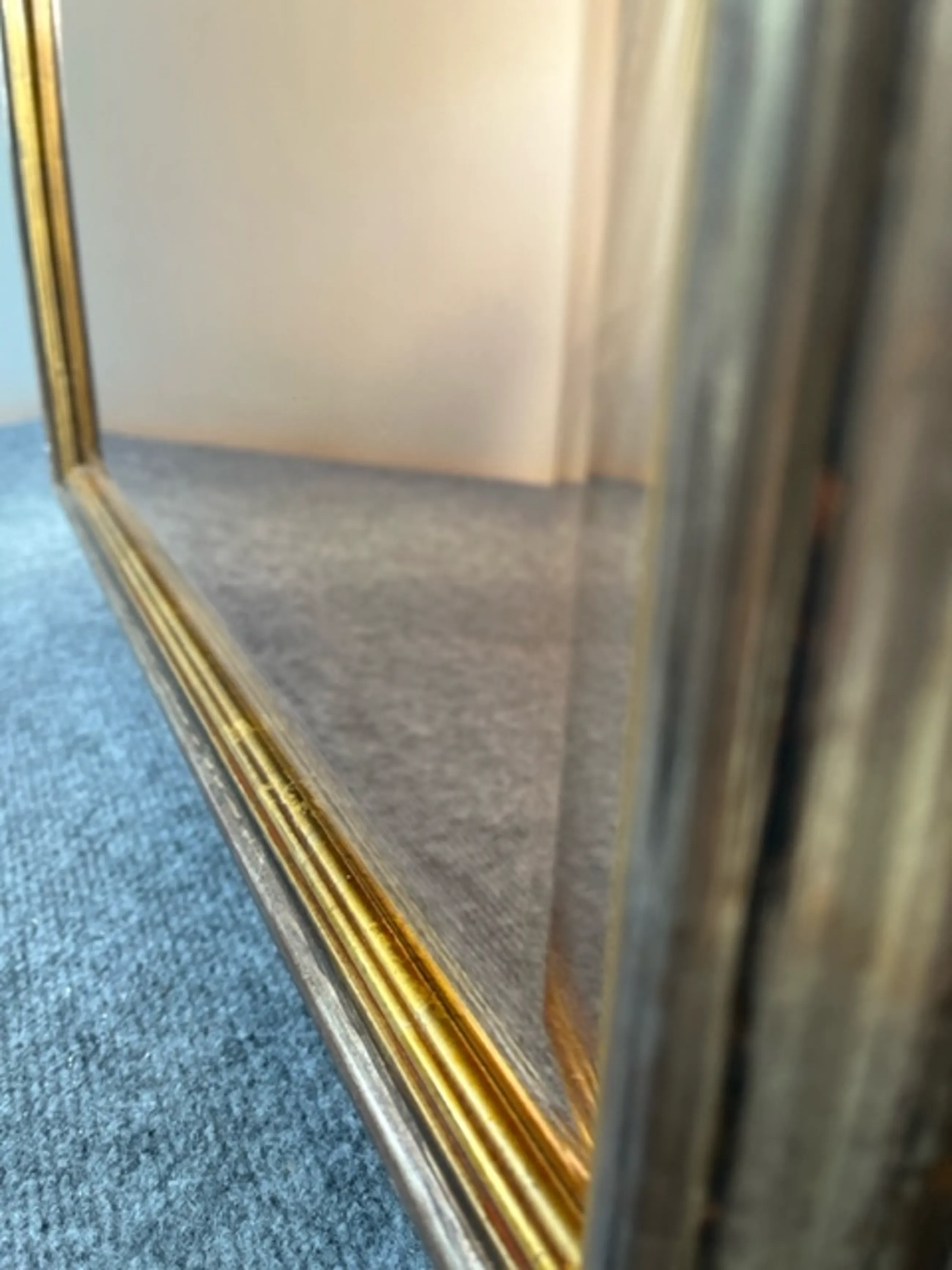 Facet geslepen spiegel in mooie goud- en zilverkleurige lijst van onbekende maker. De spiegel is vervaardigd van glas met een roze gloed.