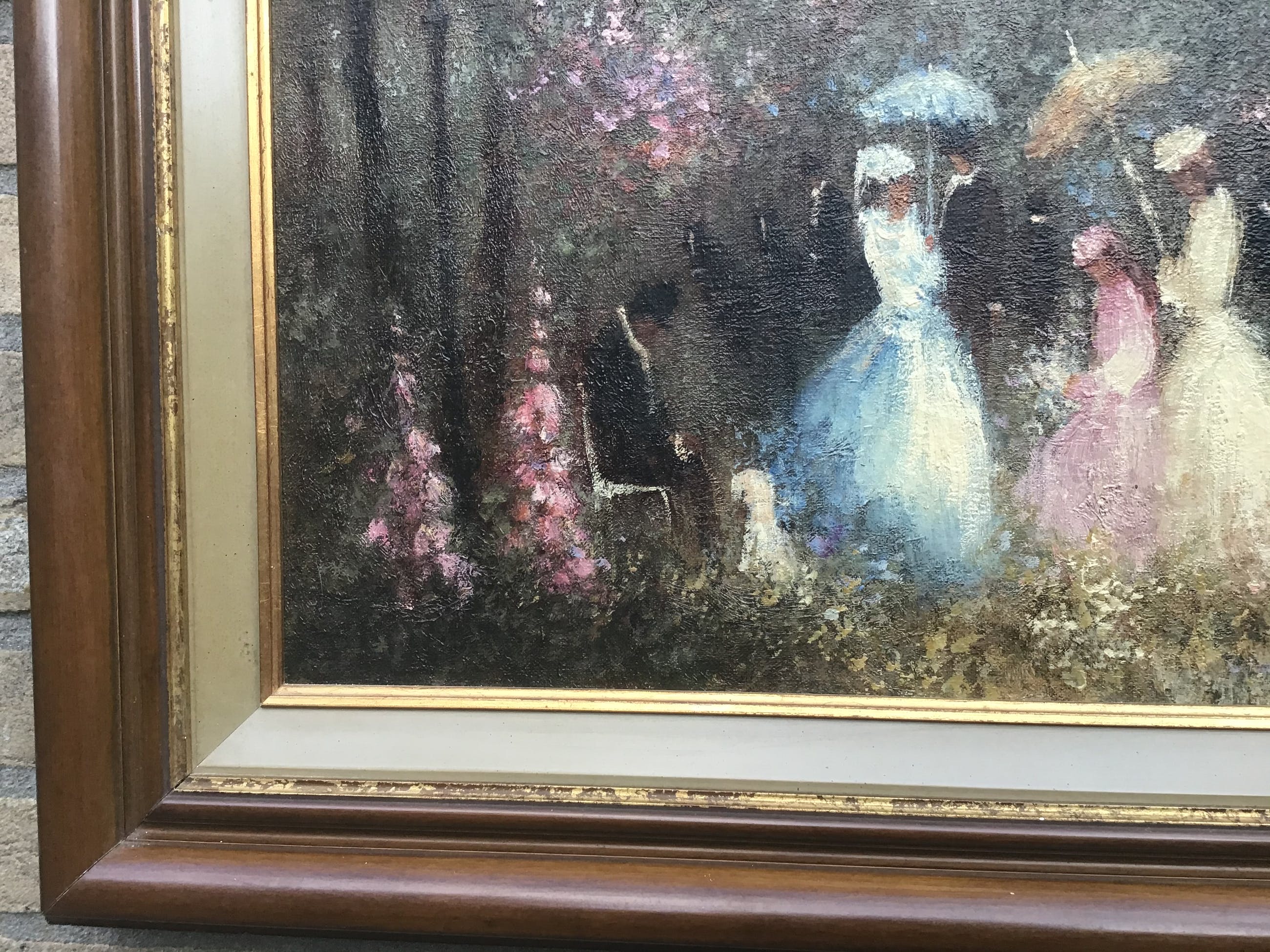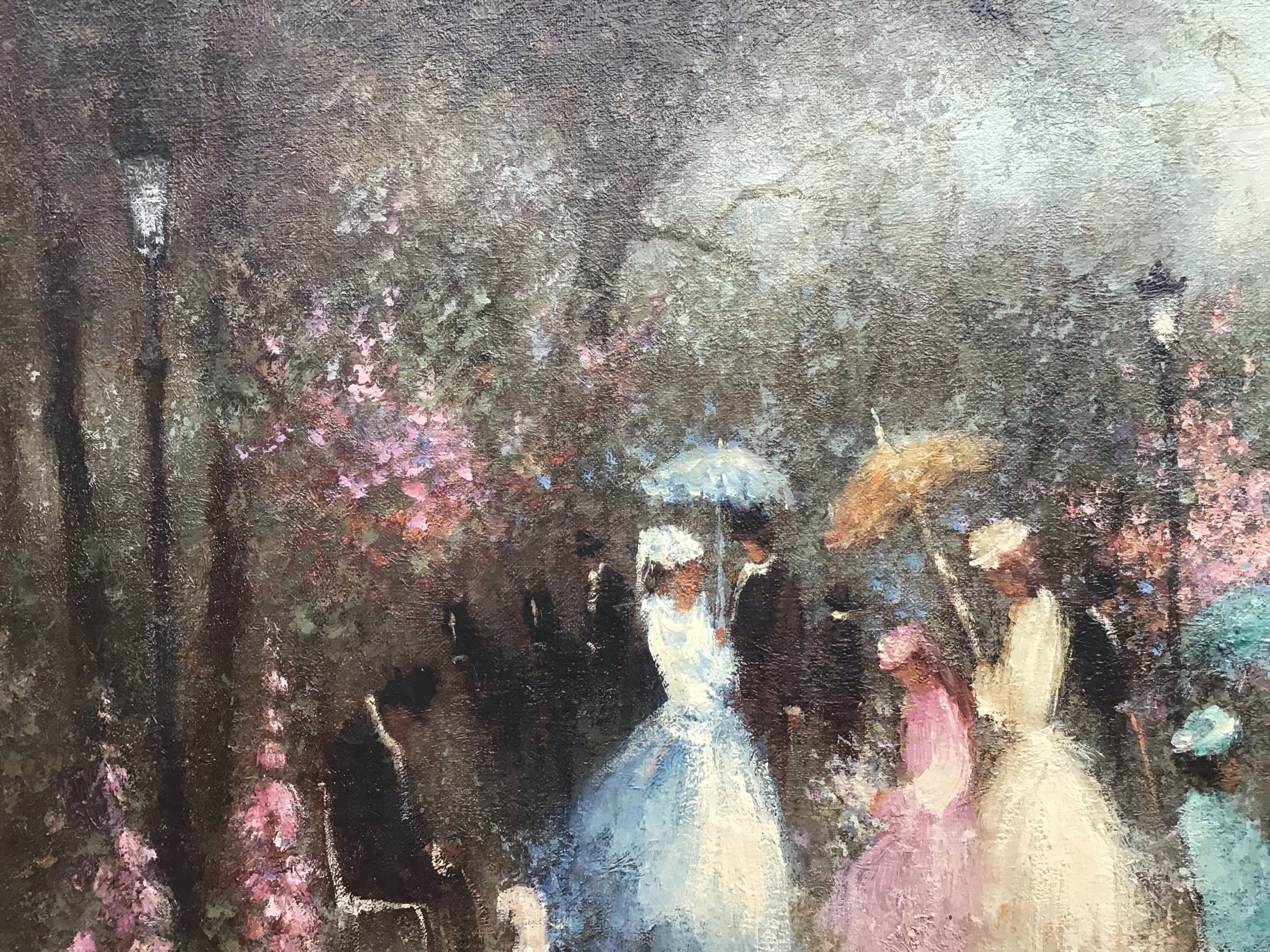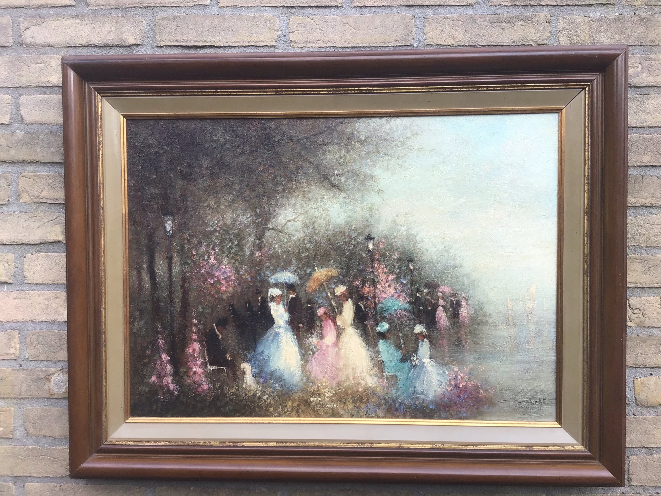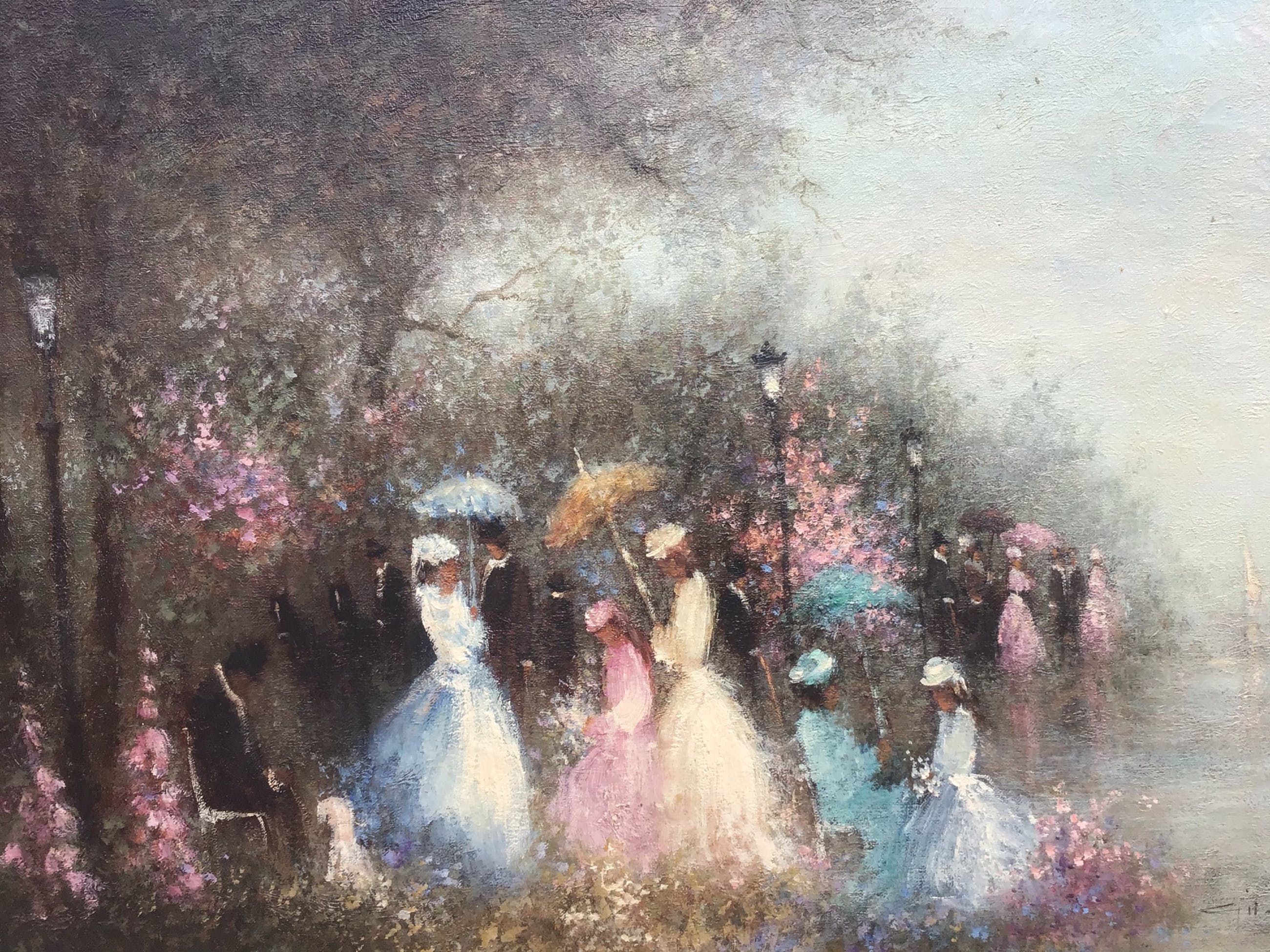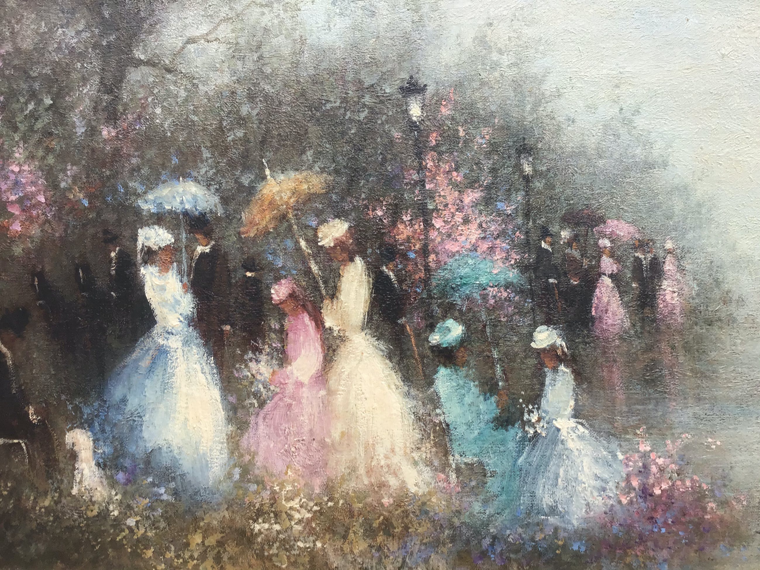 Werk in victoriaans/impressionistische stijl. Dames en heren die een partijtje hebben of wandeltochten aan de waterkant. In de verte zeilen zichtbaar.