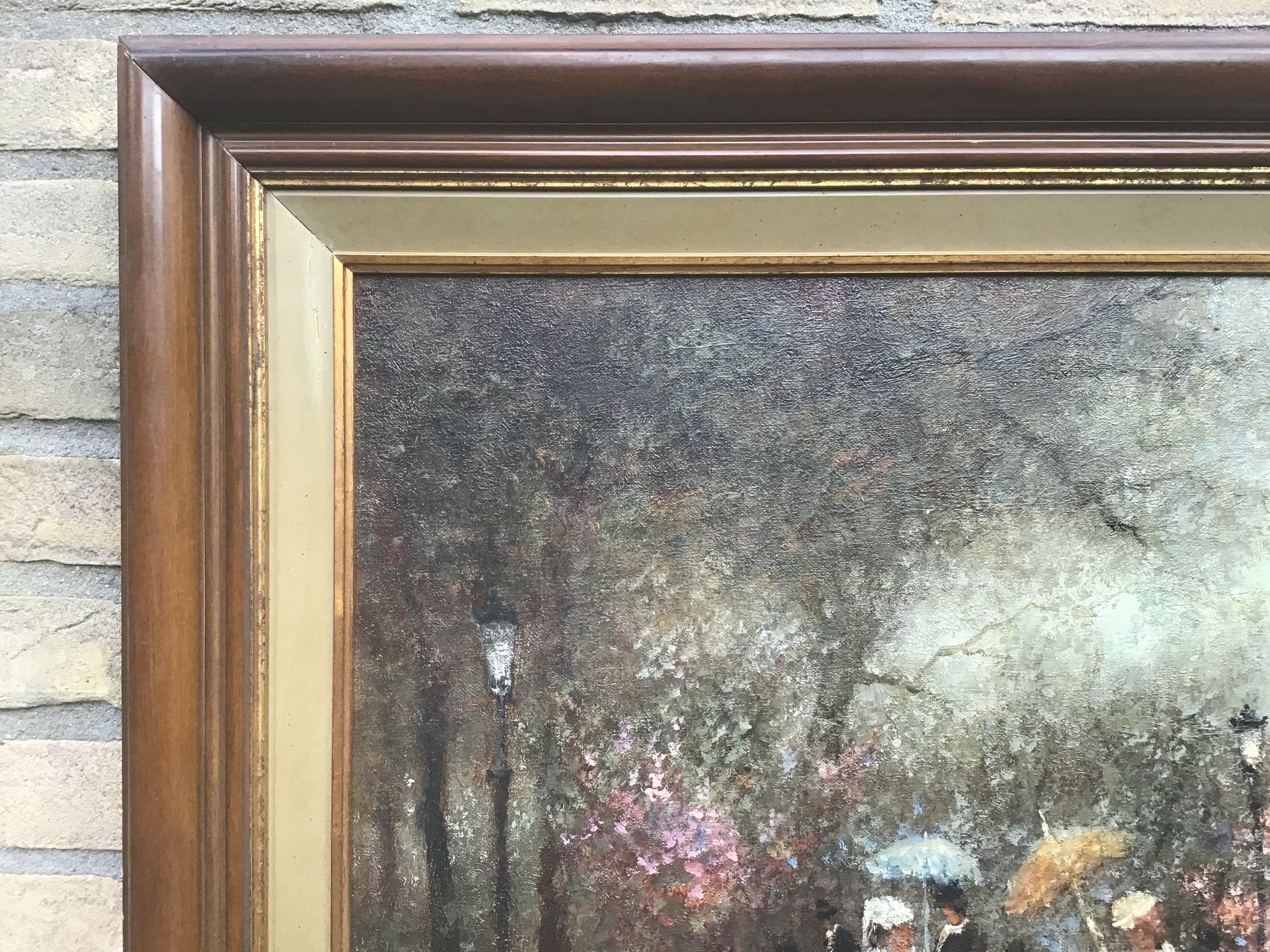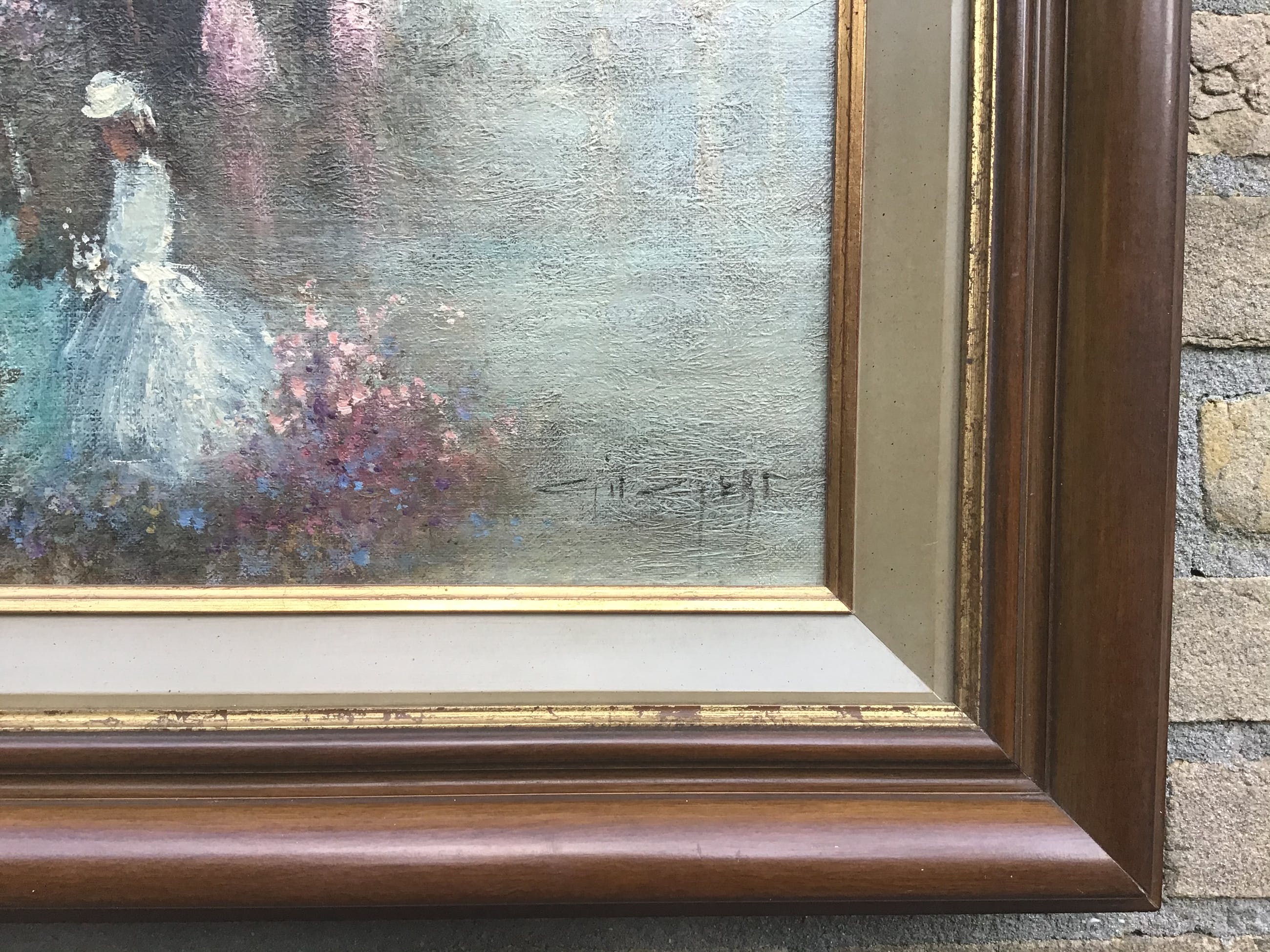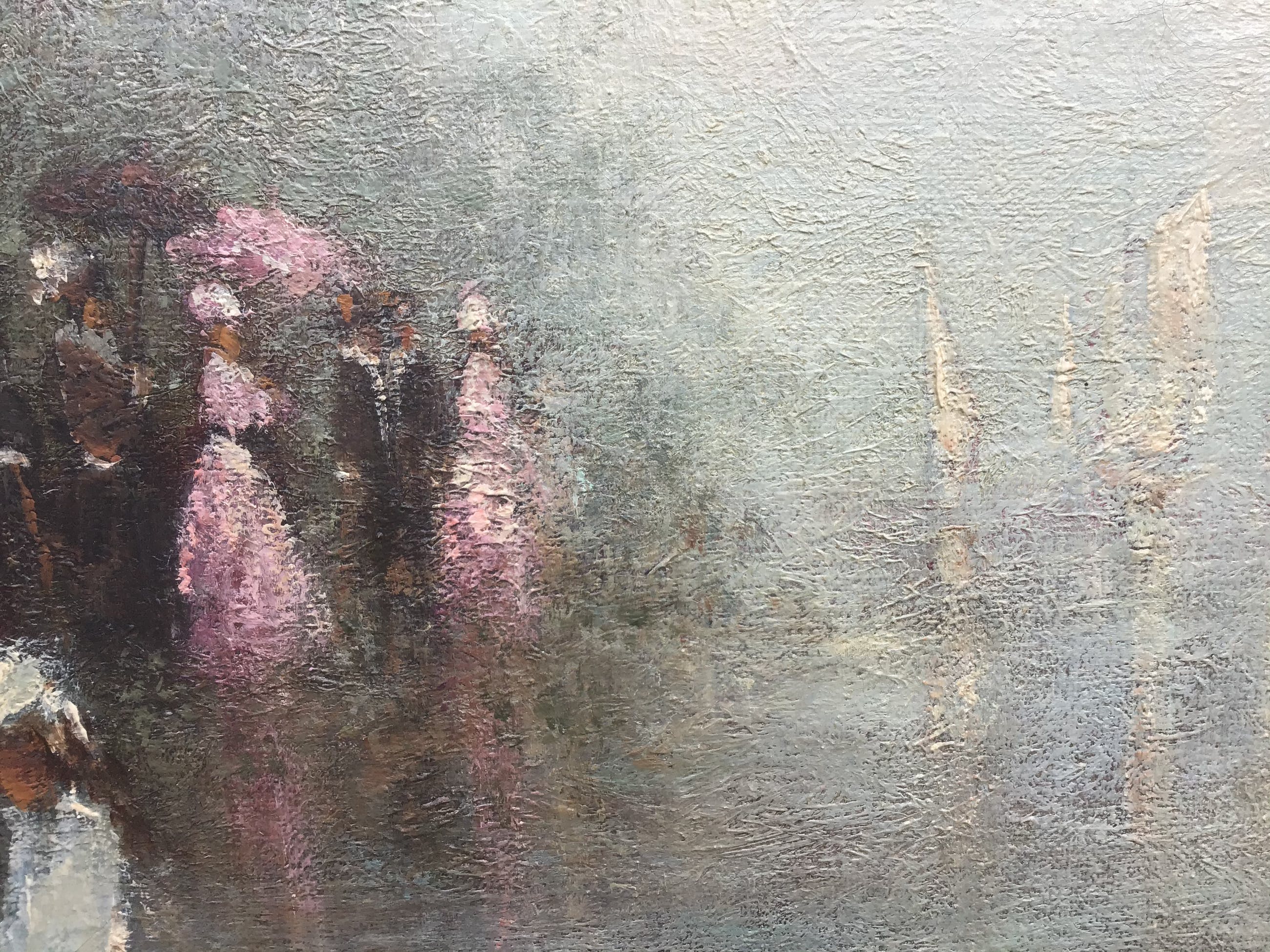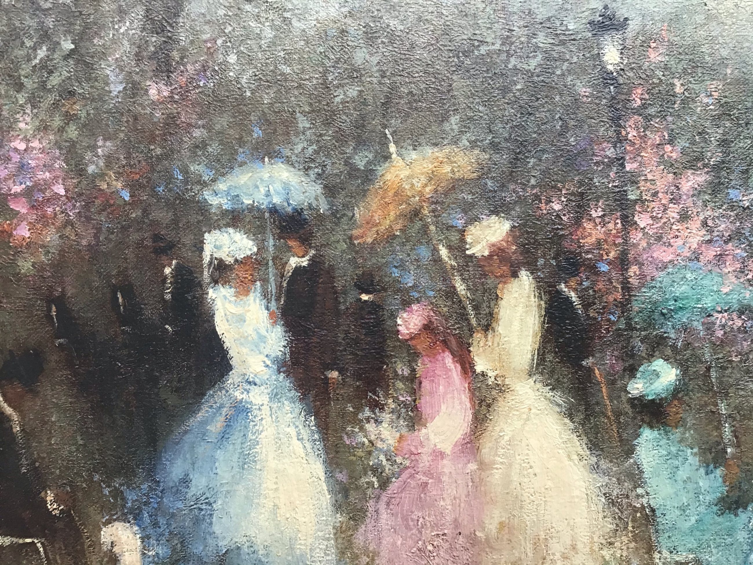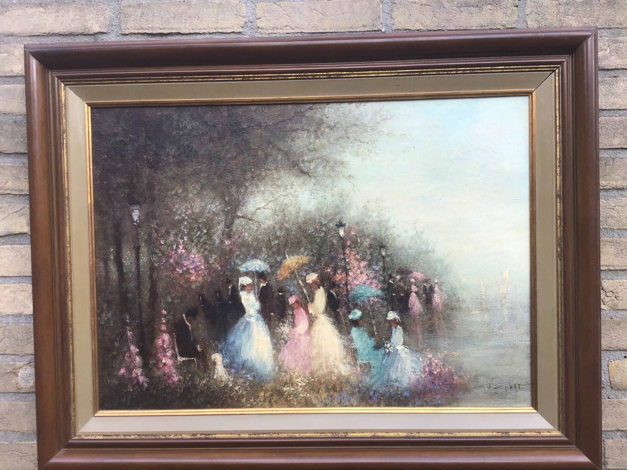 Werk in victoriaans/impressionistische stijl. Dames en heren die een partijtje hebben of wandeltochten aan de waterkant. In de verte zeilen zichtbaar.