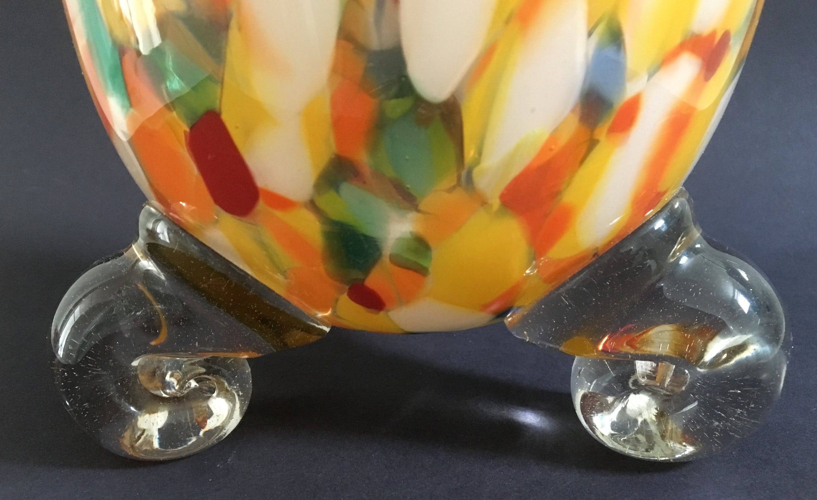 Fraaie grote kleurige vaas op drie krulpootjes van helder glas.Voorzien van sticker van Fidrio Holland.