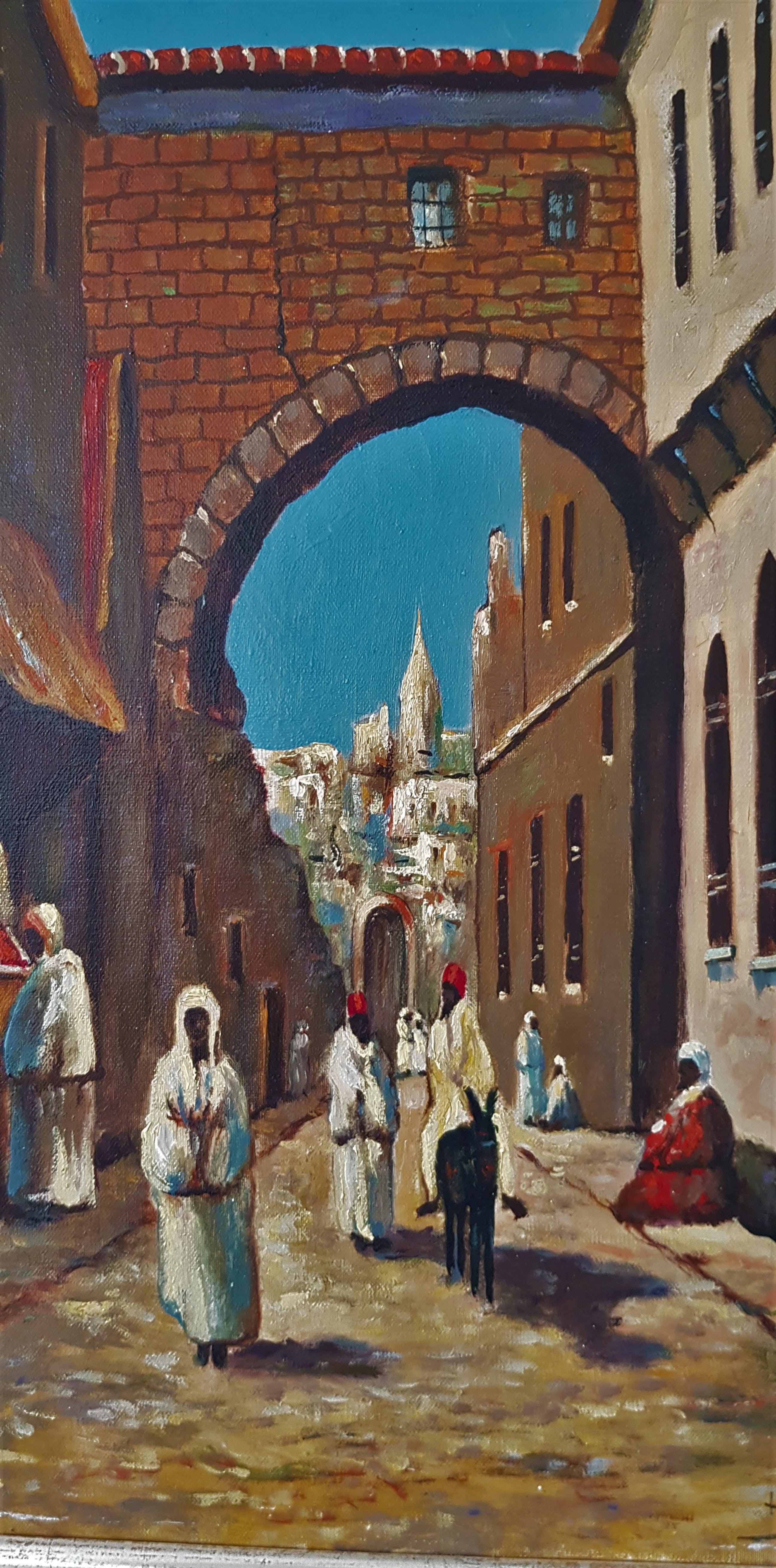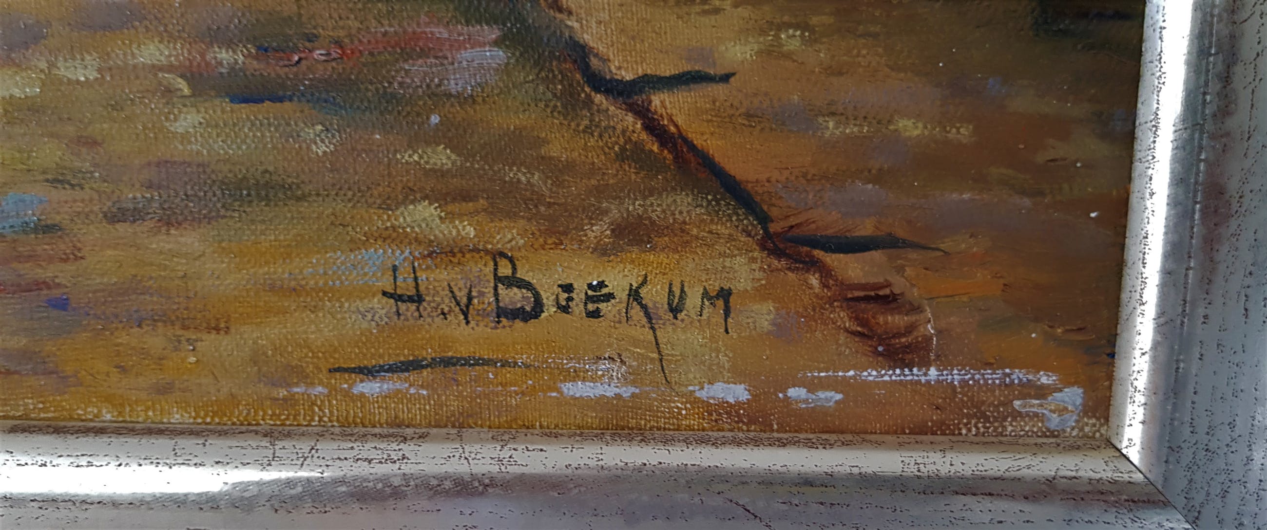 Kunstenaar: H. v. Boekum Titel van kunstwerk: Figuren bij een poort. Jaar: midden 20e eeuw Techniek: Olieverf op doek Handtekening: Handgesigneerd Staat: In goede staat Afmeting: Afbeeldingsgrootte 60×50 cm Totale afmetingen 67×58× cm In goede staat