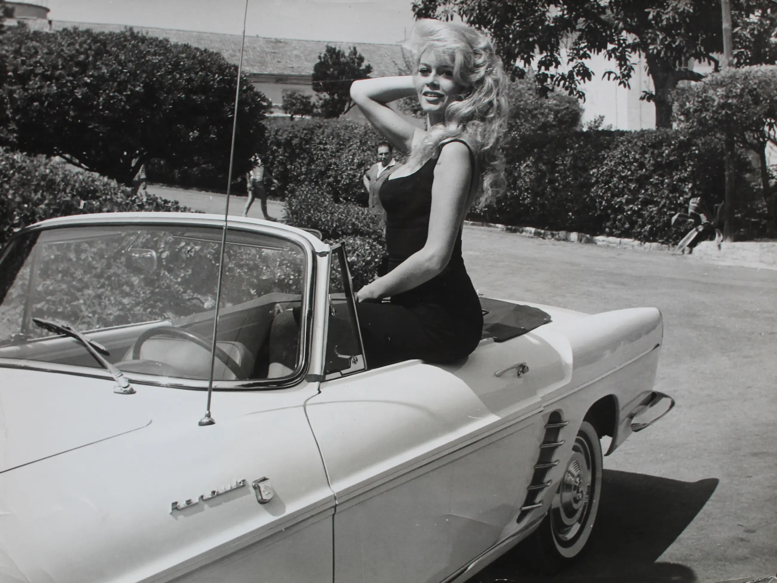 Prachtige foto van de actrice Brigitte Bardot in auto uit 1959. Afmetingen werk: H18,5 x b24 cm.