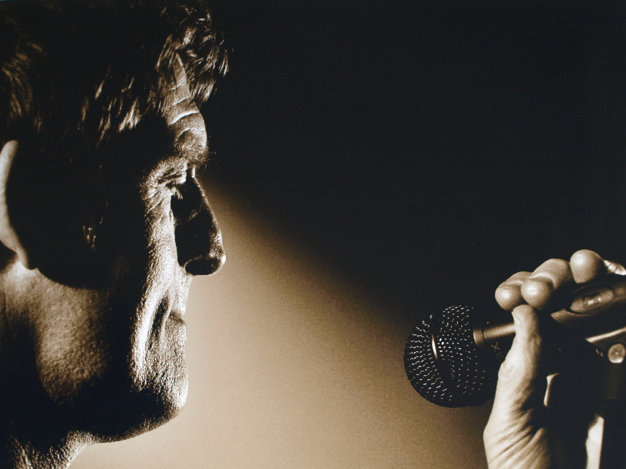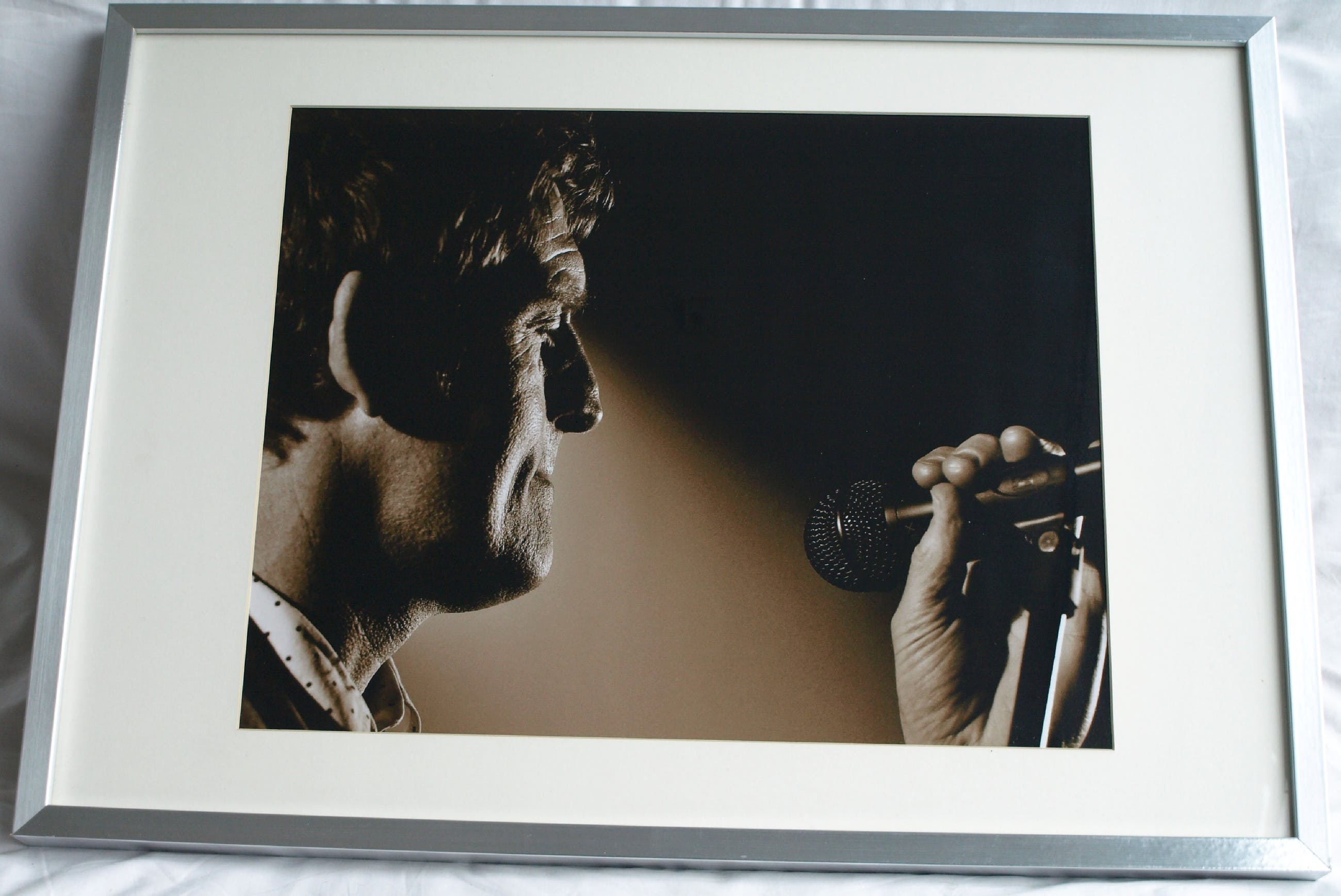 Een grote ingelijste foto van de zanger van de Nederlandse popgroep De Dijk, Huub van der Lubbe (1953).