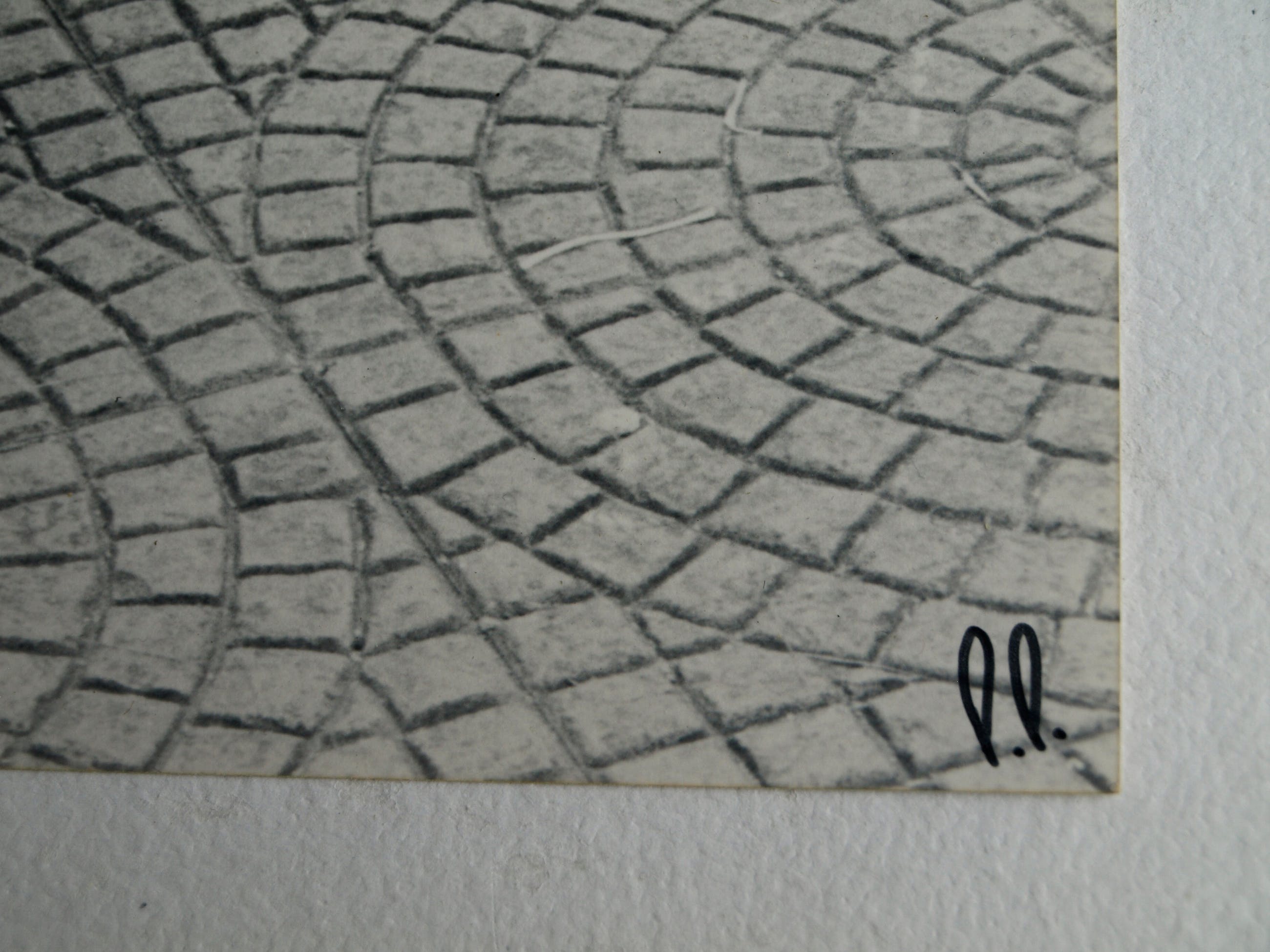 -De foto is rechtsonder met zwarte stift gesigneerd met de initialen ‘P.P.’ Na inlijsting zit deze signatuur net achter het passe-partout.