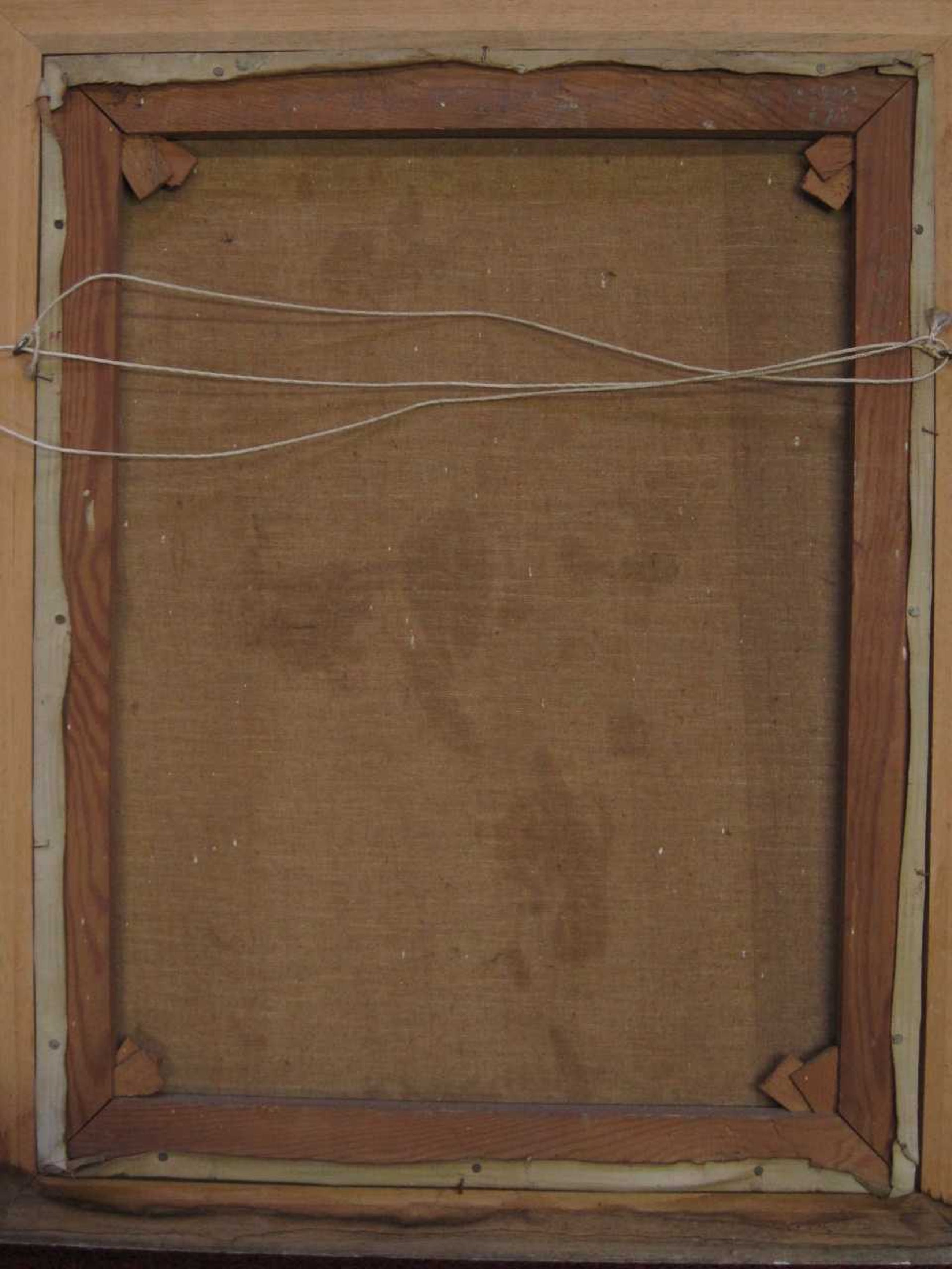 Het doek verkeert in goede conditie. De lijst (met name de onderzijde) vertoont de nodige beschadigingen.