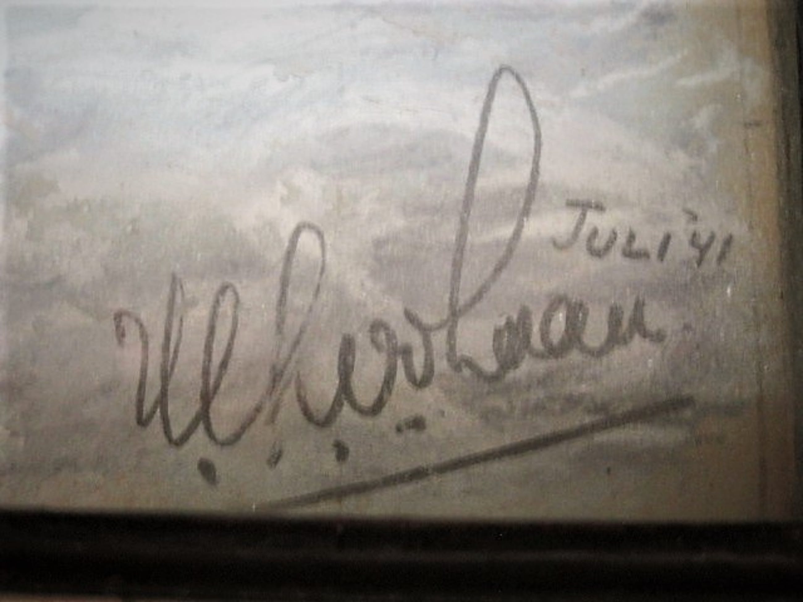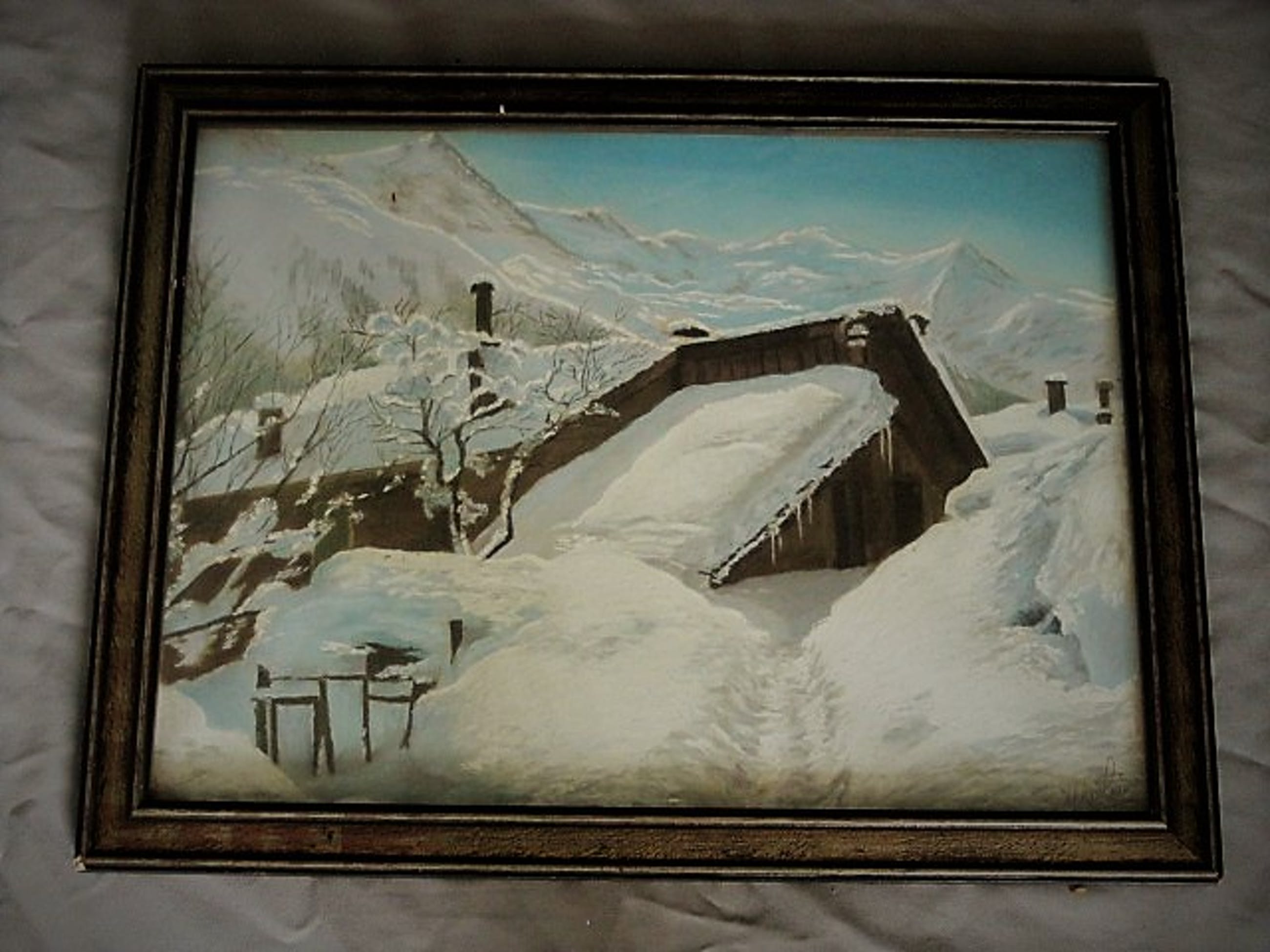 Het is ons helaas niet gelukt om de handtekening te ontcijferen die op deze prachtige, in 1941 geschilderde voorstelling van een "zonnige winterochtend in de Alpen" zichtbaar is. Deze schilder is waarschijnlijk Duits of Zwitsers van nationaliteit en met een ongetwijfeld indrukwekkend ouevre.