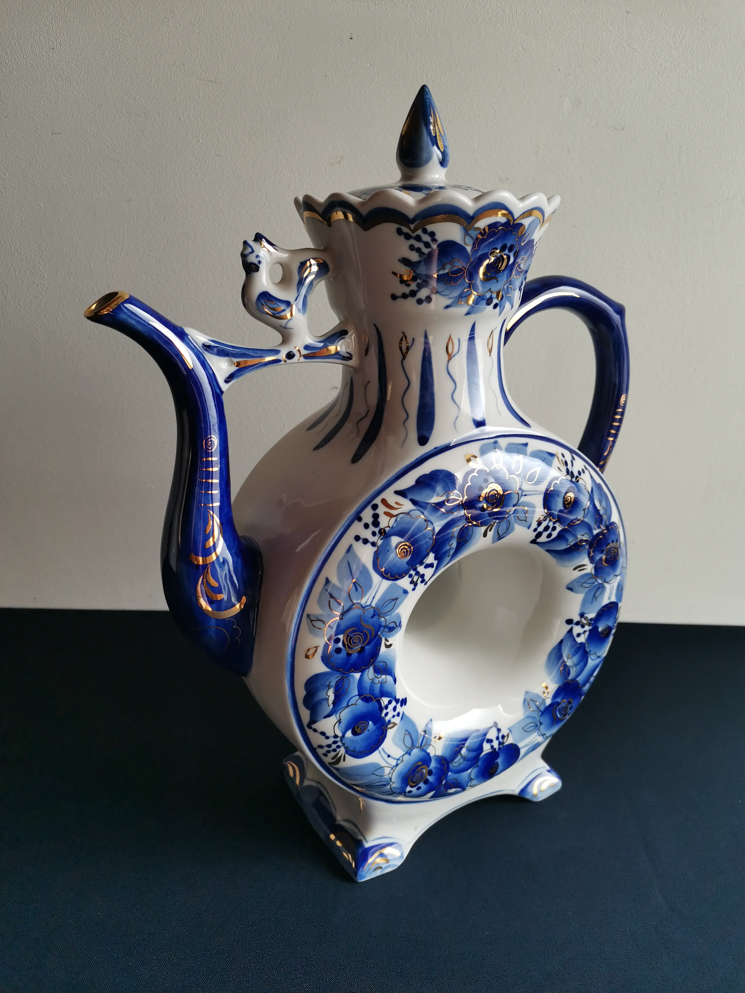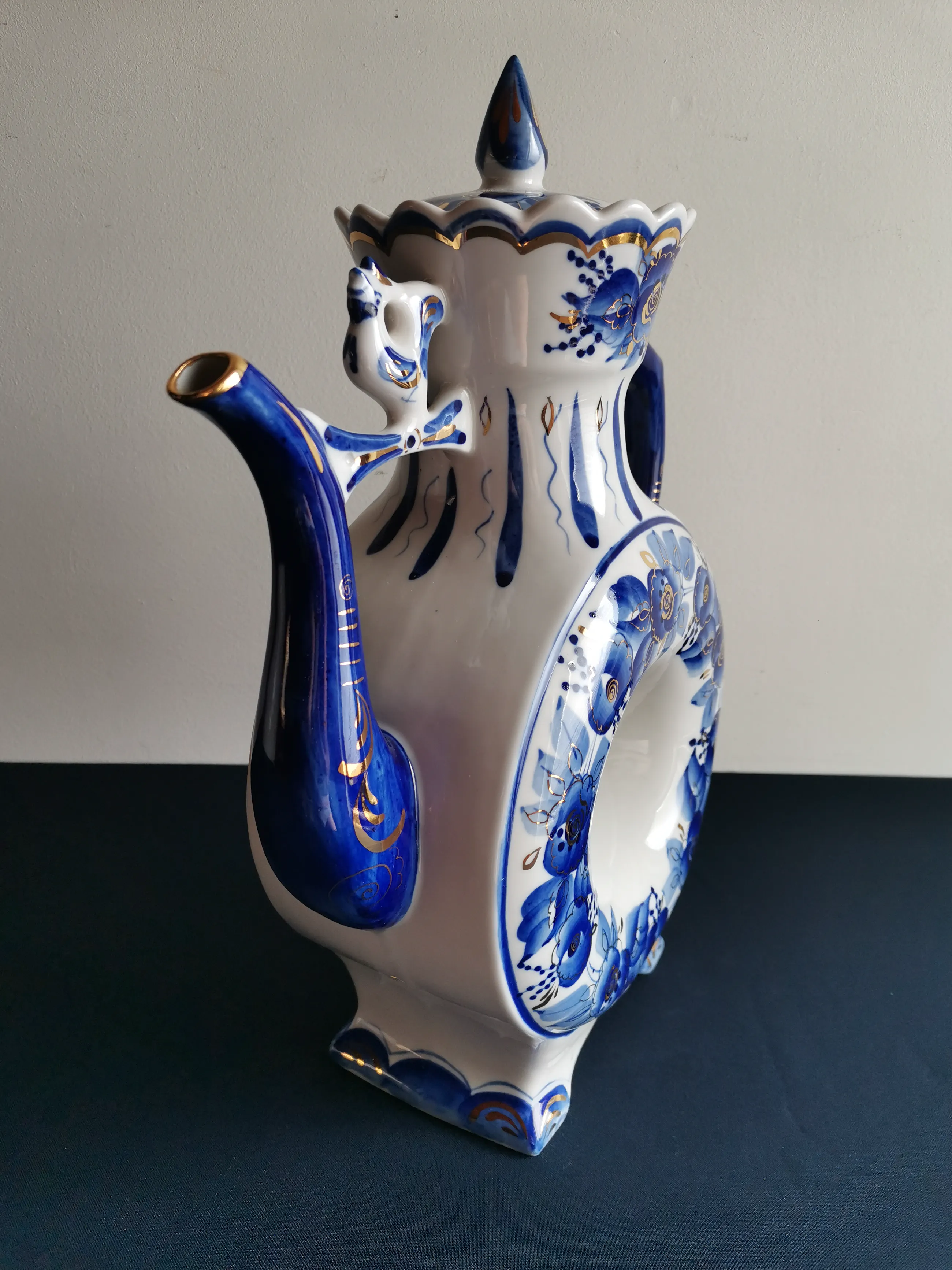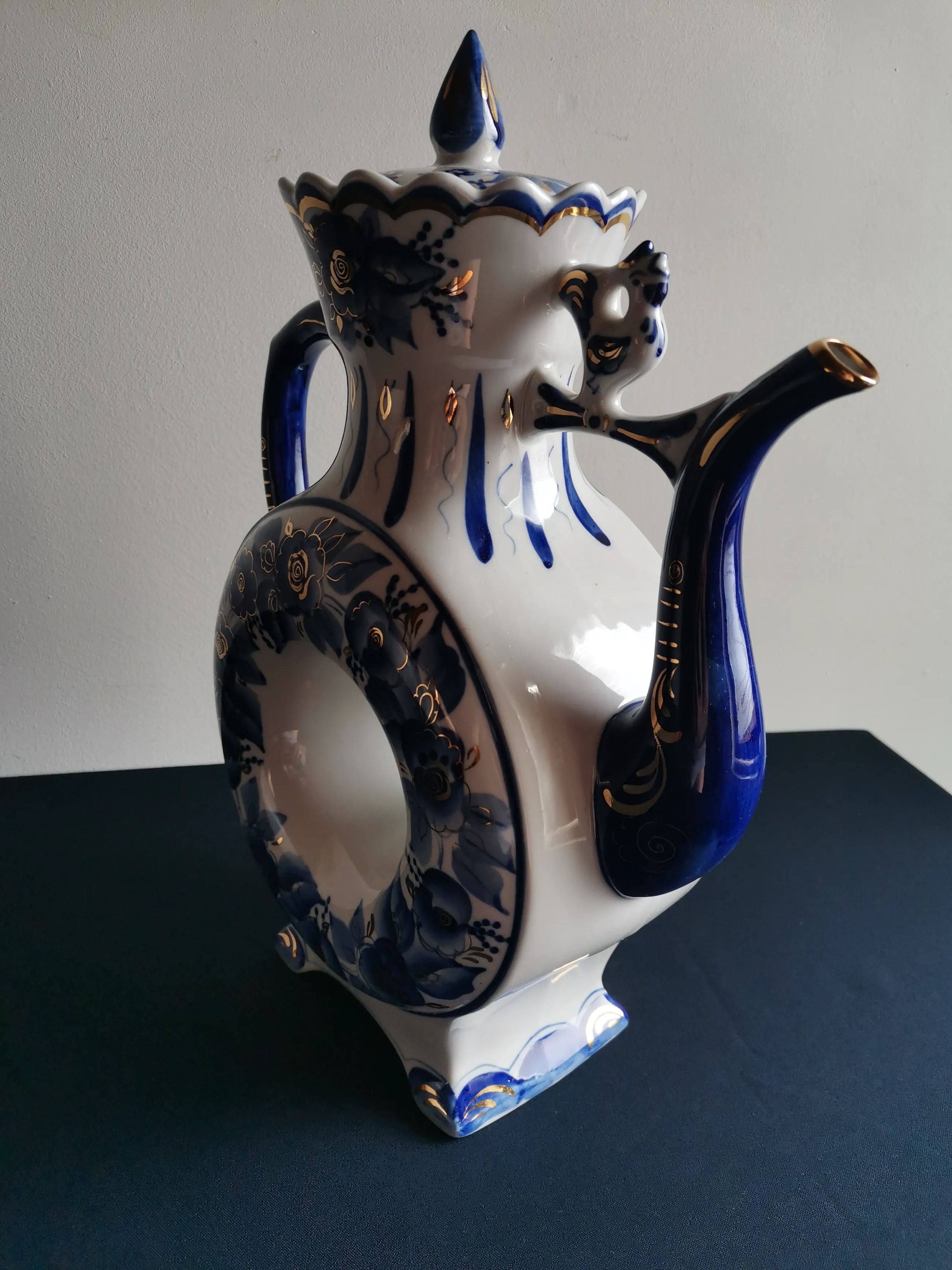 deze koffiepot is vervaardigd uit blauw en wit keramiek,
