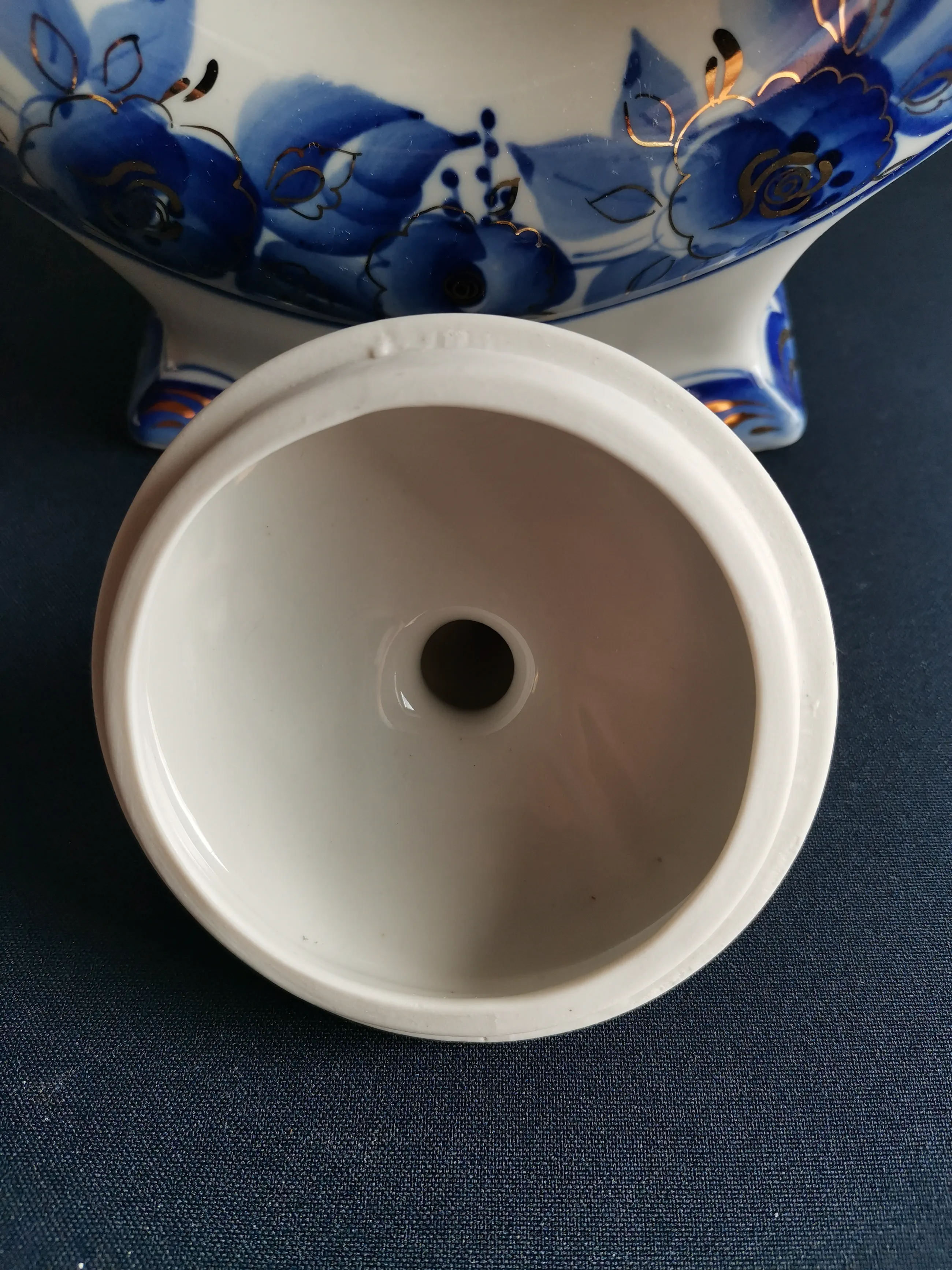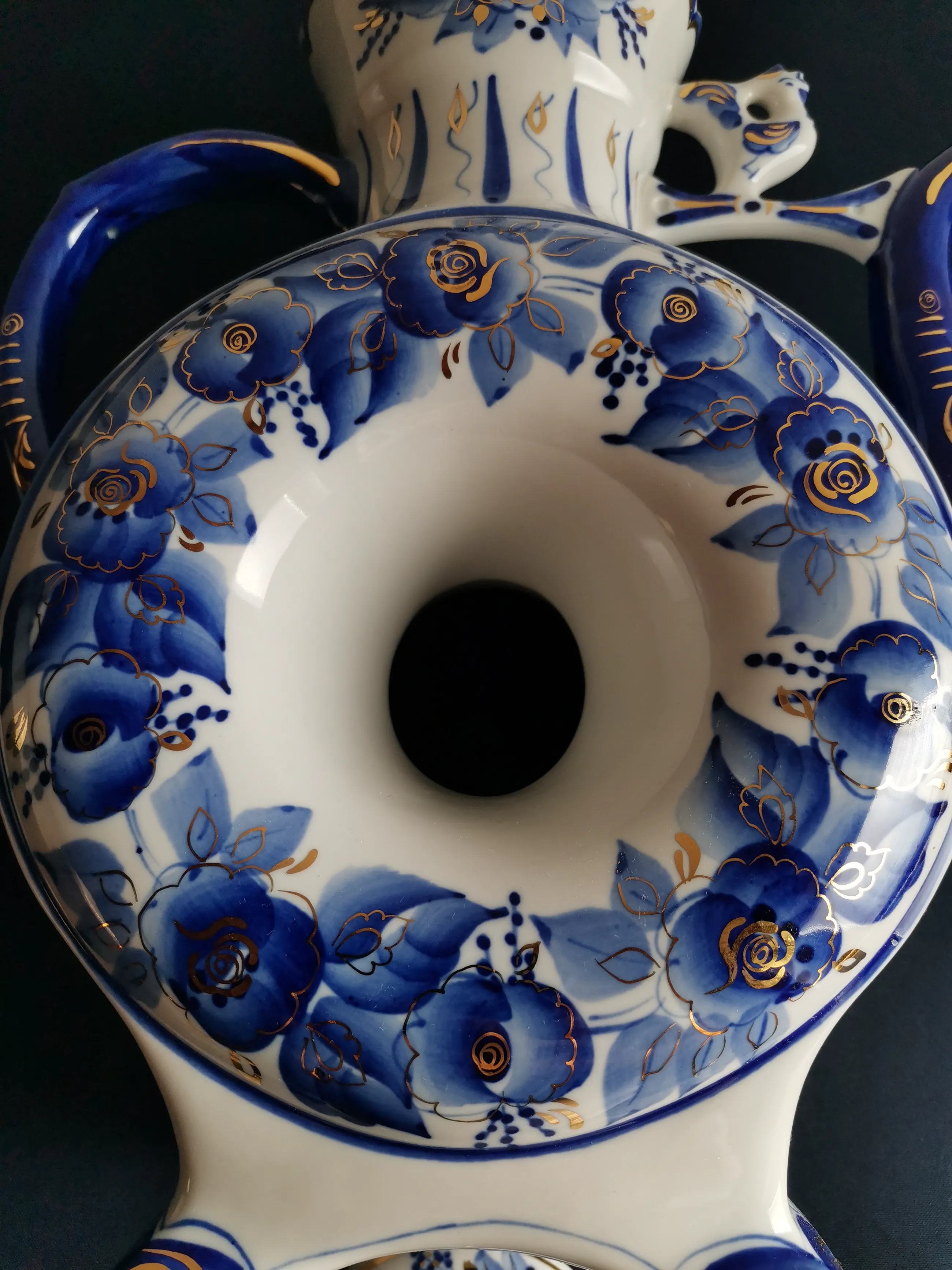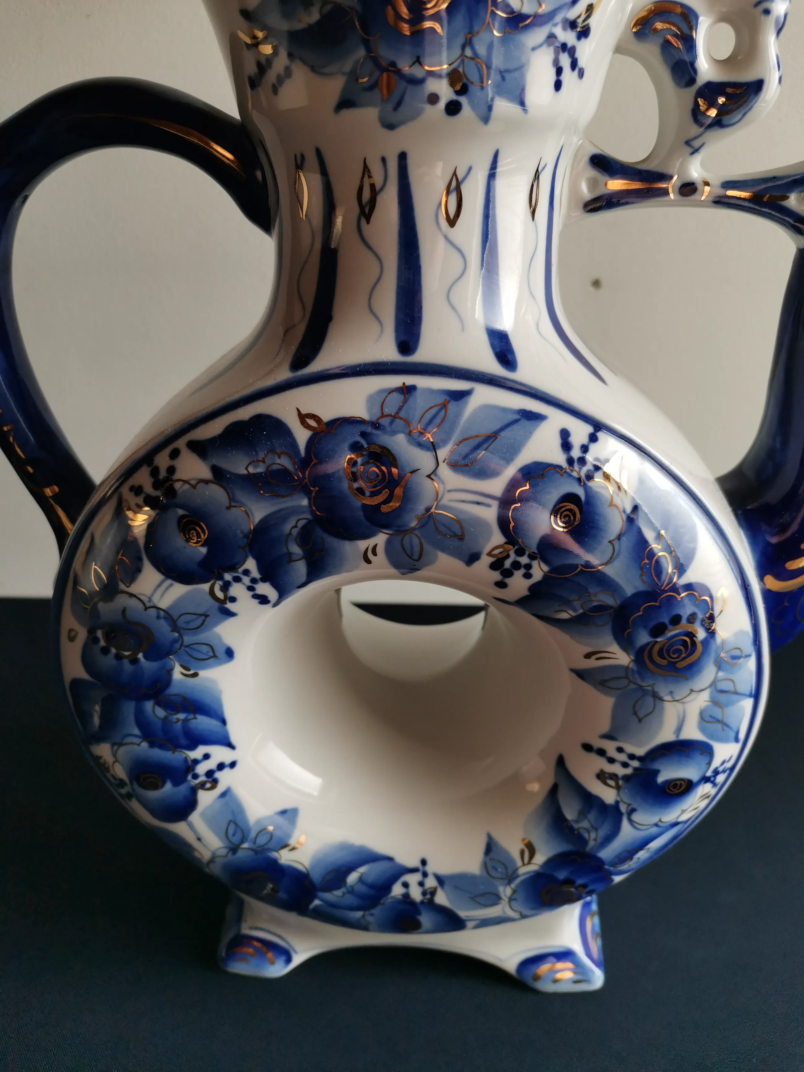 deze koffiepot is vervaardigd uit blauw en wit keramiek,
