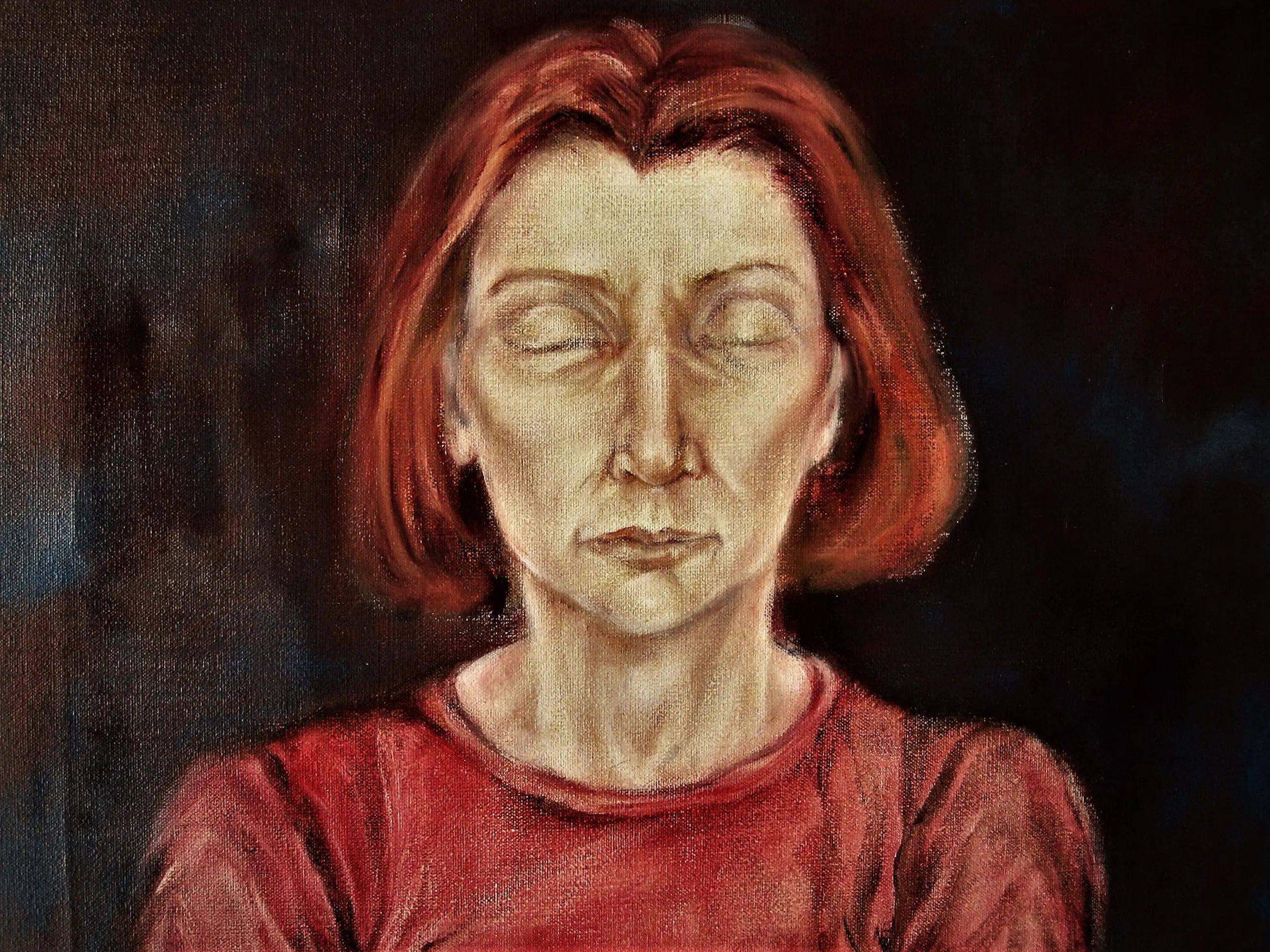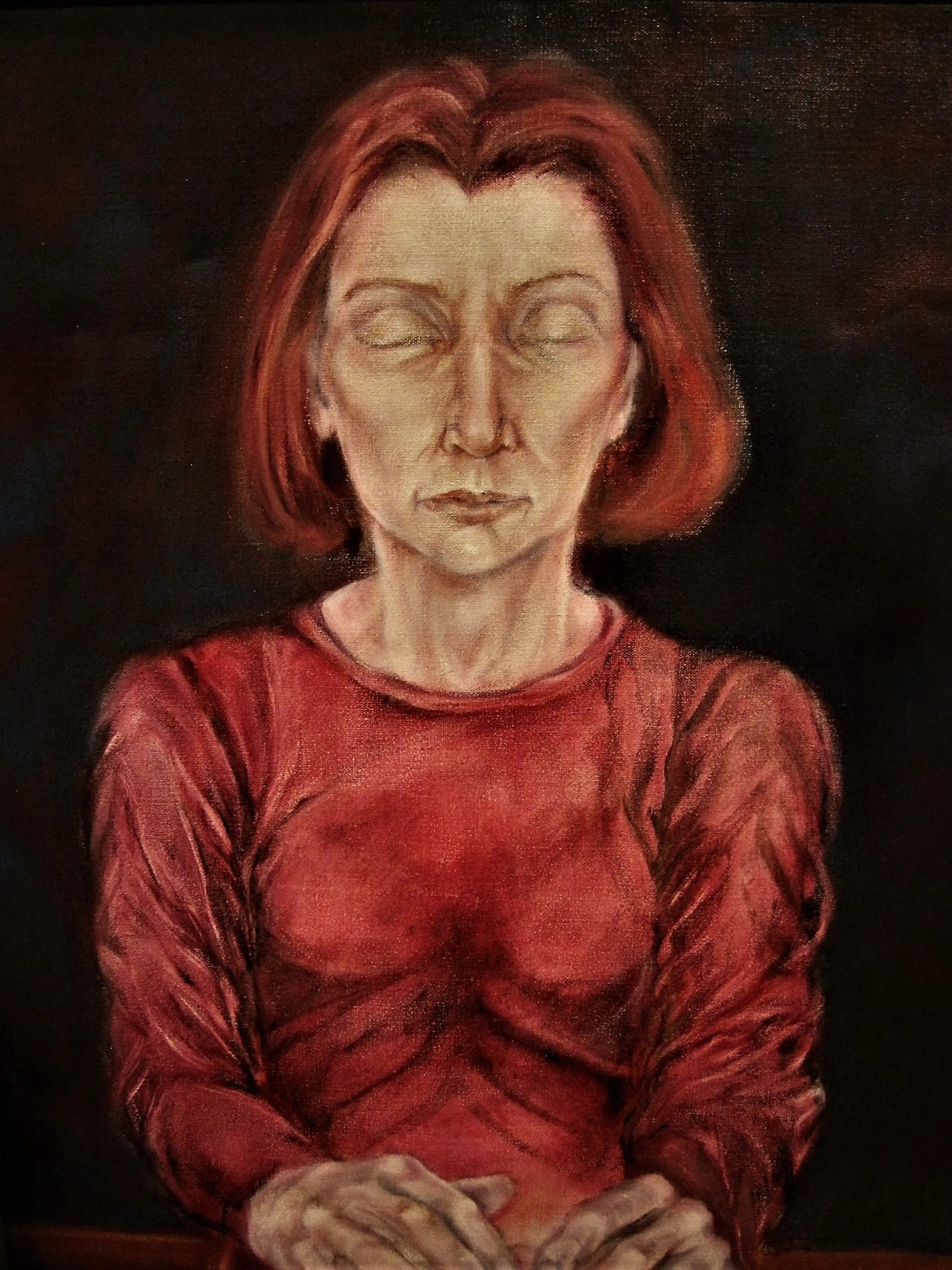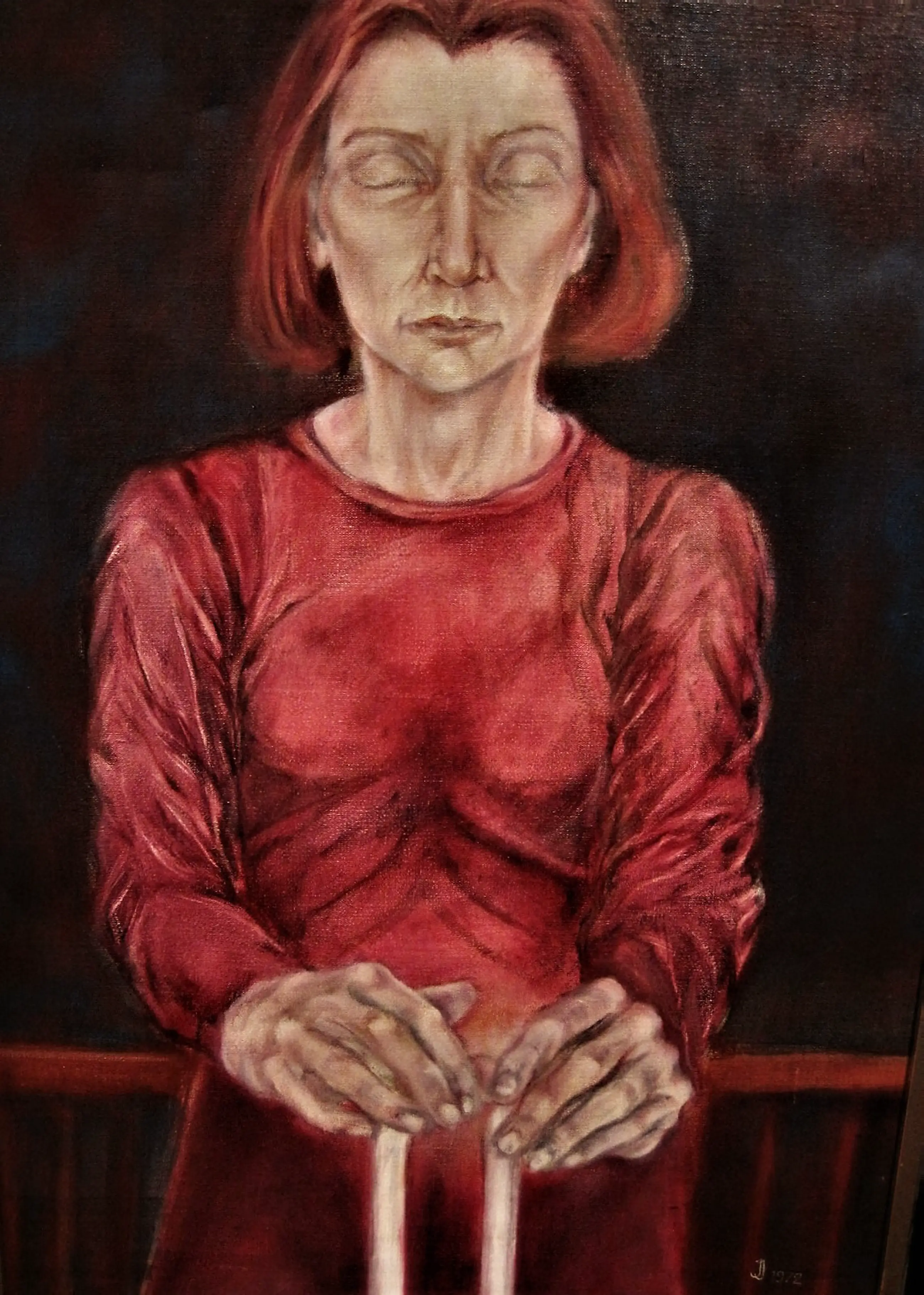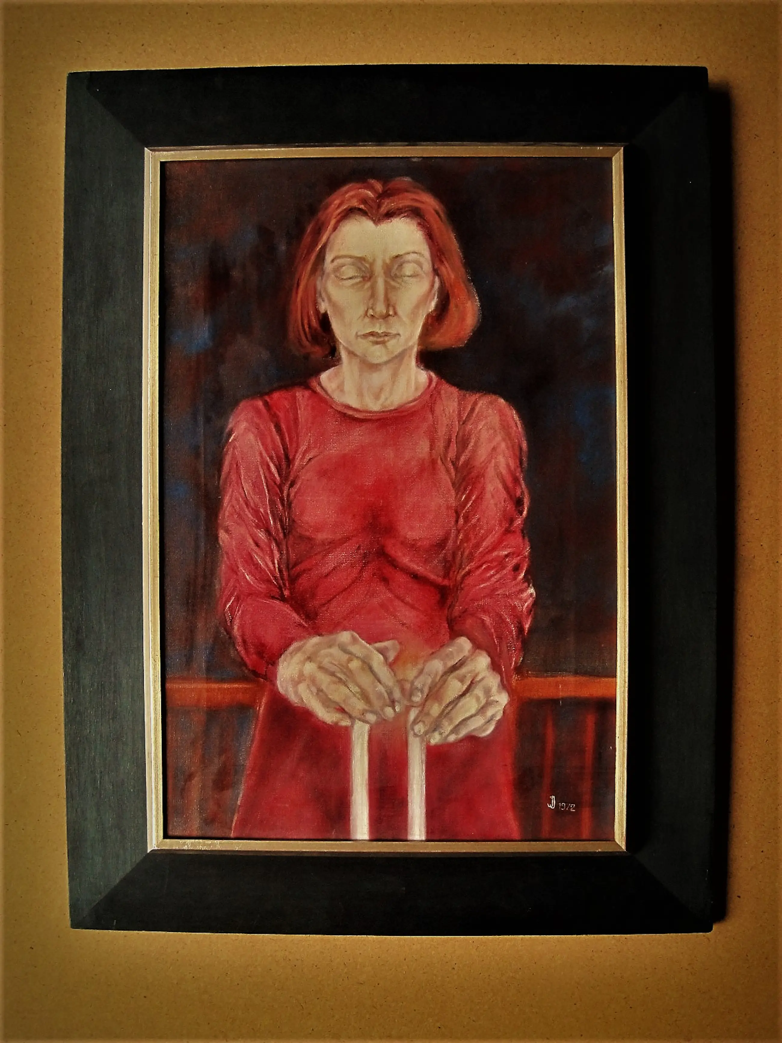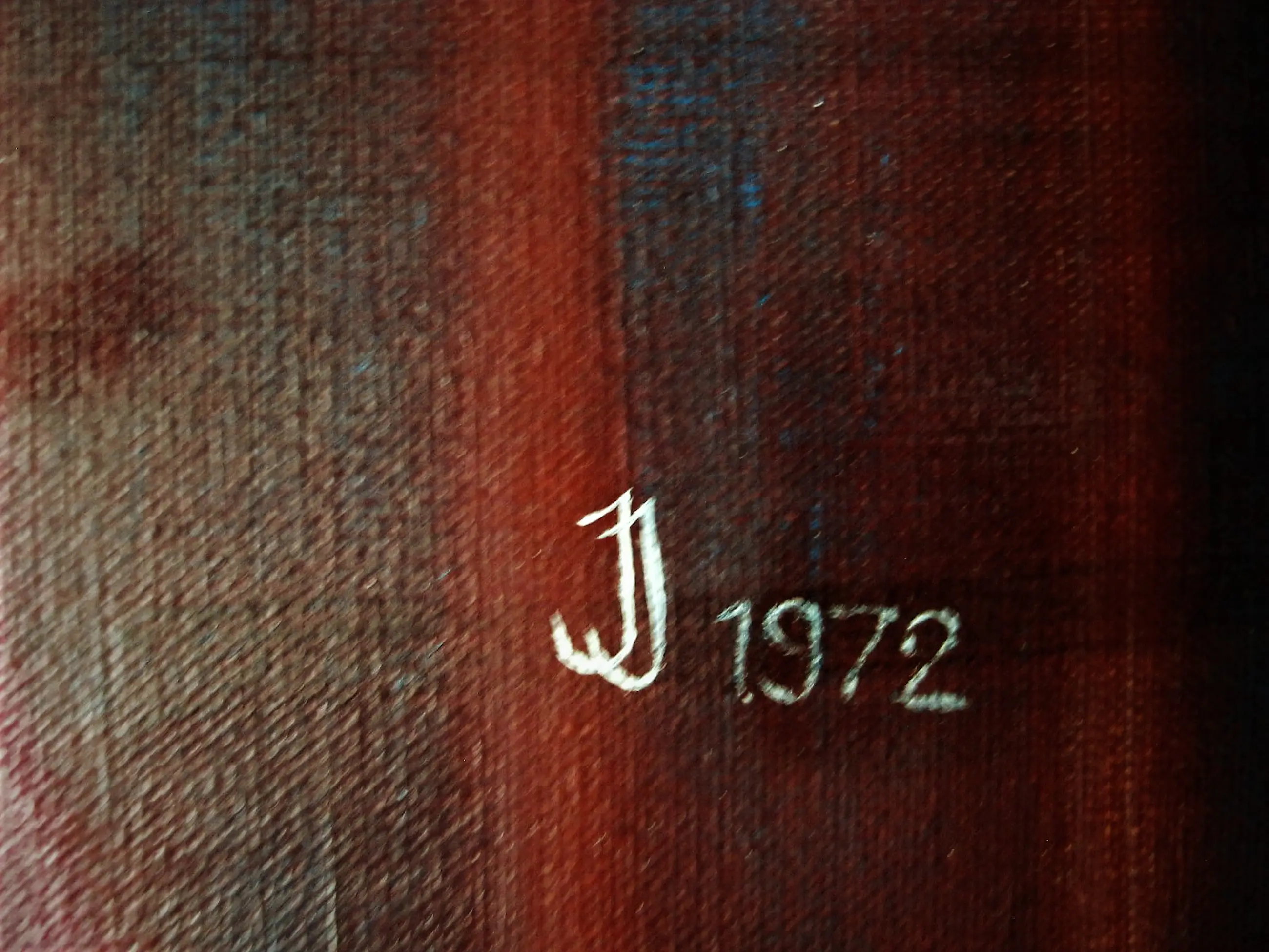 Intrigerend olieverf op doek "vrouw met gesloten ogen in rode jurk". Sterk realistisch geschilderd in de nieuwe Haagse school stijl. Rechtsonder gemonogrammeerd (JJ) en gedateerd (1972). Het schilderij heeft doekmaat 40x60cm en zit in een exclusieve lijst.