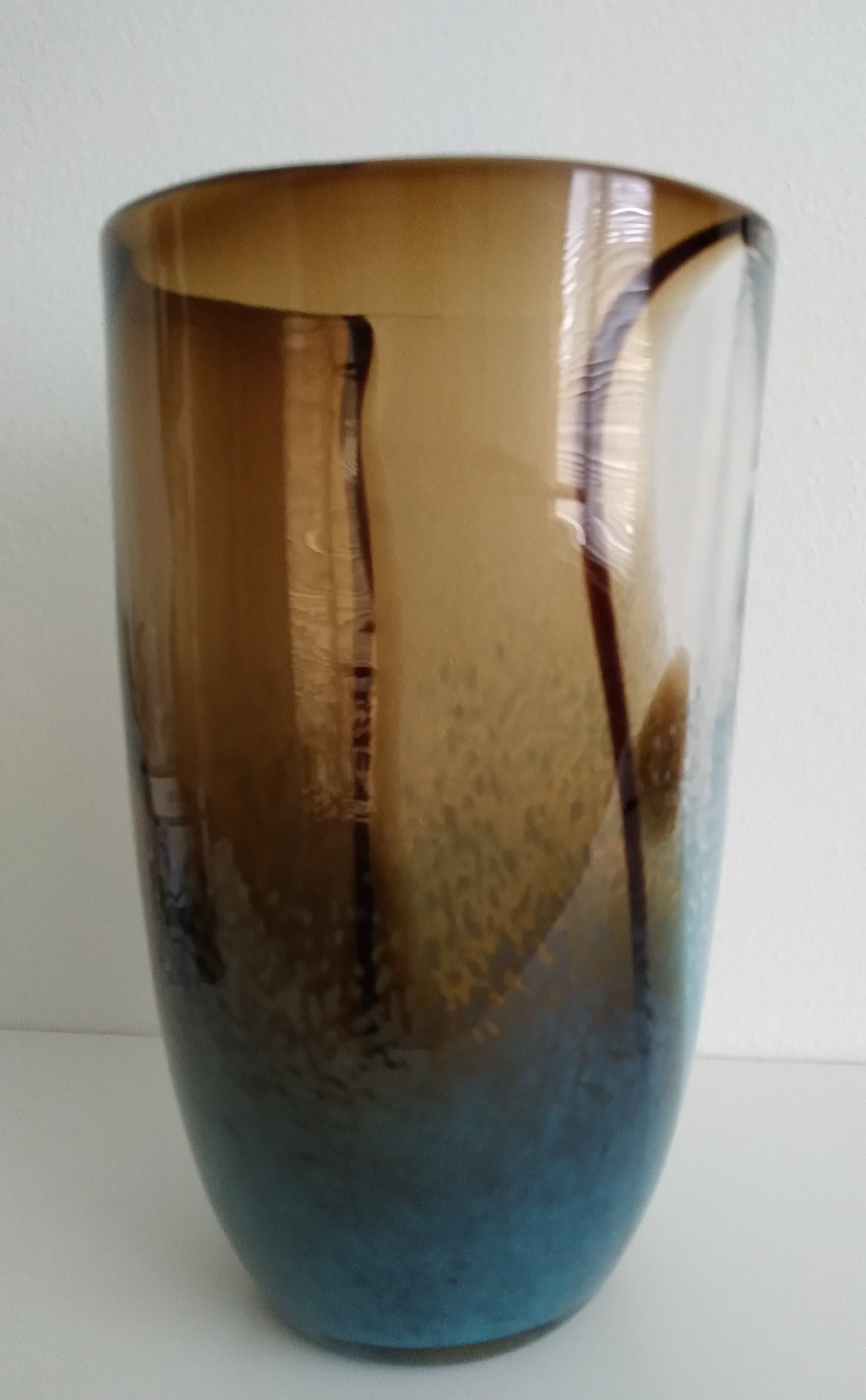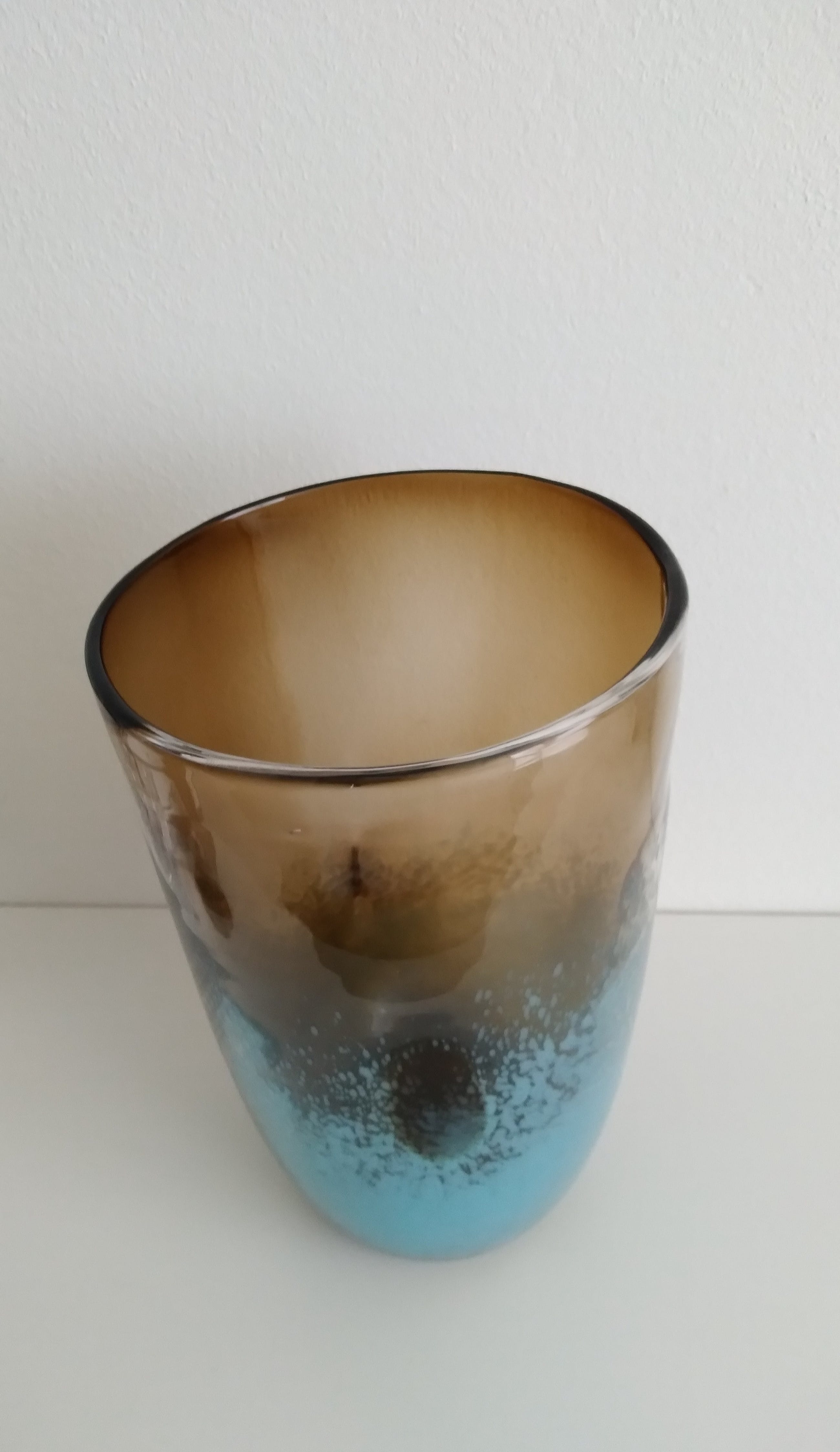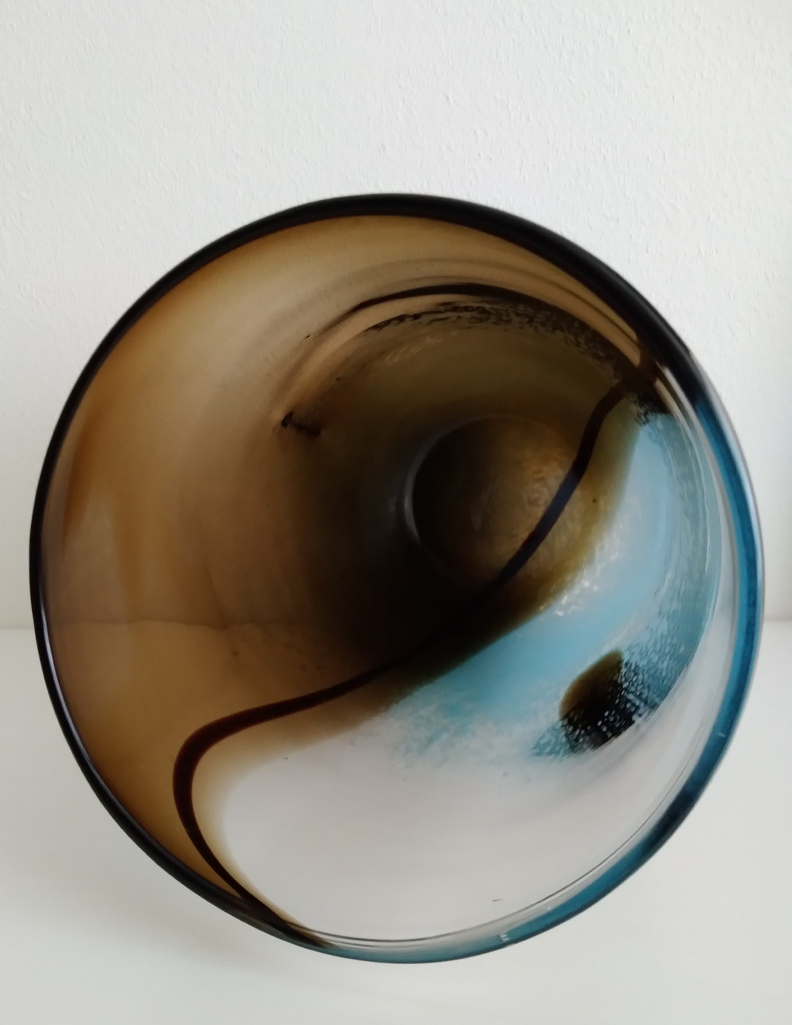 Lichtblauwe bubbels vinden een weg omhoog in helder bruin glas en een sierlijke baan loopt door de binnenkant van de vaas.