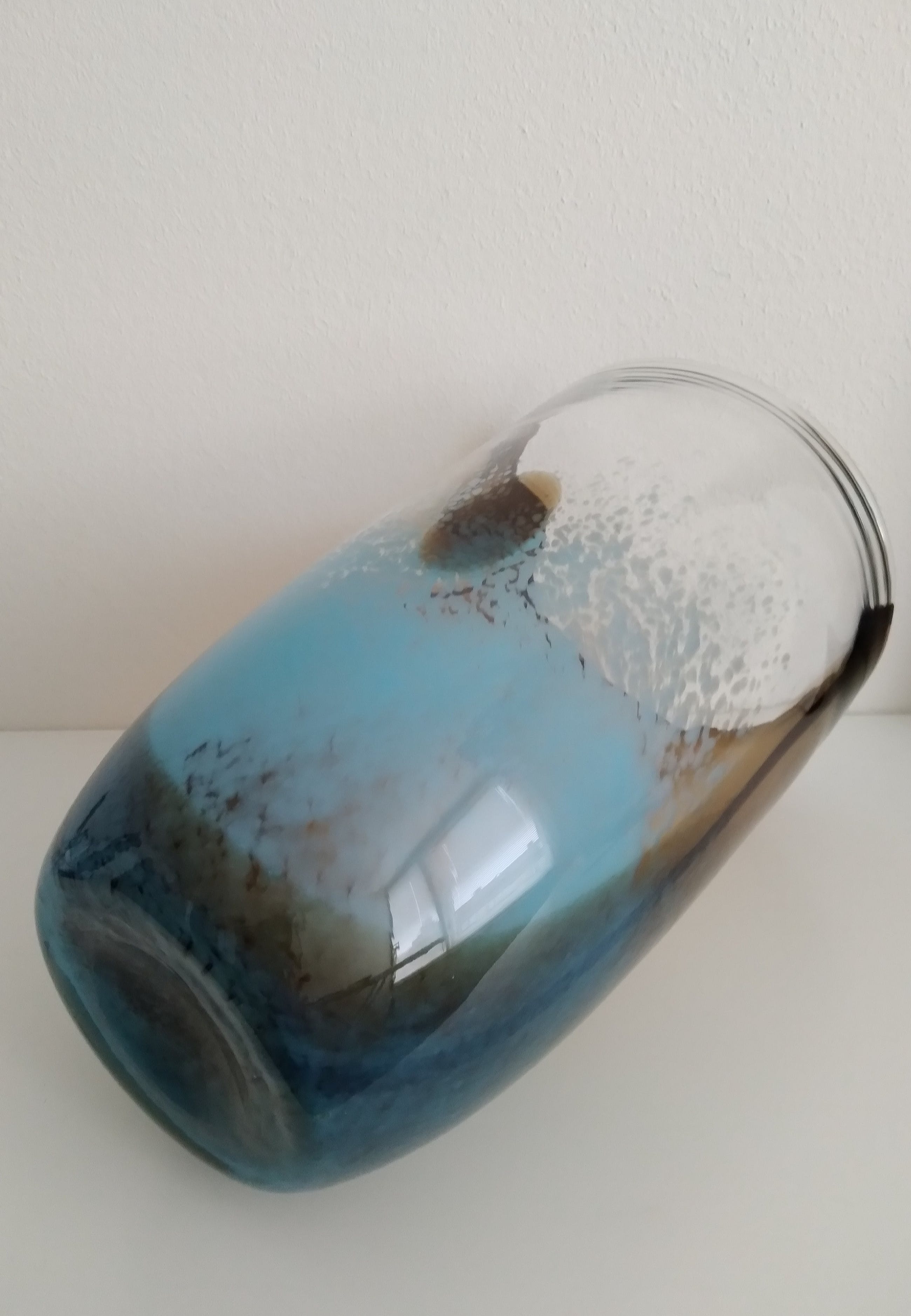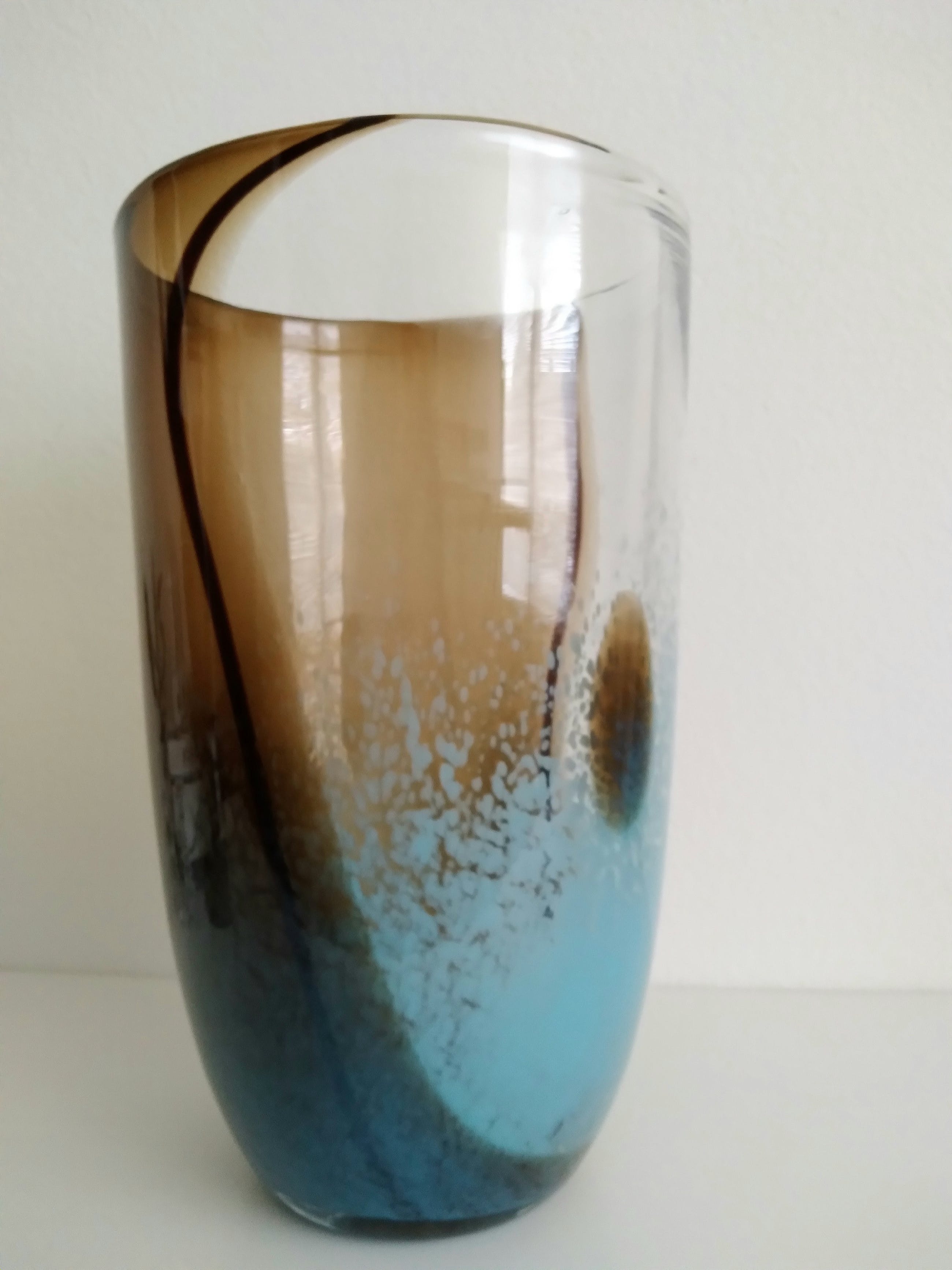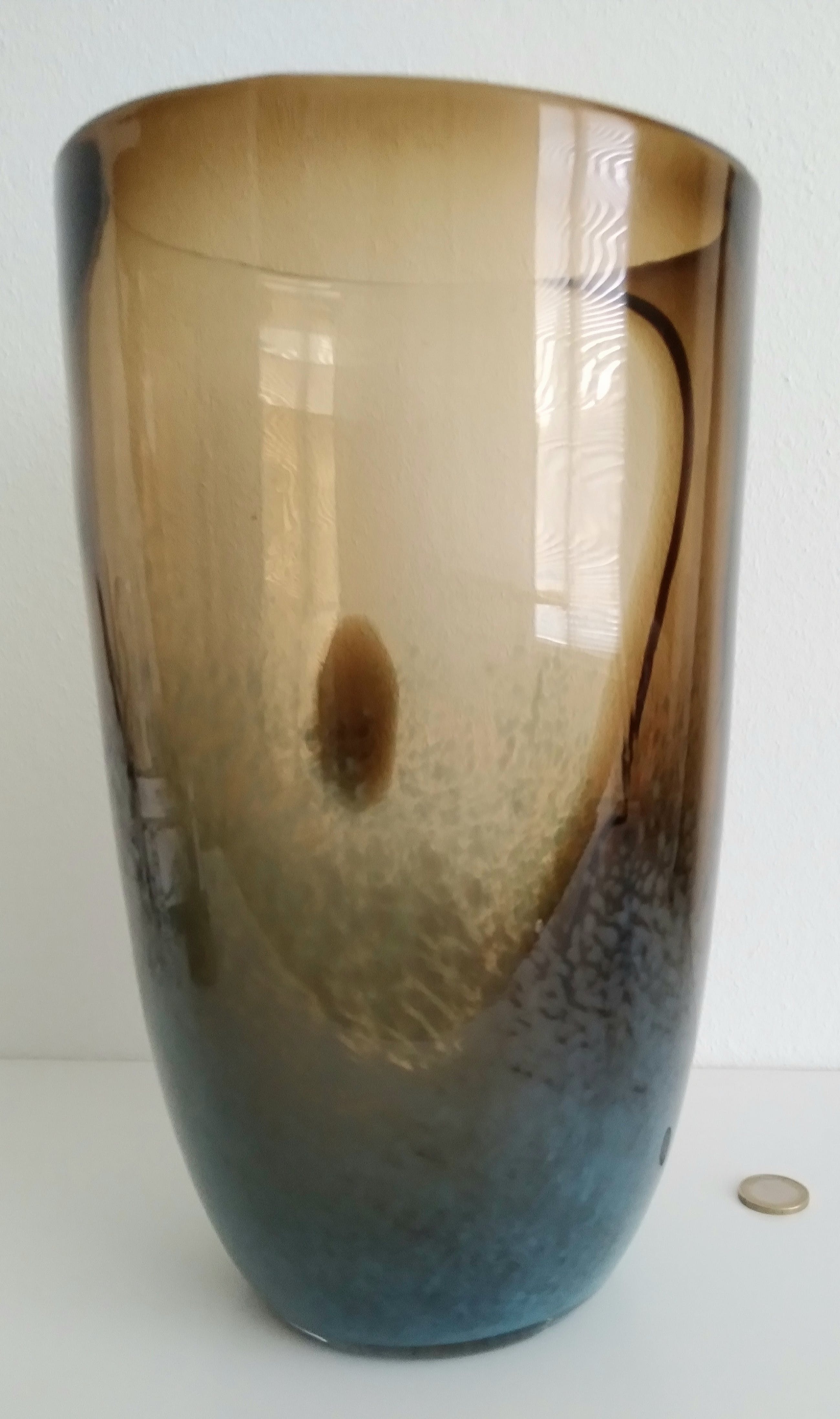 Lichtblauwe bubbels vinden een weg omhoog in helder bruin glas en een sierlijke baan loopt door de binnenkant van de vaas.