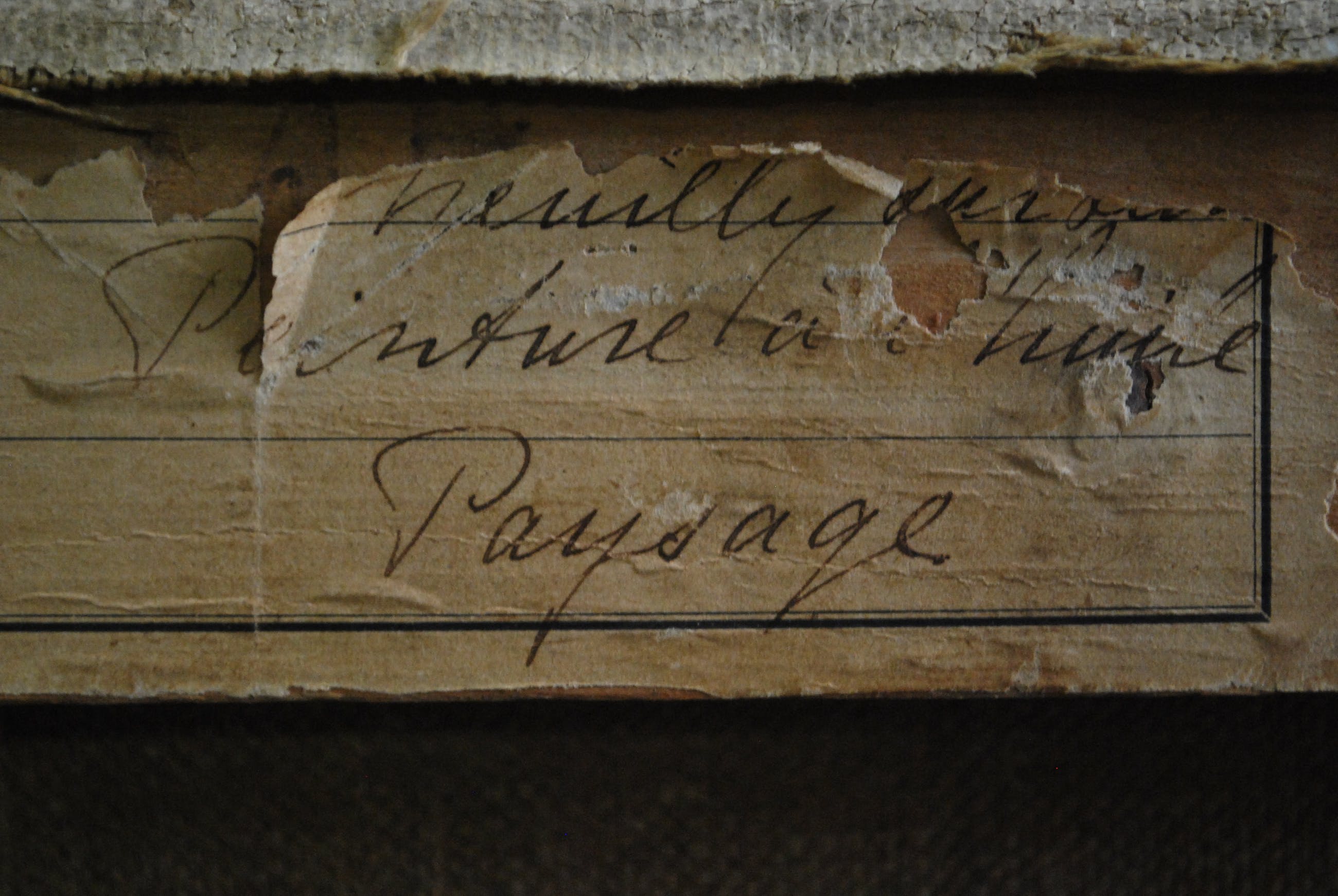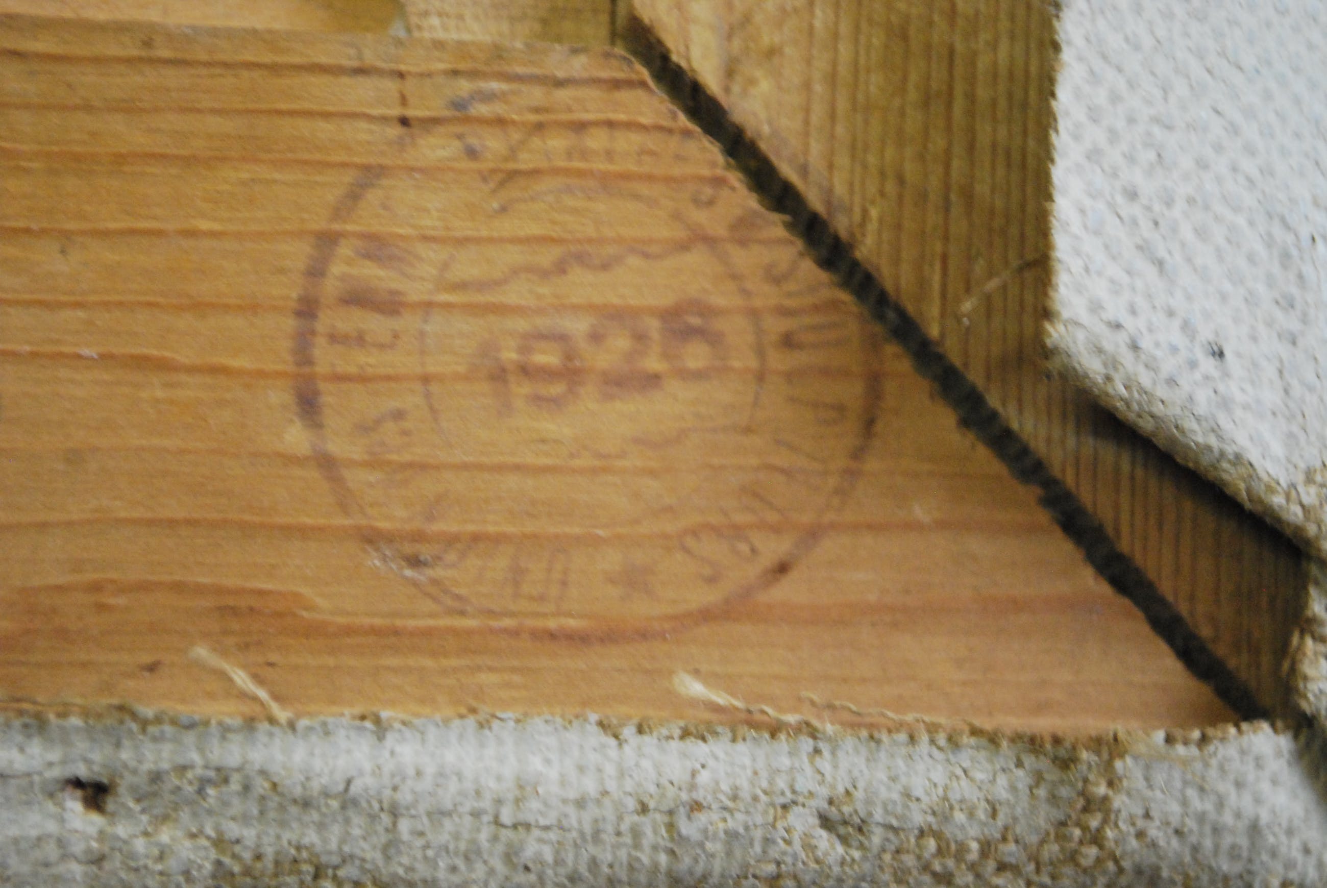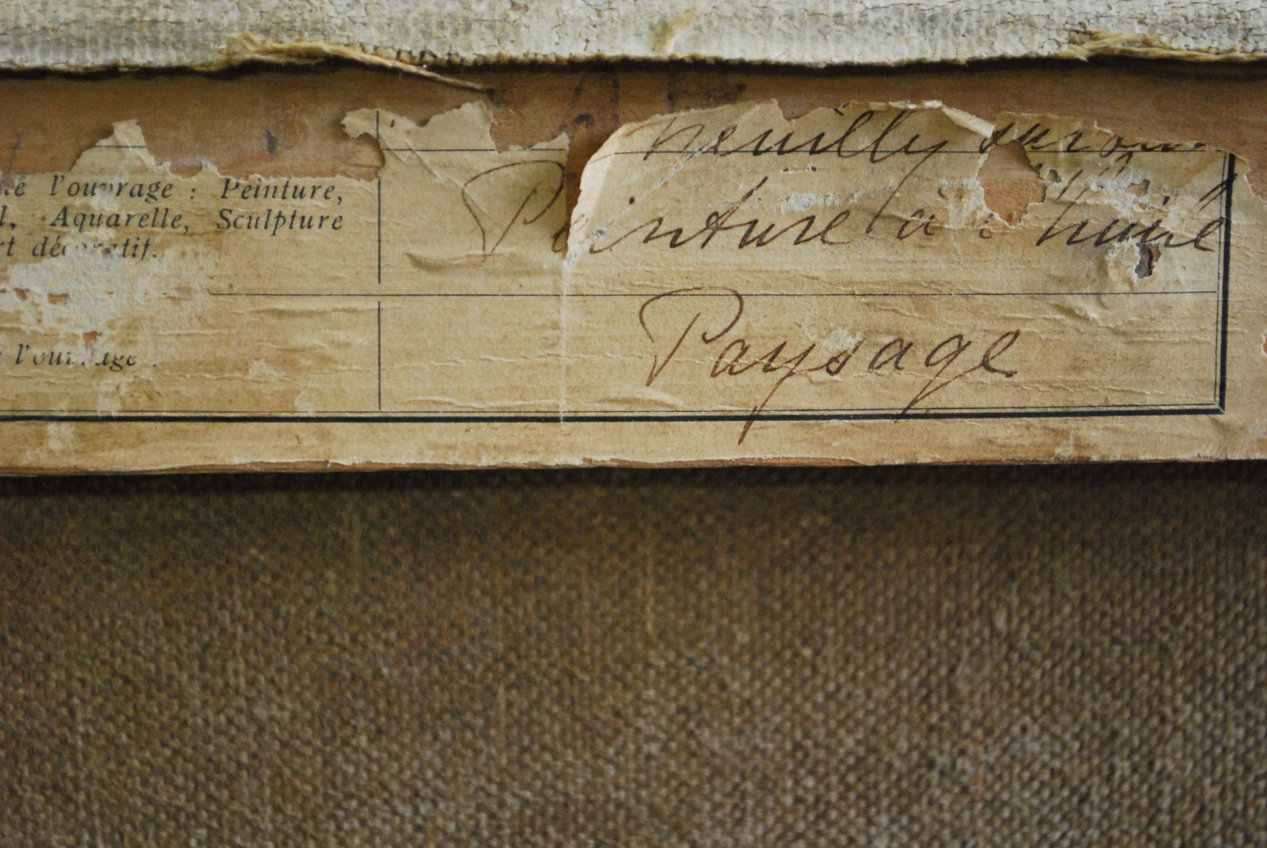Mooi doekje met een Frans landschap/ dorpsgezicht 1926 Op het spieraam een oud etiket met gedeeltelijke tekst