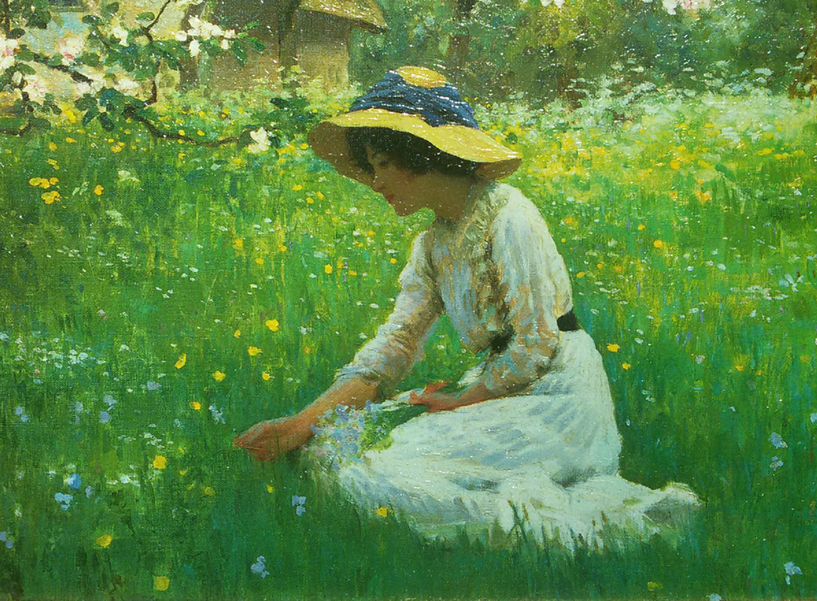 Leuk olieverf schilderijtje in mooie lijst. Dacht ik ook, maar het bleek een geverniste print op doek te zijn. Nieuw, geen signatuur. In zijn soort wel goed gedaan, het lijkt echt geschilderd, en het is absoluut een idyllisch tafereeltje. Leuk werkje om een sombere plek in huis op te vrolijken en anders voor het lijstje alleen al koopwaardig.