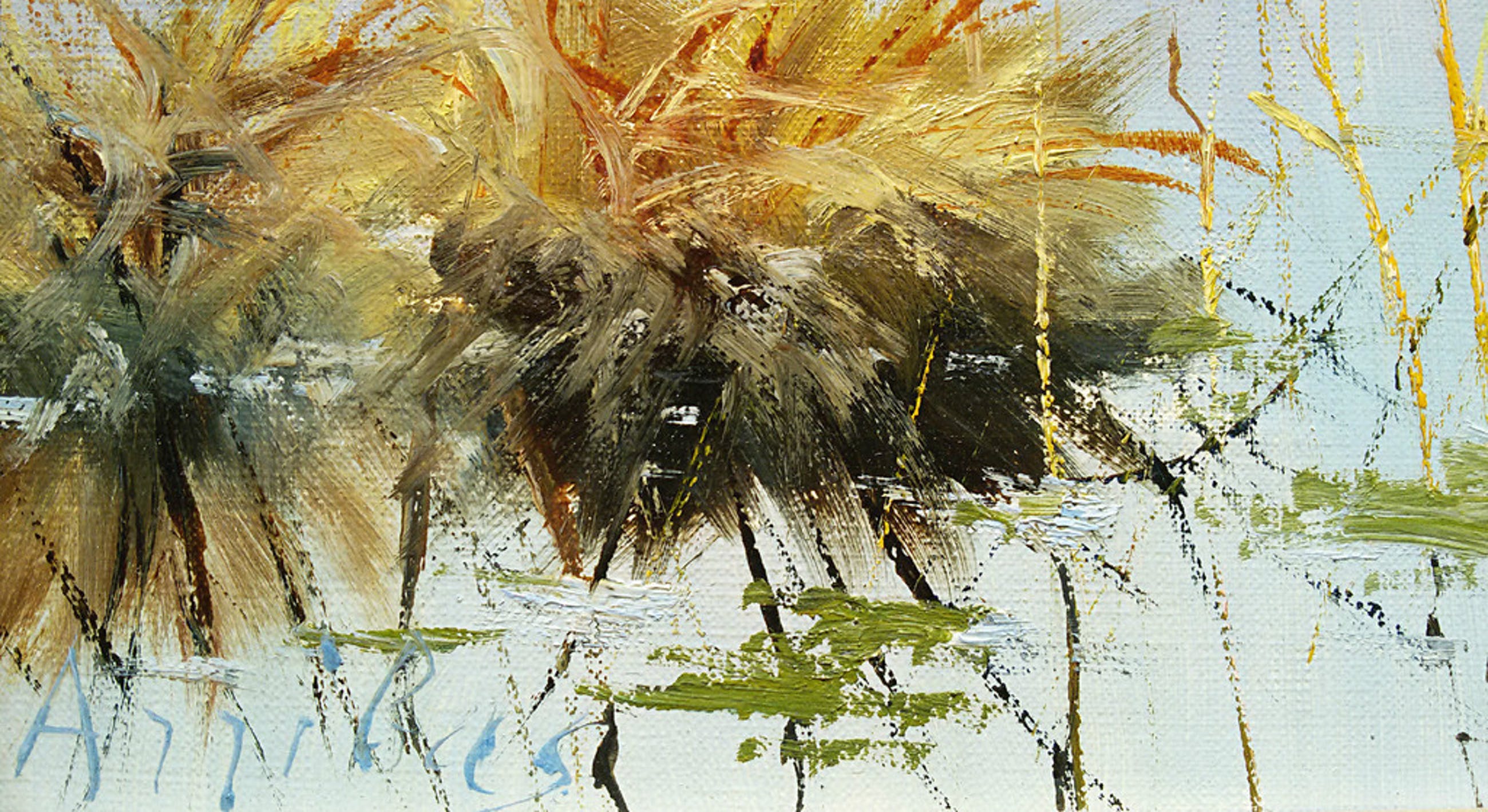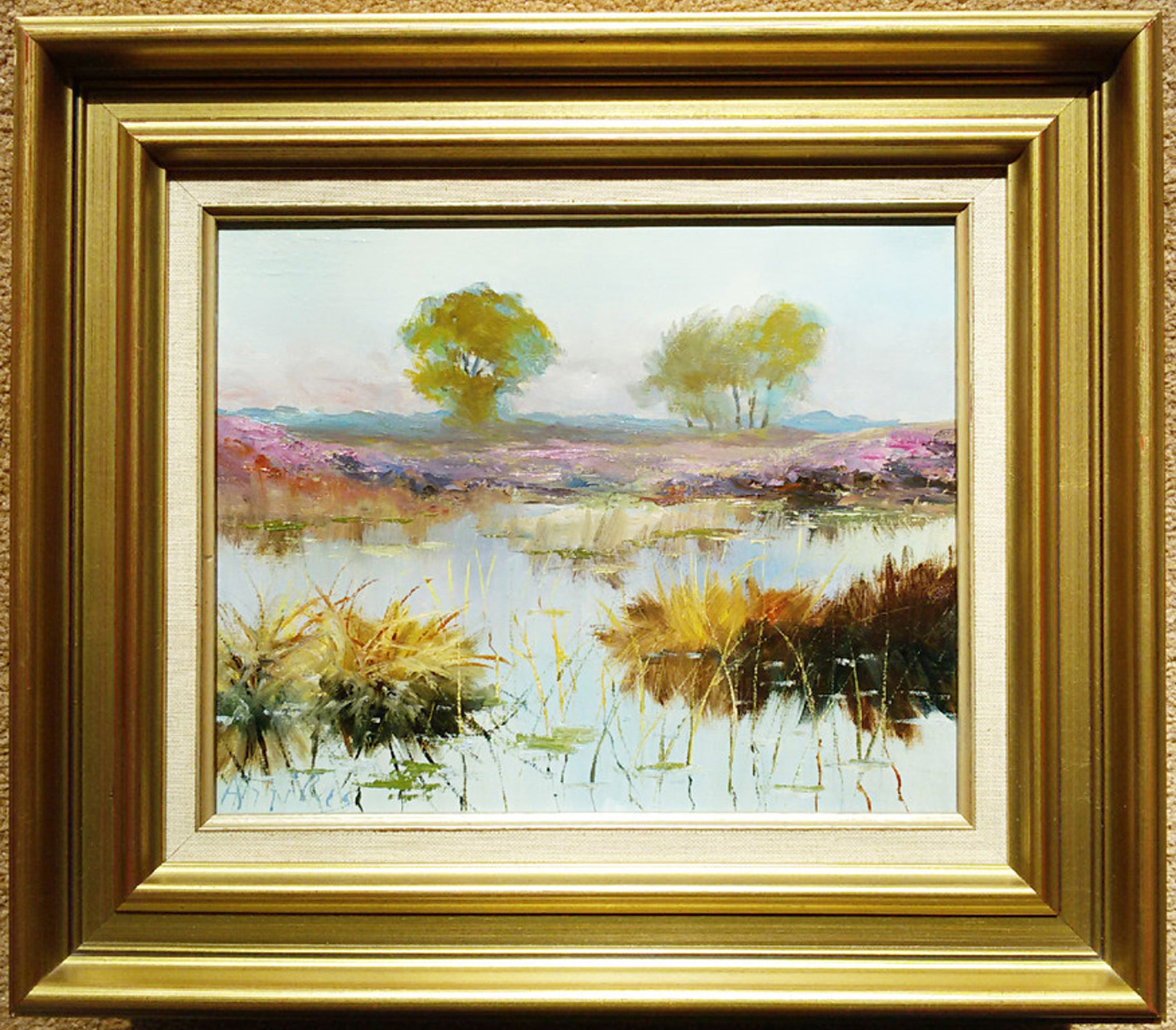Vlot, impressionistisch landschapje in mooie lijst. Gesigneerd linksonder maar voor mij niet te ontcijferen, nogmaals gesigneerd in verso maar dat helpt ook niet veel. Het is niet oud maar is absoluut alleraardigst geschilderd. In goede conditie; verf en lijst zijn uitstekend maar er zit een putje, geen gaatje, in het doek (midden tussen de bomen). Leuk werkje om een sombere plek in huis op te vrolijken.