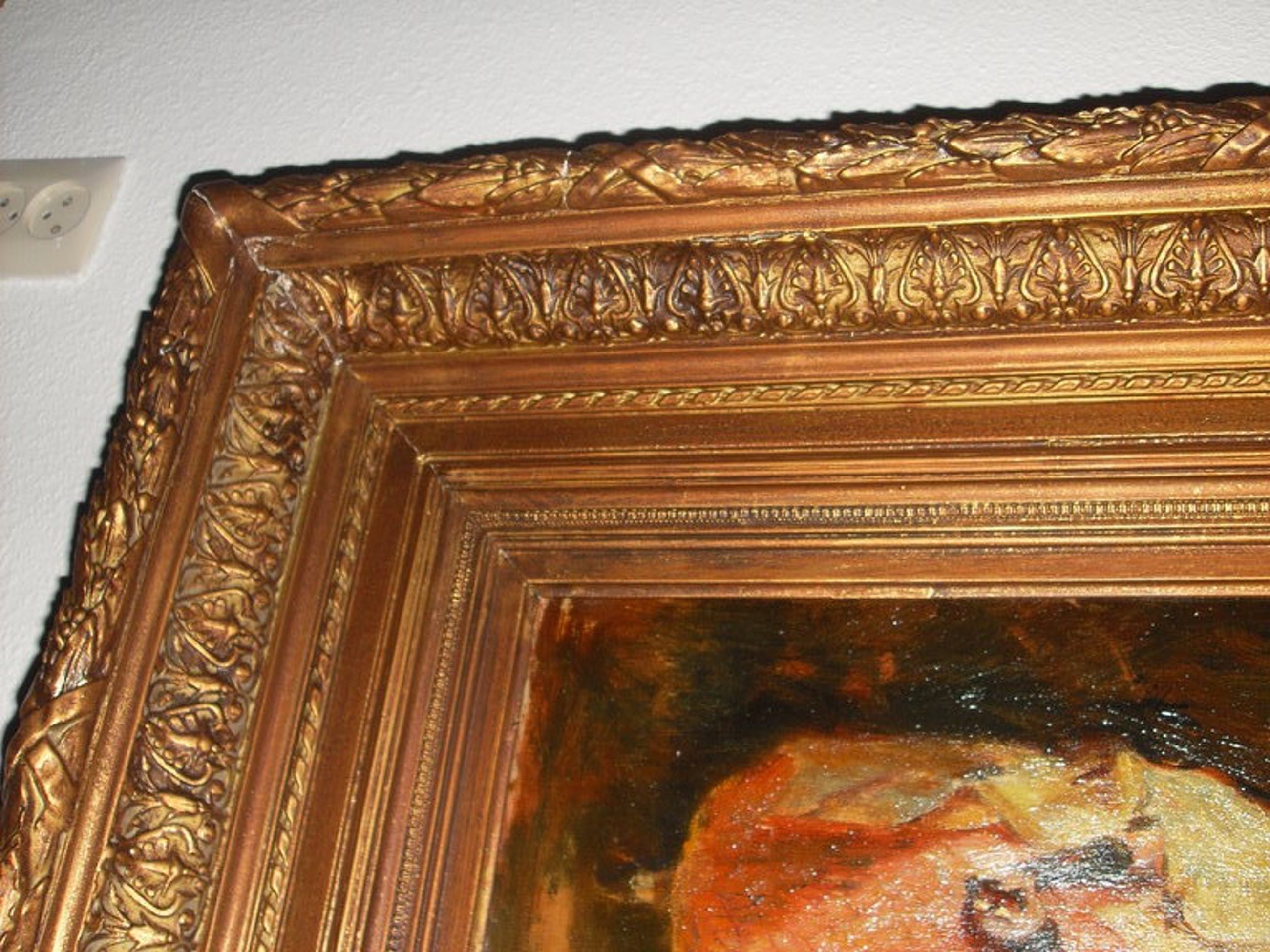 Afm. 55/45 met KAPITALE VEREN lijst +/- 20 cm. breed Conditie goed Het schilderij moet worden afgehaald i.v.m. het gewicht en breekbaarheid van lijst