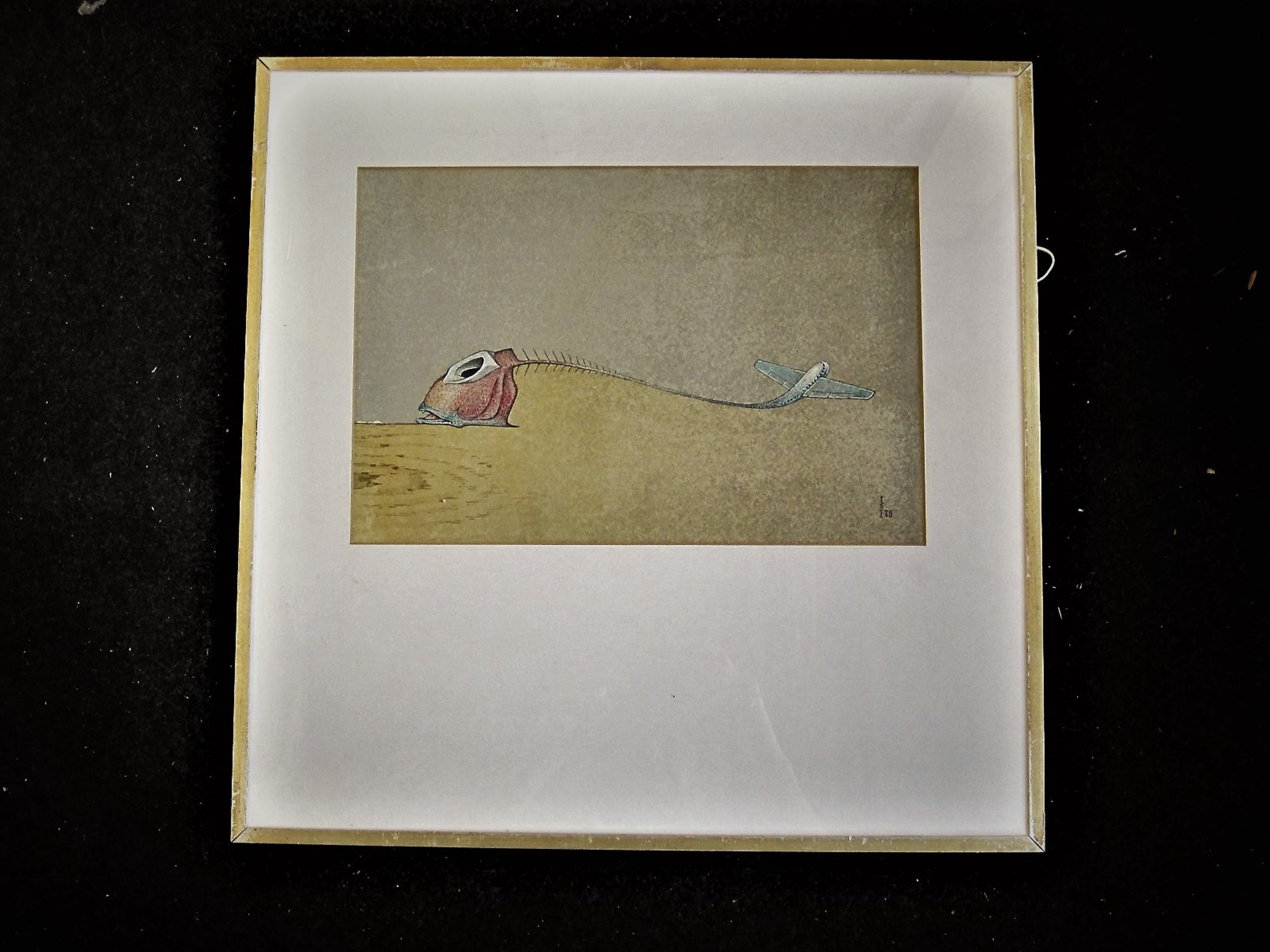 Niet of onleesbaar gesigneerd - Galerie Hofstee F"furt - handgekleurde Ets - Vis en Vliegtuig - gesigneerd kopen? Bied vanaf 10!