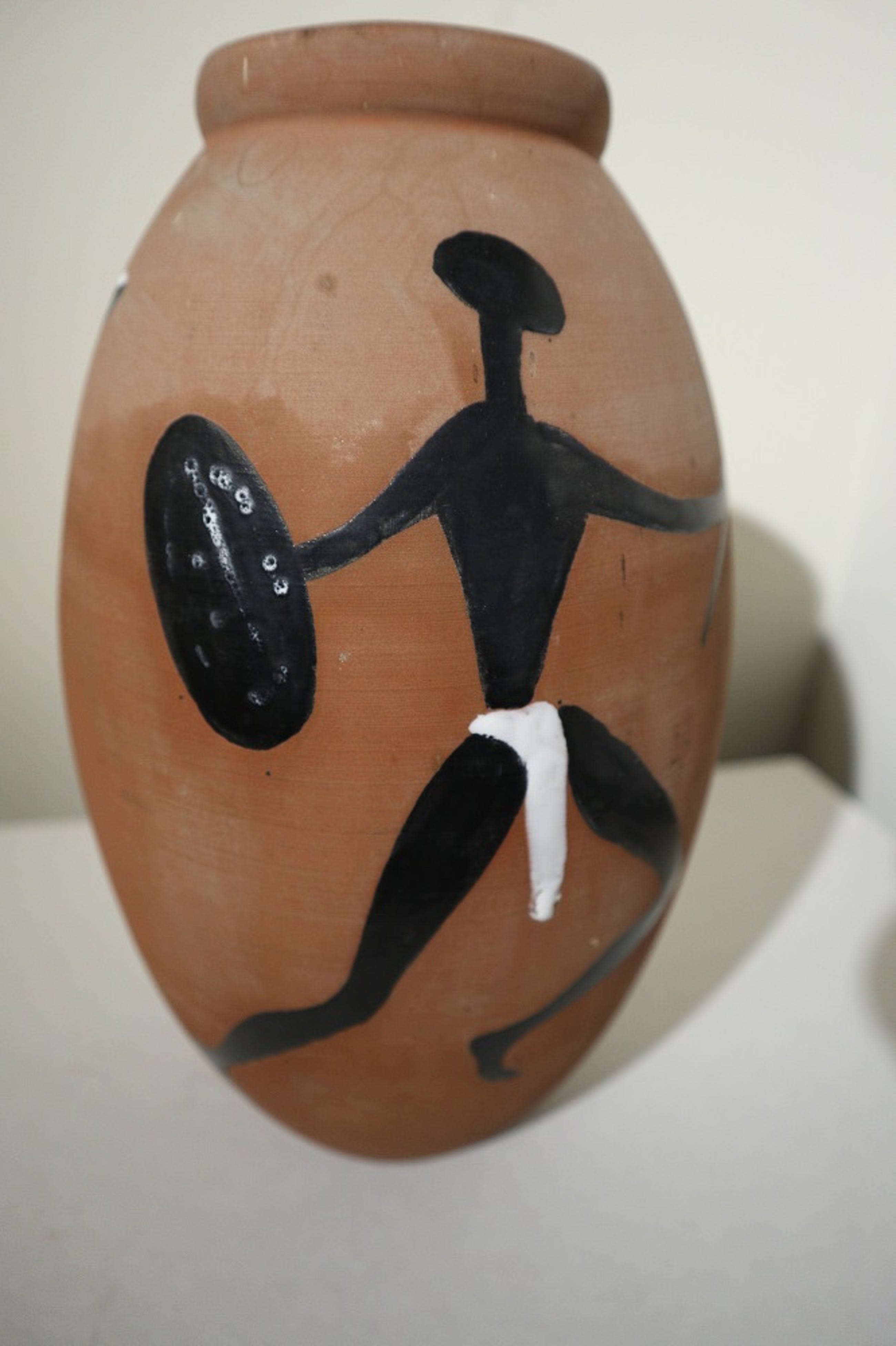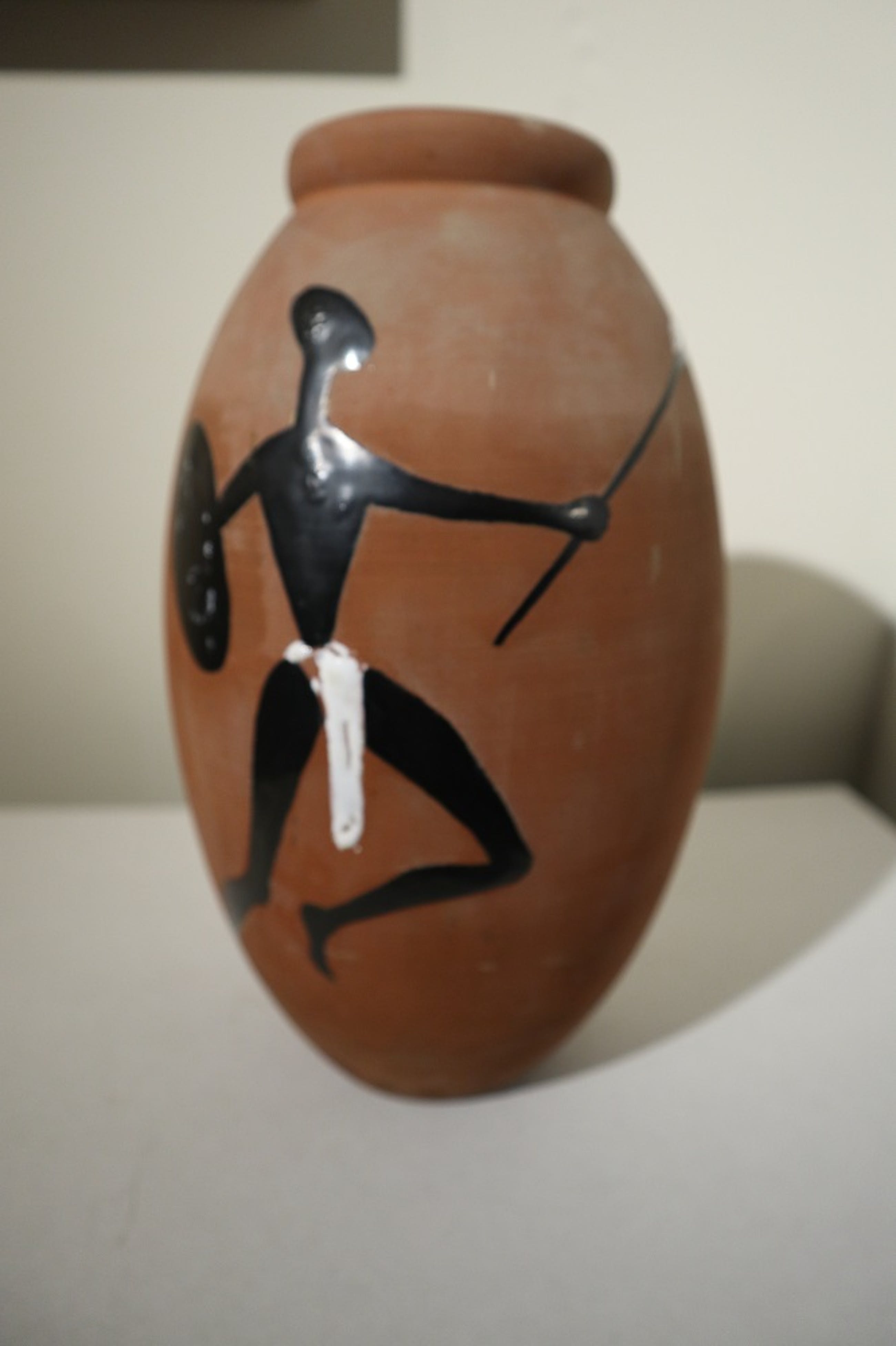 Voor mij onduidelijke signatuur aan de onderzijde. Komt uit de aardewerkfabriek Schoonhoven. Aan twee zijden beschilderd, geglazuurd en gebakken.