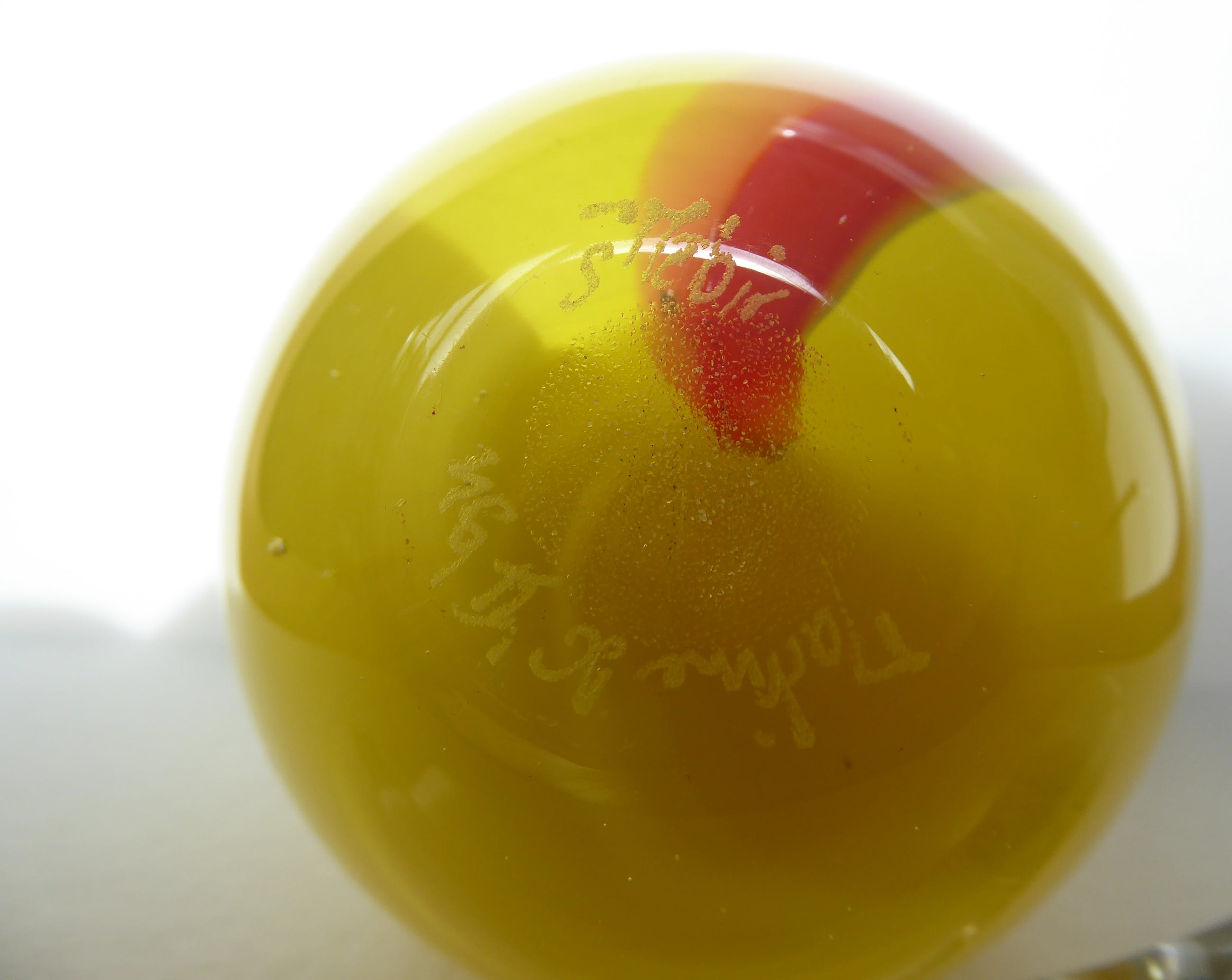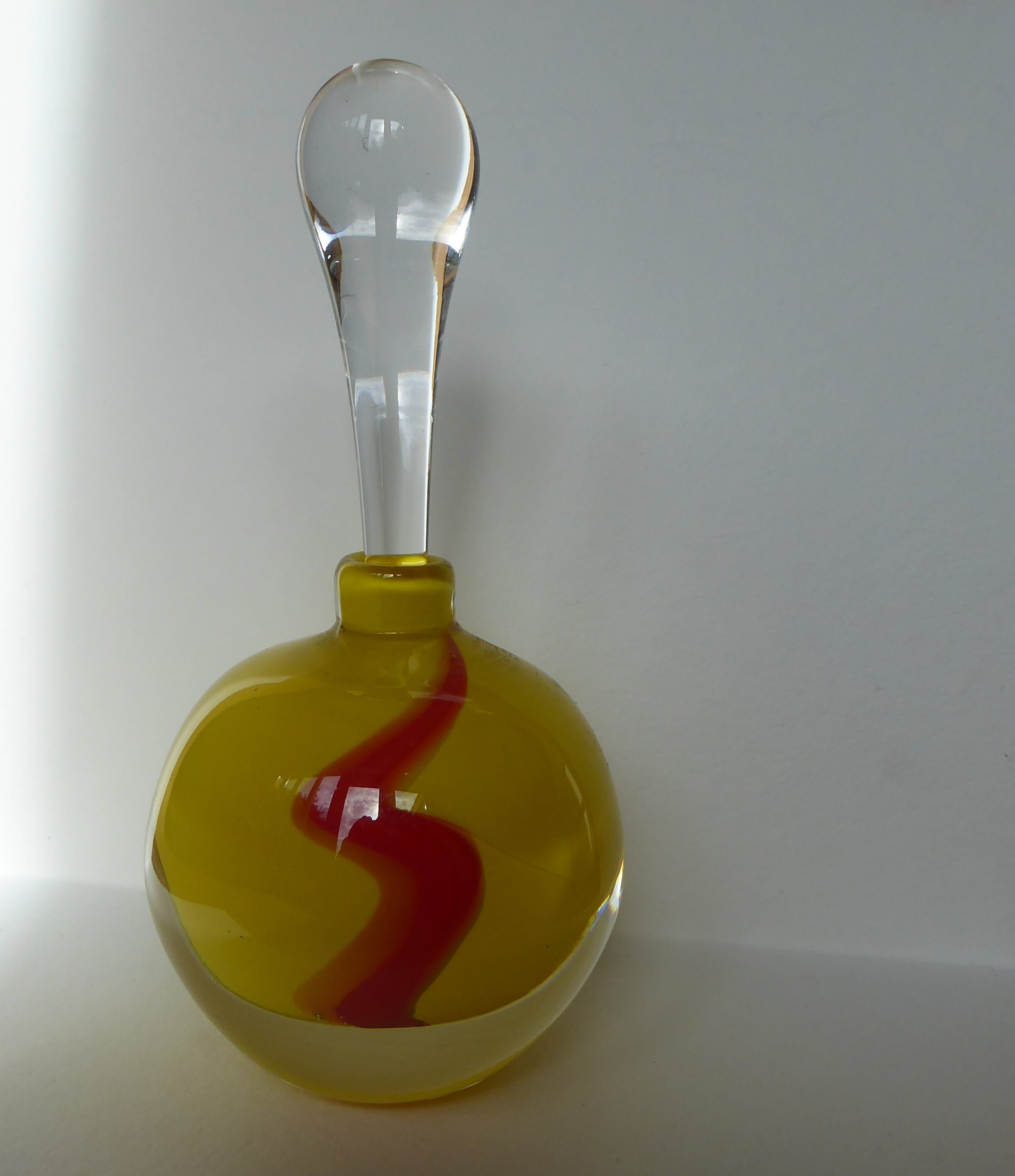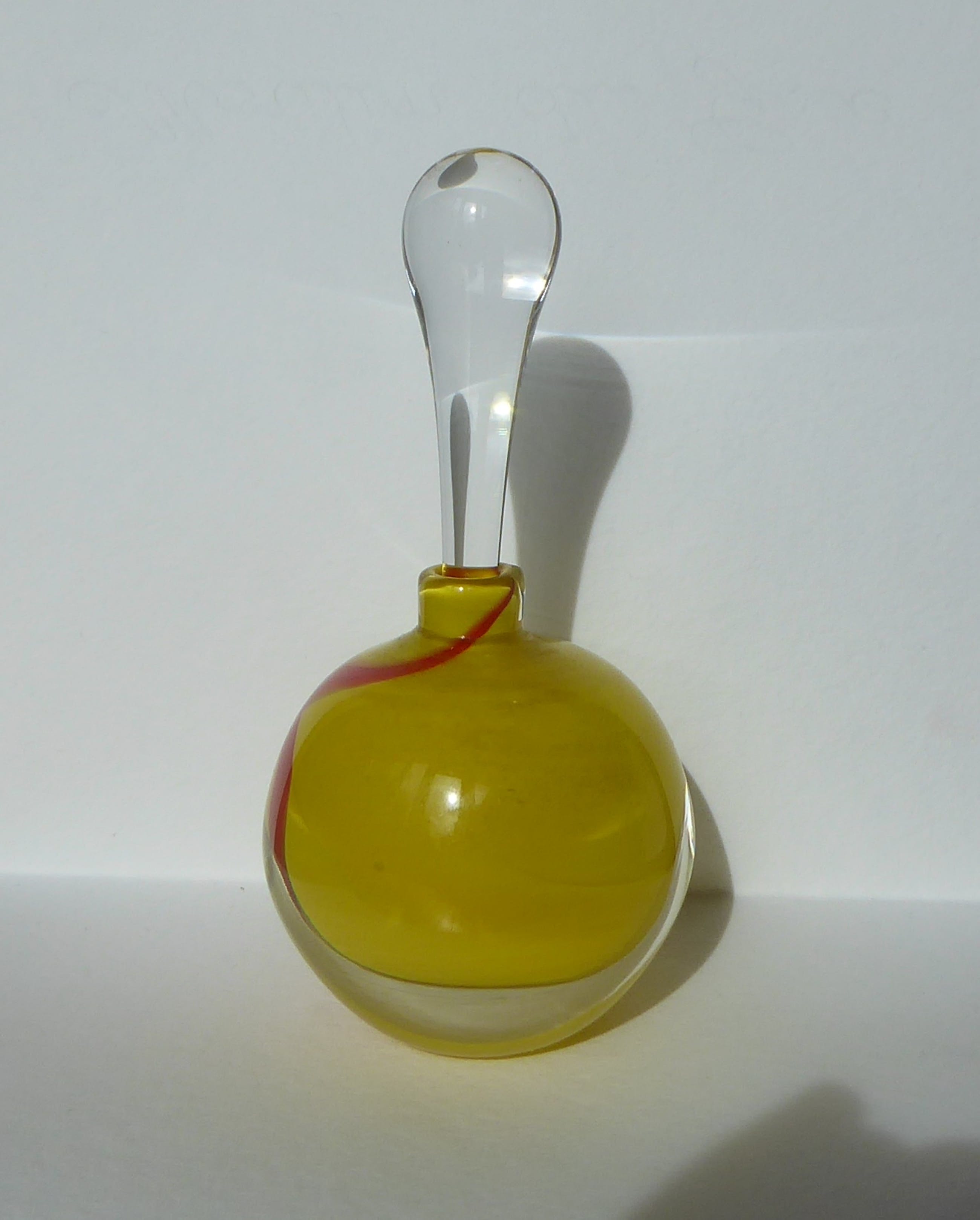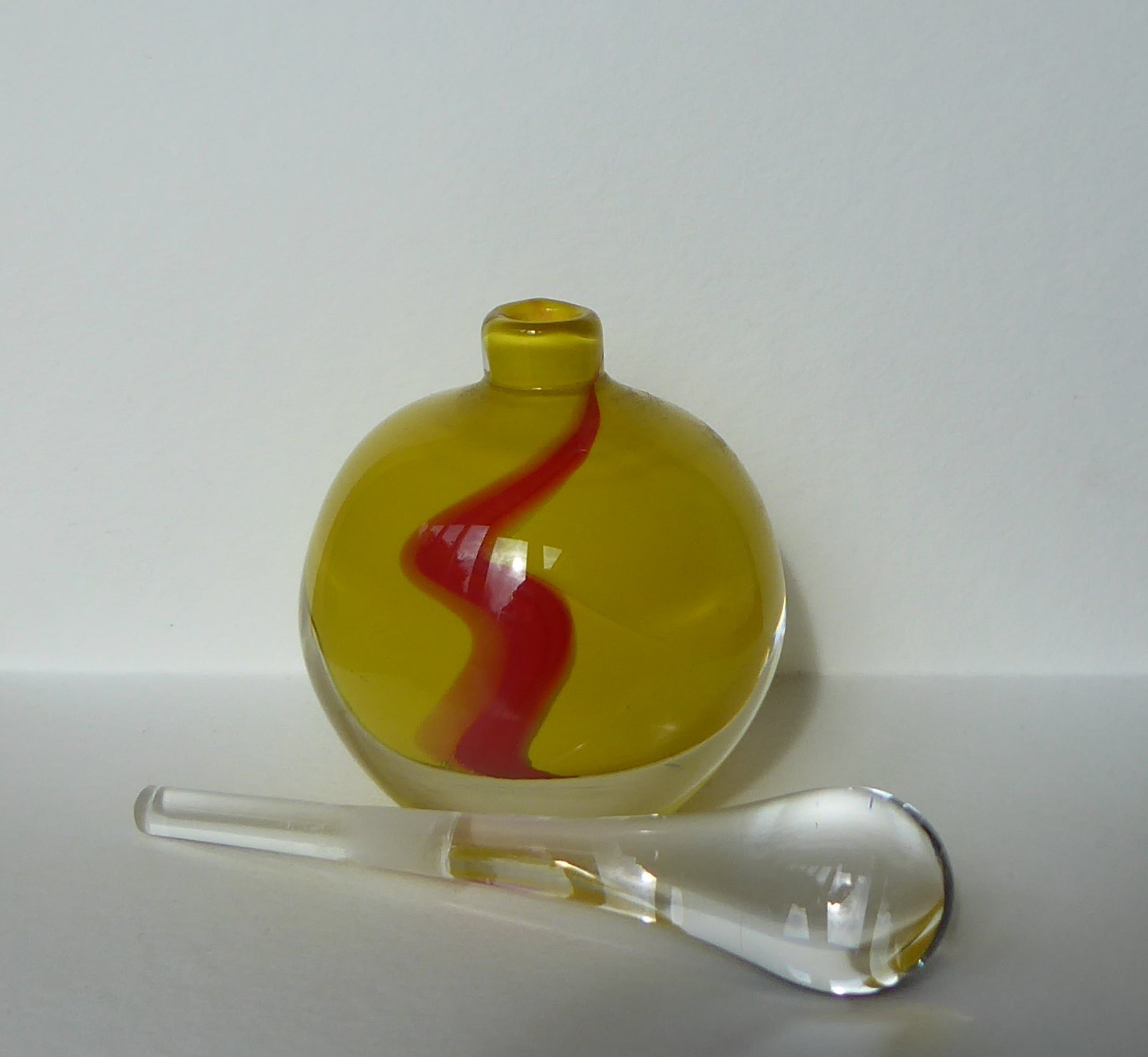 Kleurrijk flesje met losse langwerpige dop. Murano?Opvallend zwaar.Gesigneerd met Martine H of K, 1994