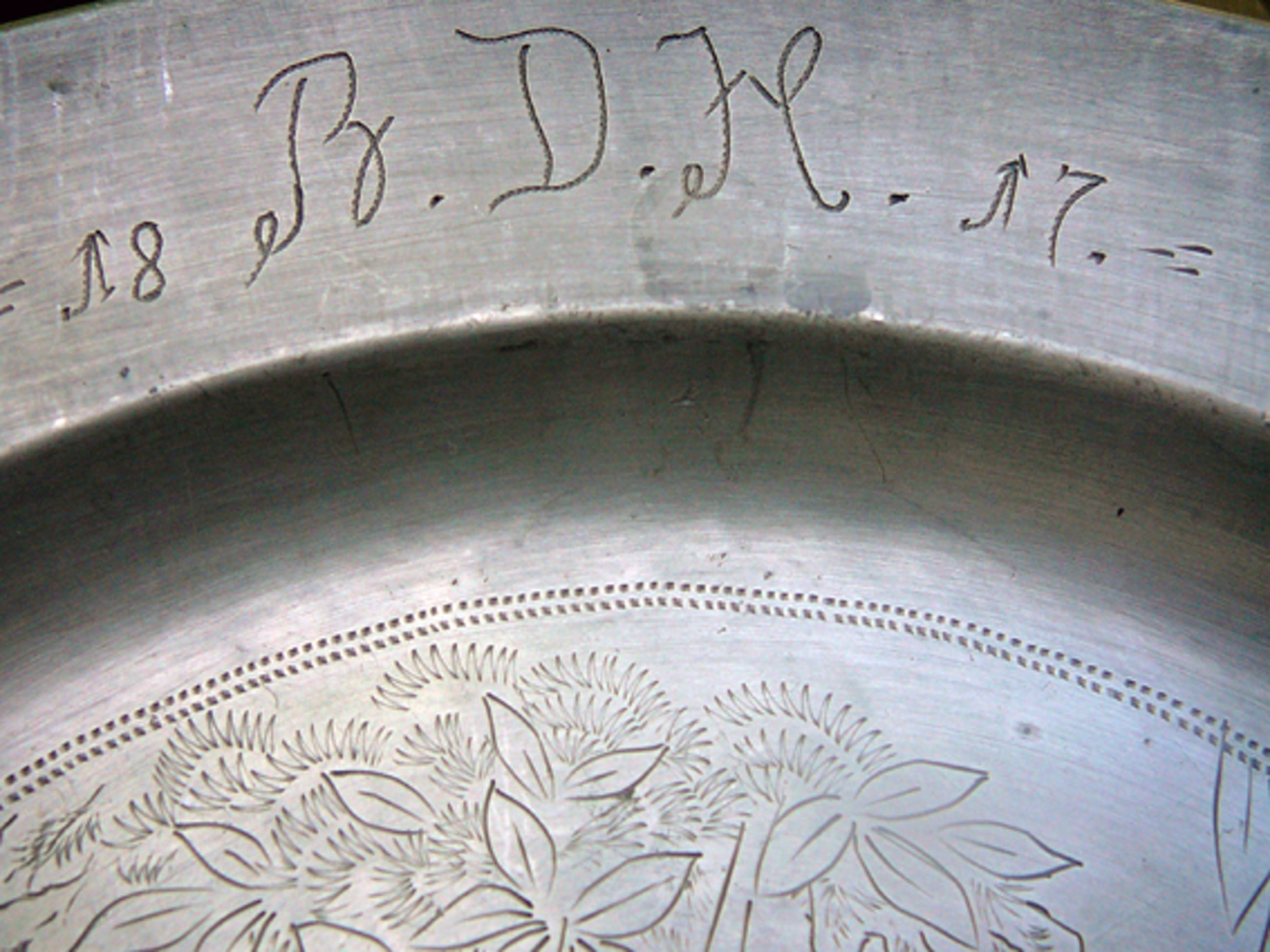 Vroeg 19e eeuwse tinnen schaal met in de bodem een afbeelding van Adam en Eva in het paradijs. In de rand de tekst B.D.H. 1817. Aan de onderzijde een engelenmerk met weegschaaltje en datering 1724. Herkomst vermoedelijk Duitsland. Doorsnede 36 cm.Het werk kan uitsluitend afgehaald worden in onze Emmaus-winkel in Utrecht-Parkwijk. Voor openingstijden zie onze website.