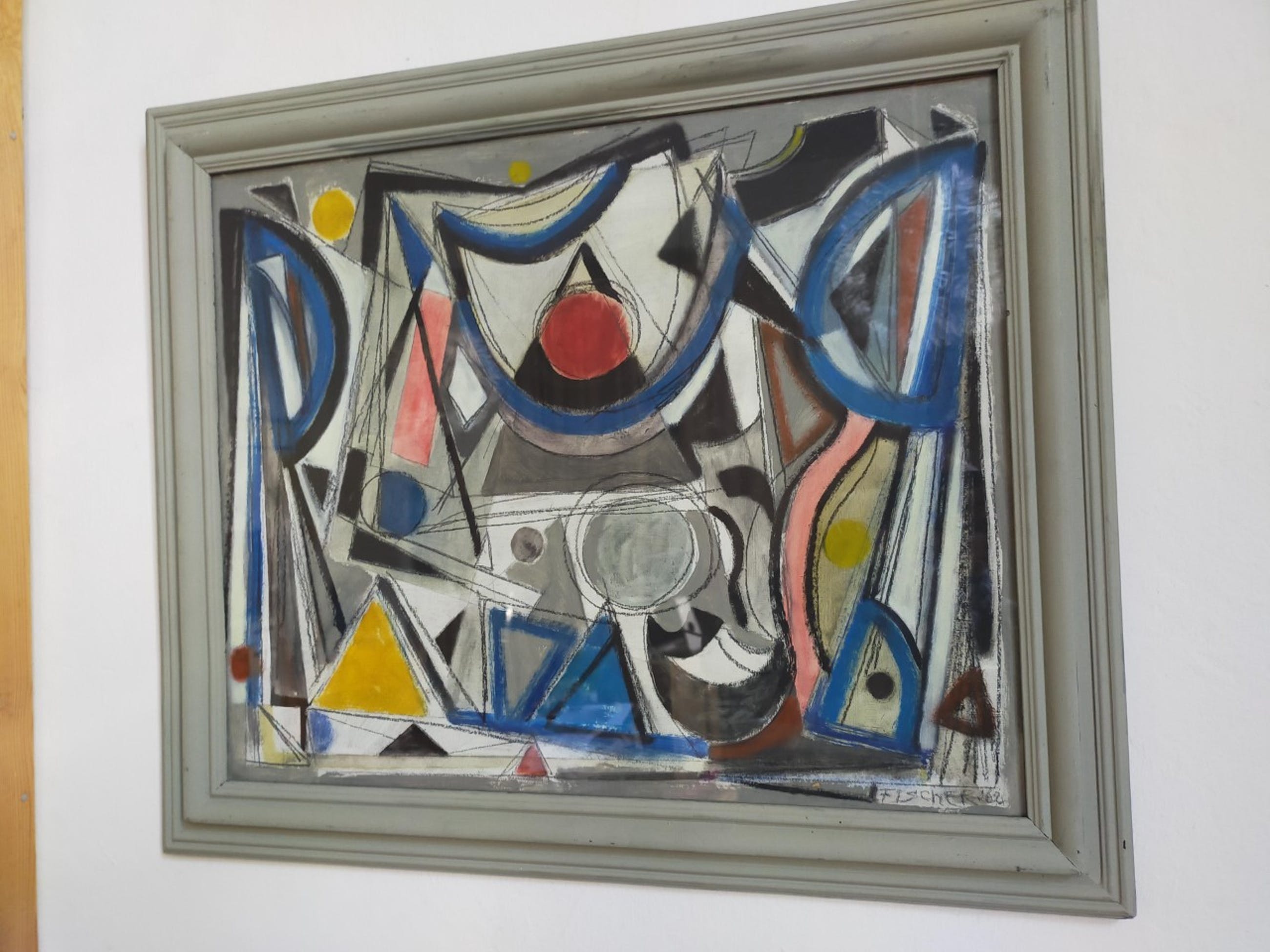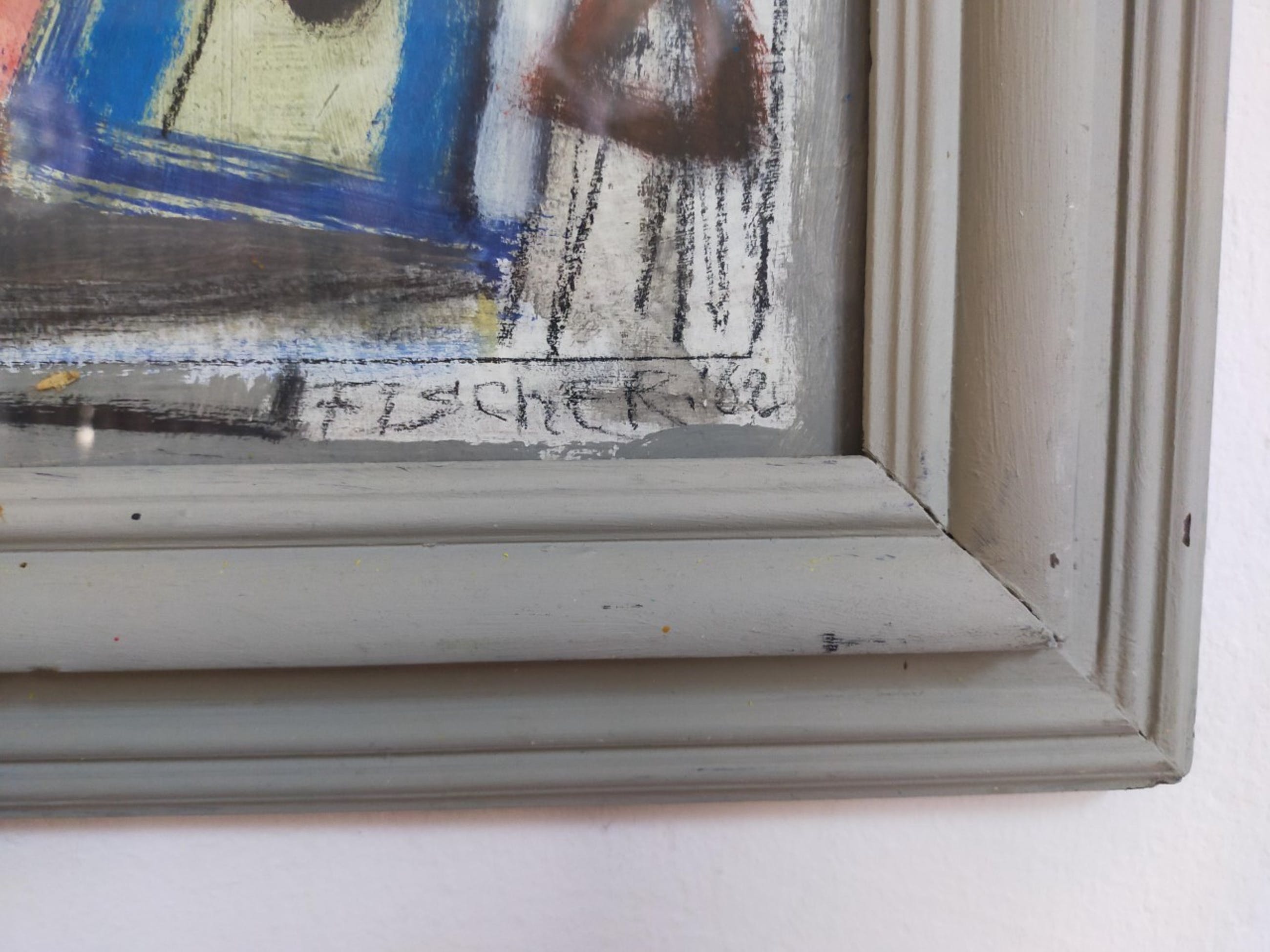 Eenvoudige, handgeverfde houten lijst, van kunstenaar zelf, achter glas.