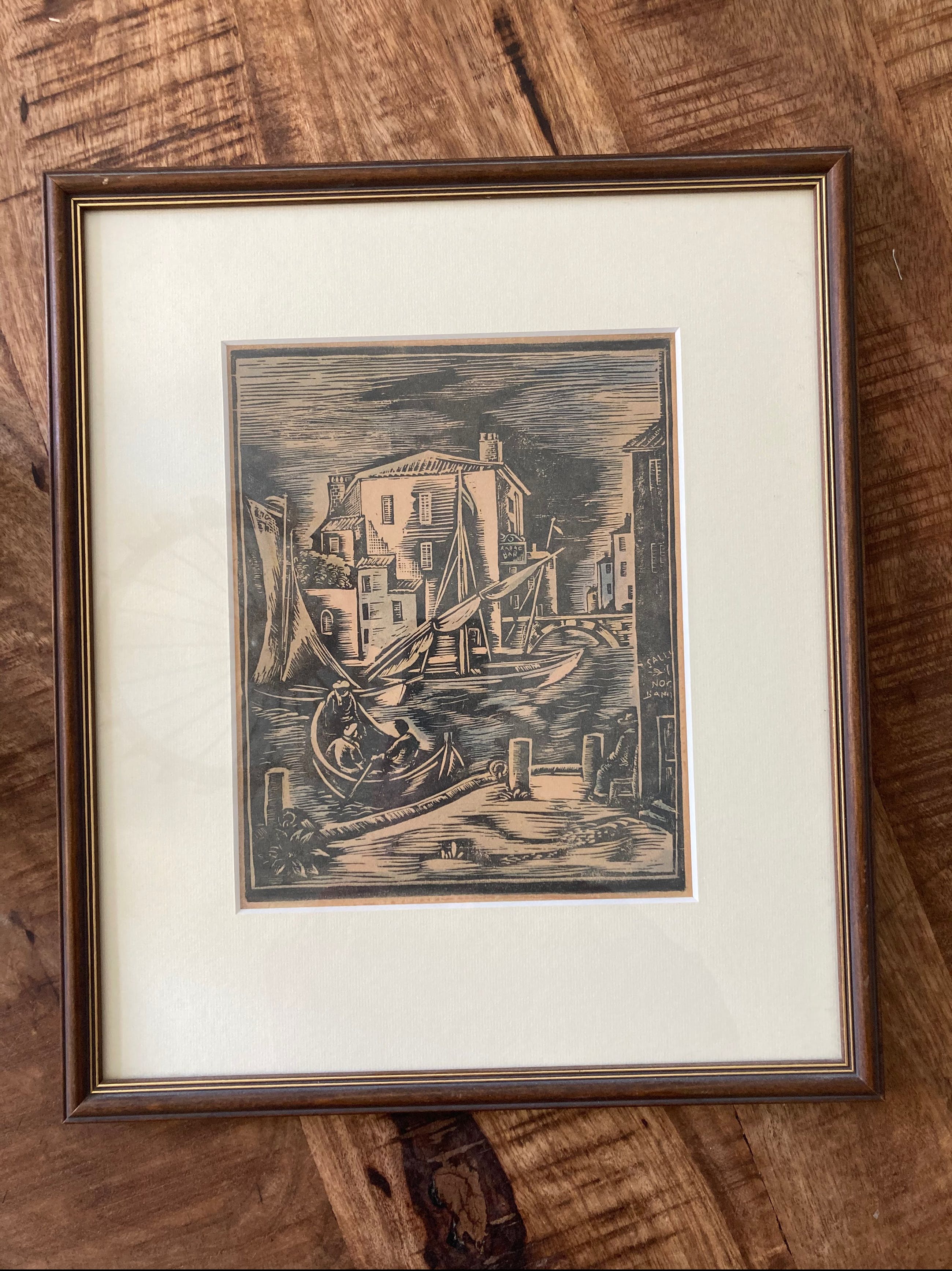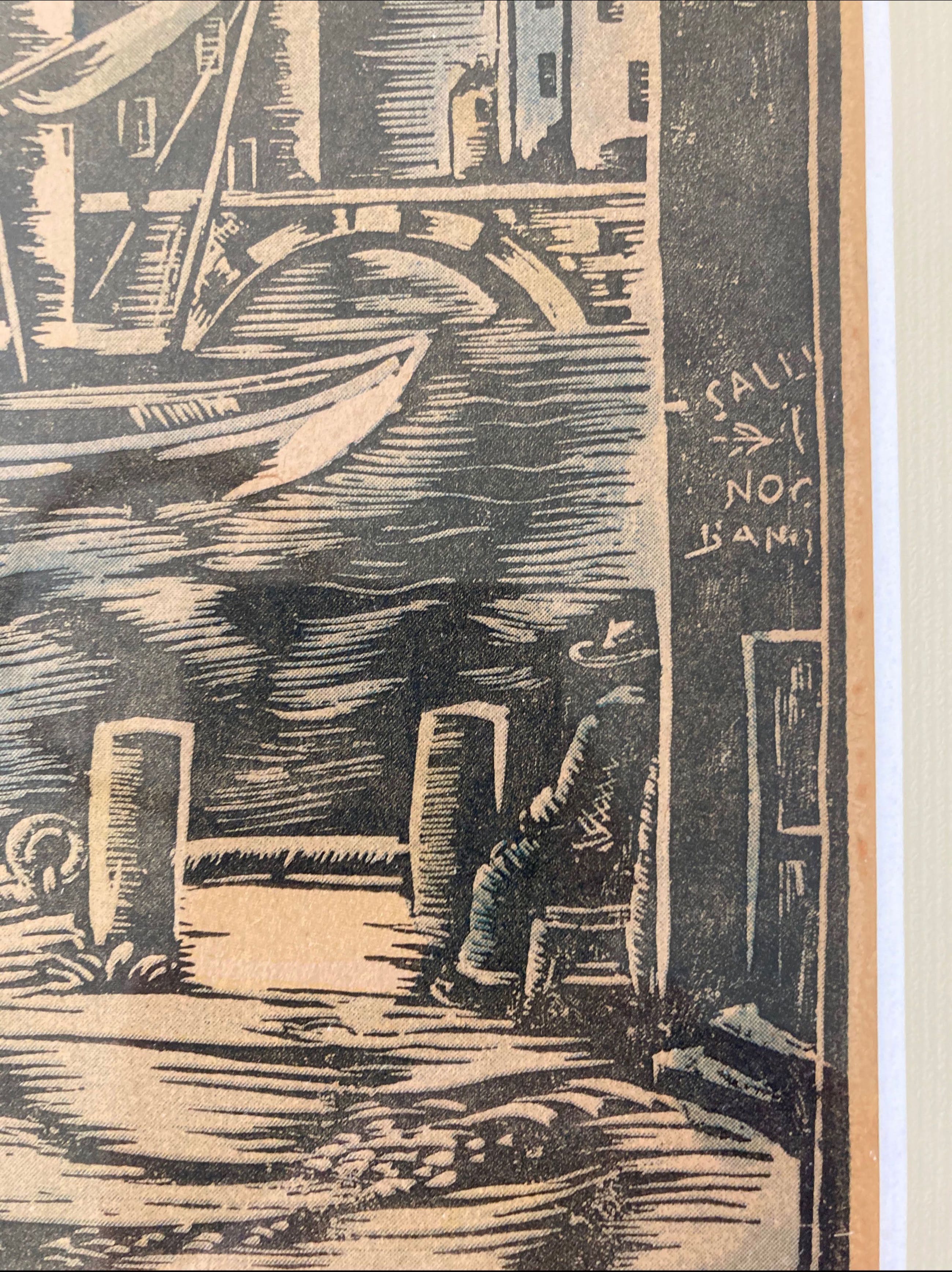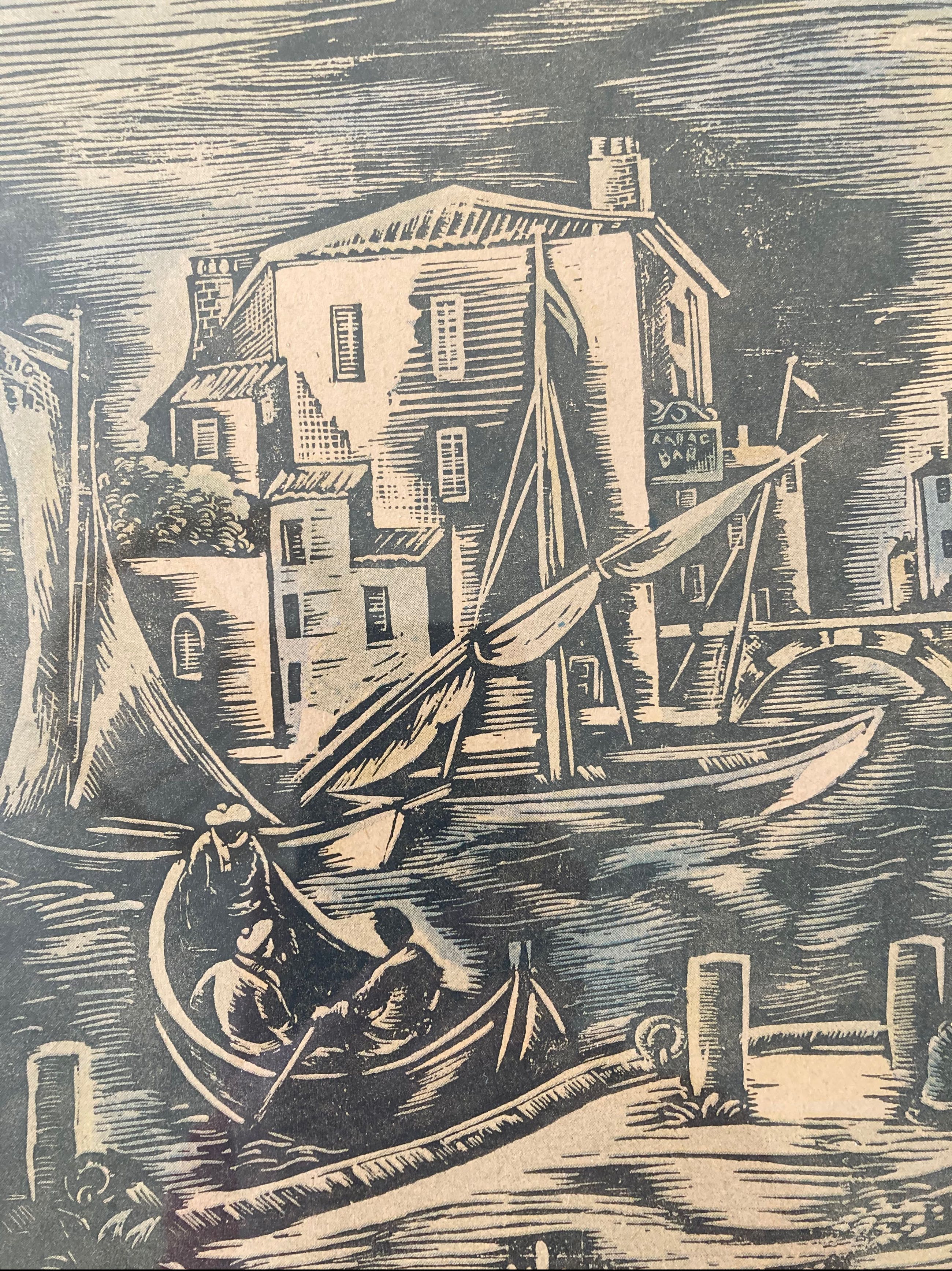 Mooie hout/lino snede, waarschijnlijk een Engels binnenhaventje.