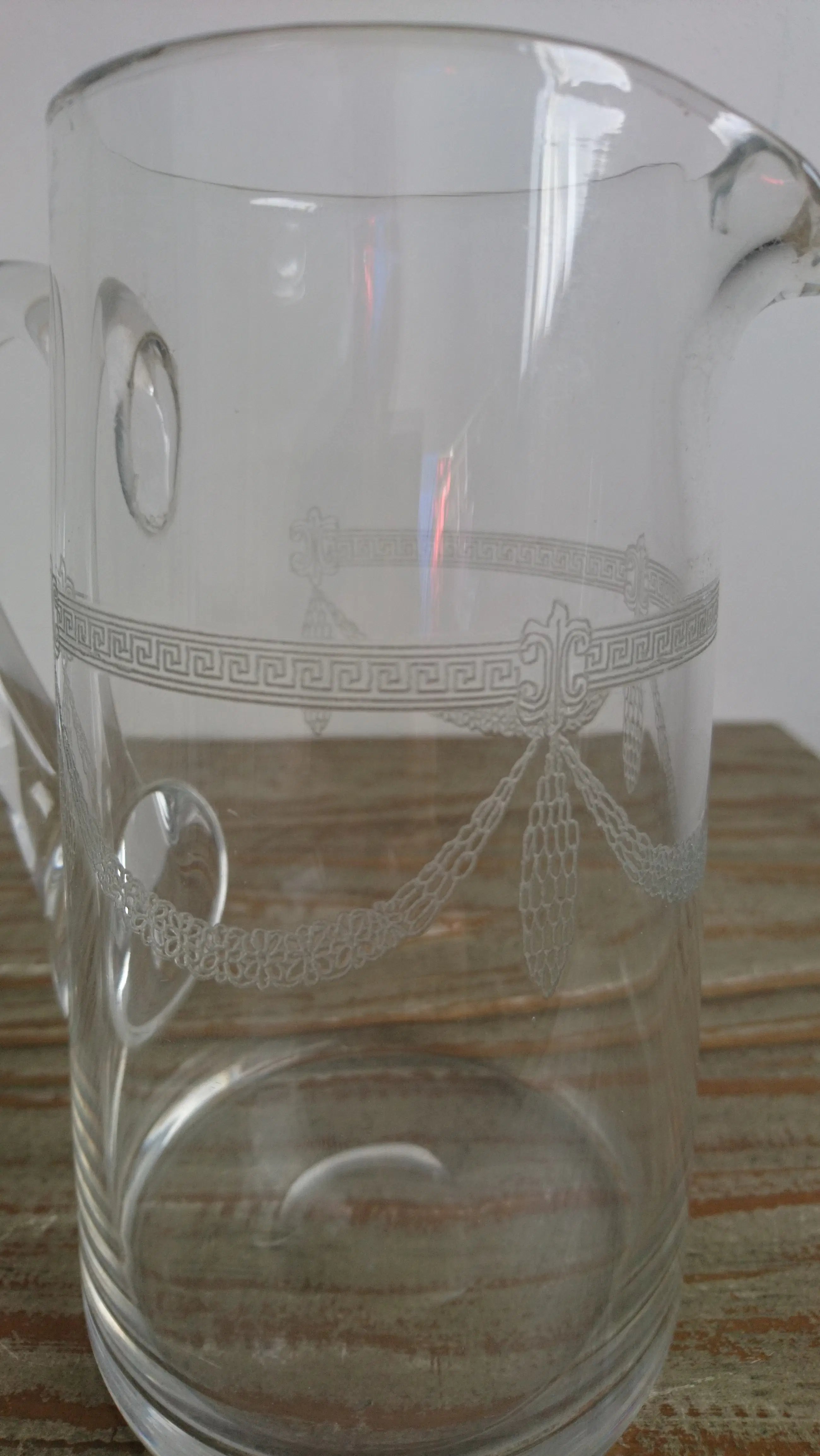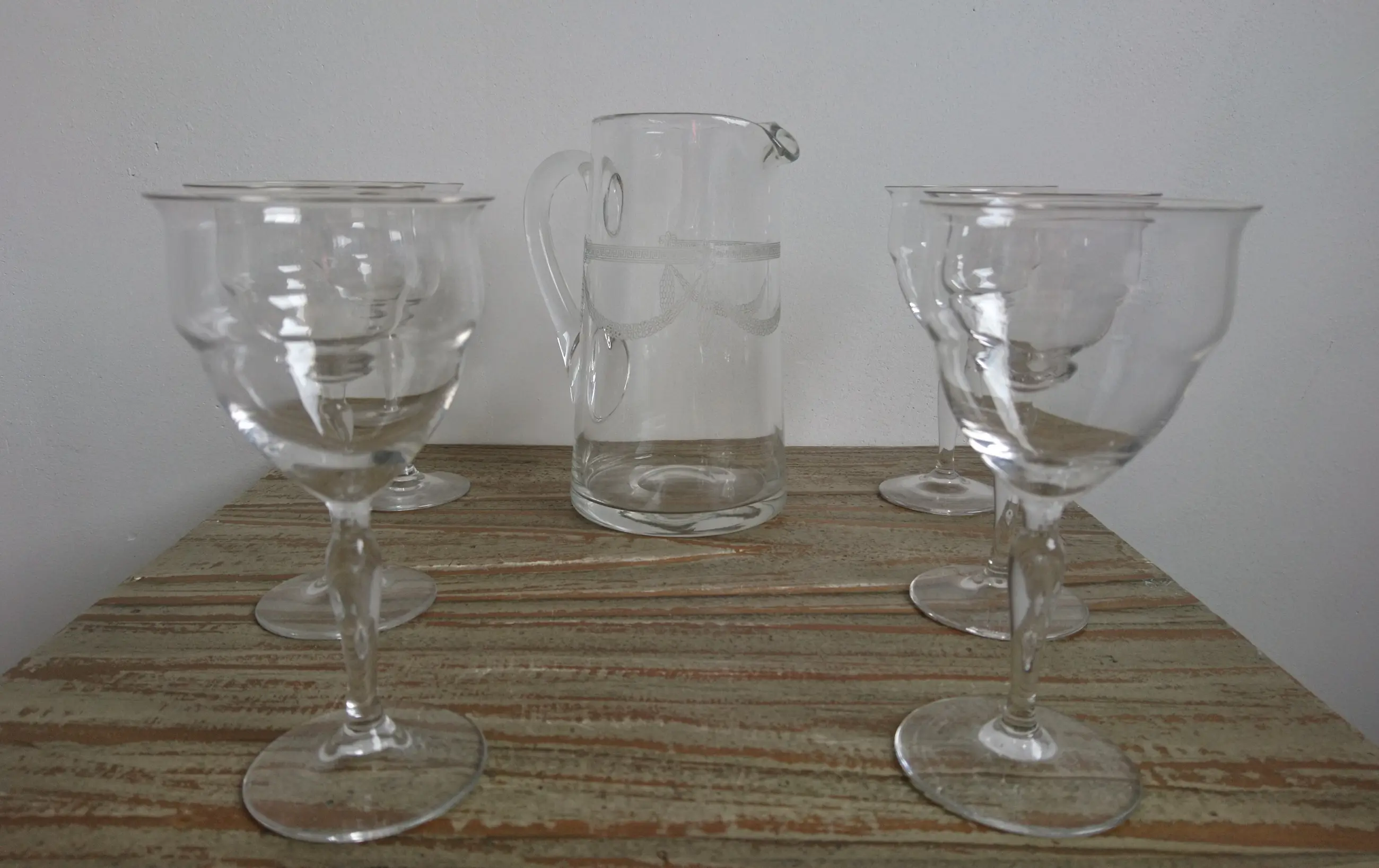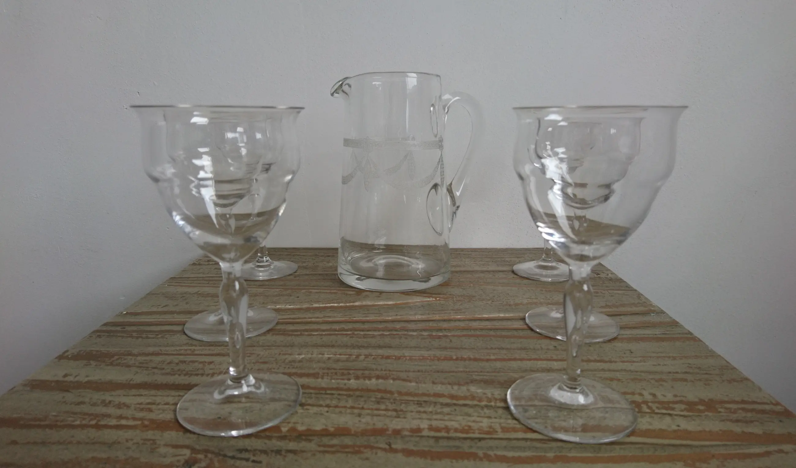 Geguillocheerde waterkan met 6 art-deco portglazen uit de jaren '20/'30 vorige eeuw. Geen breuken of chips. De waterkan is 16 cm hoog, 9,5 cm breed. Met geslepen pontil. De portglaasjes 14cm hoog en 7 cm breed.