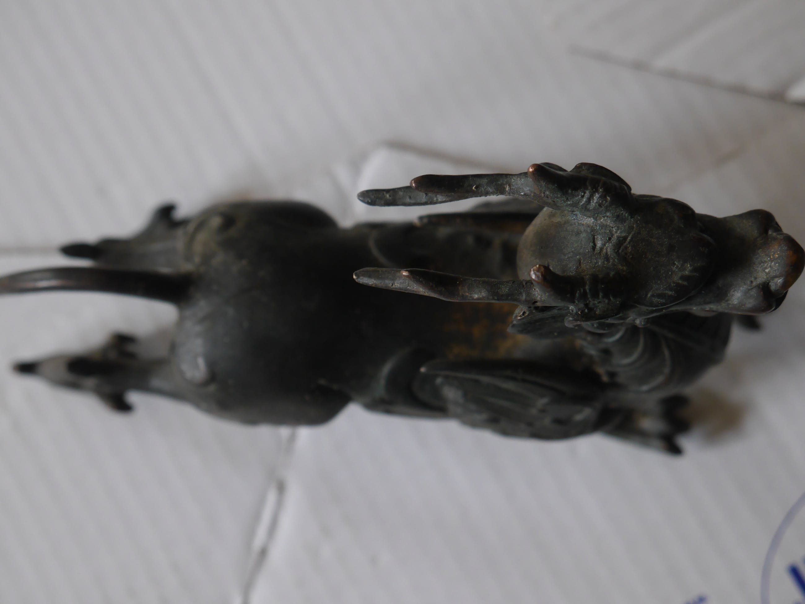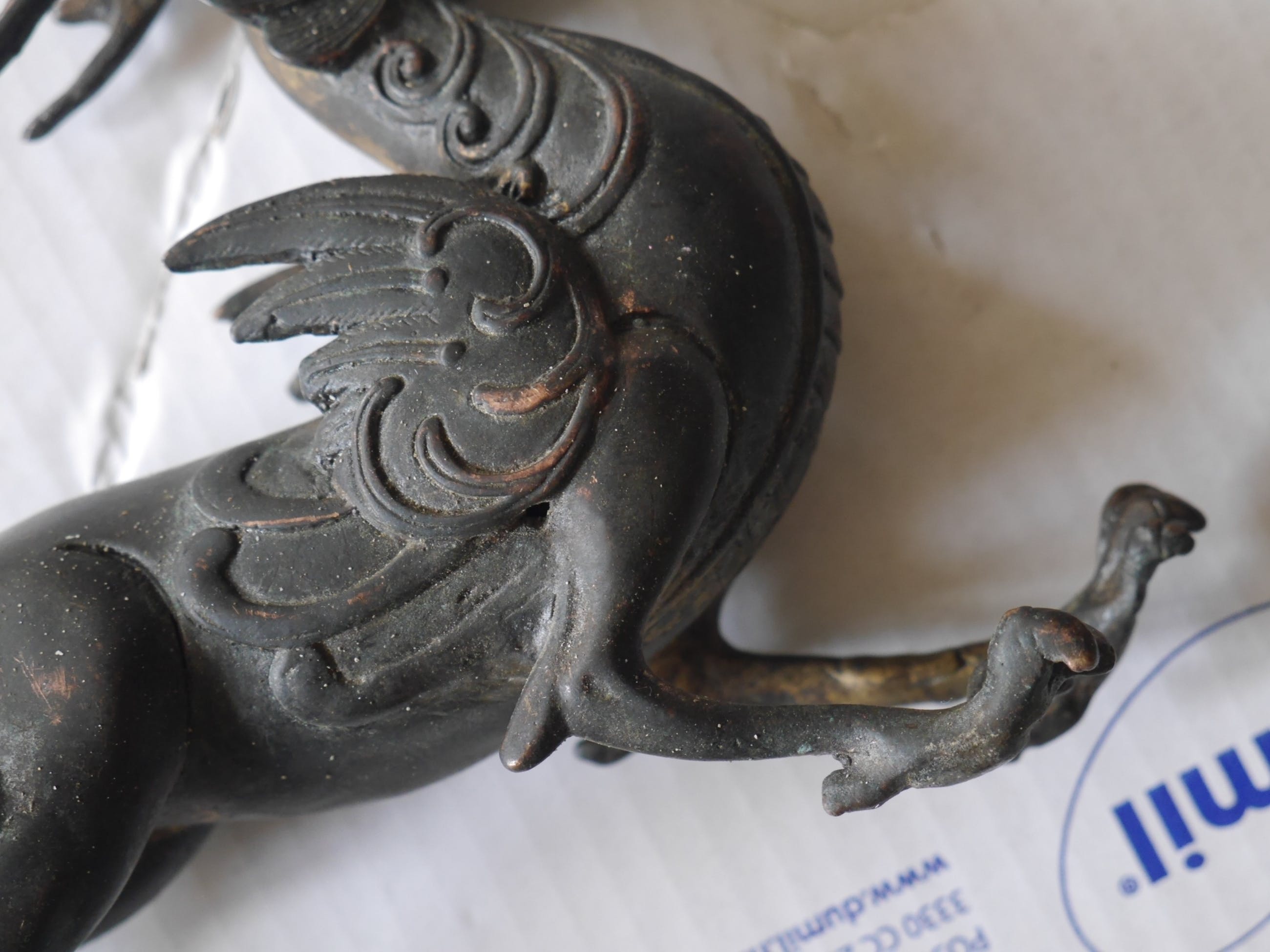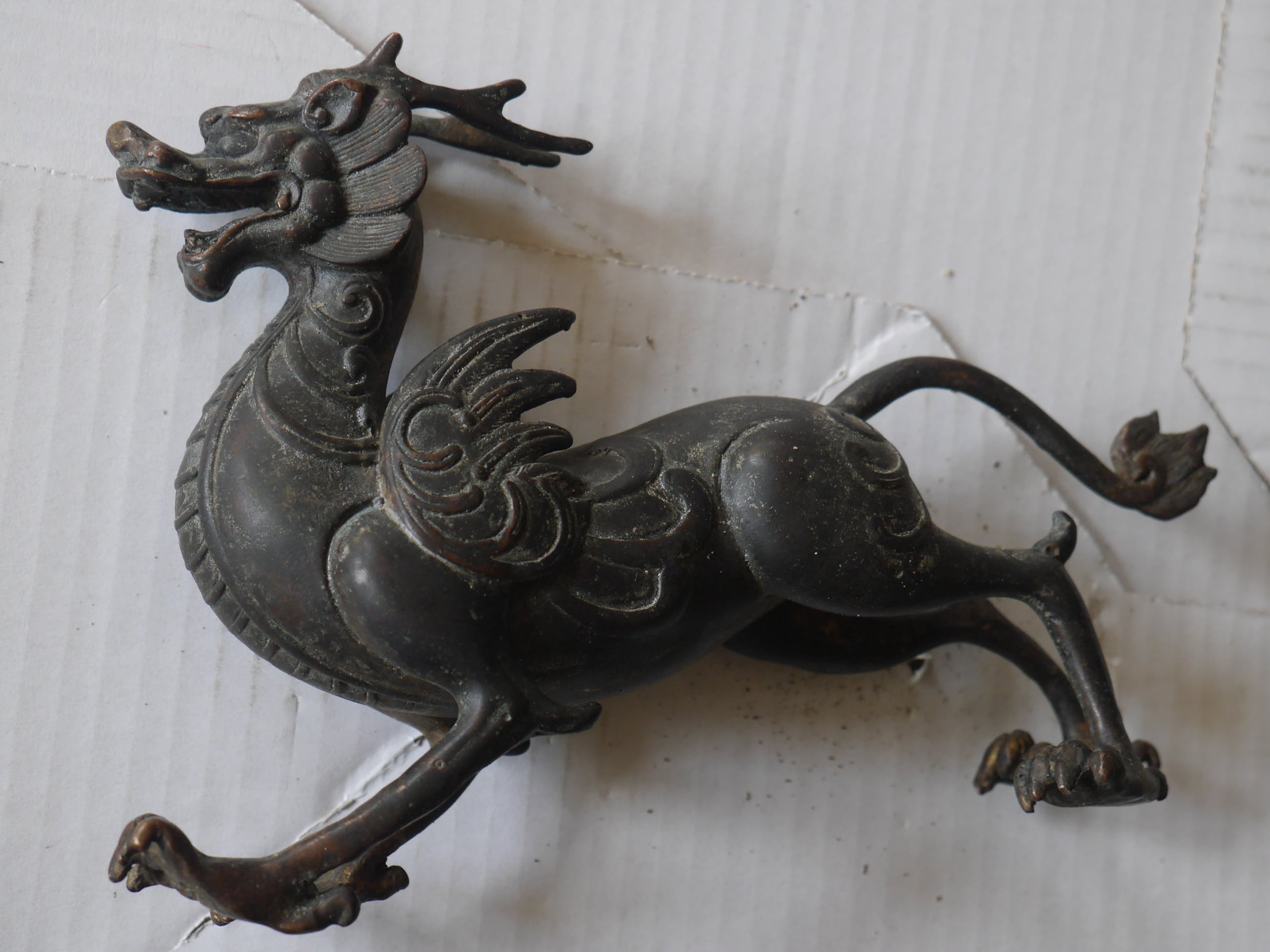 fraaie geluksdraak of griffoen...gevonden in een Tibetaans huismooi van patina op koper of brons...dat is onduidelijk