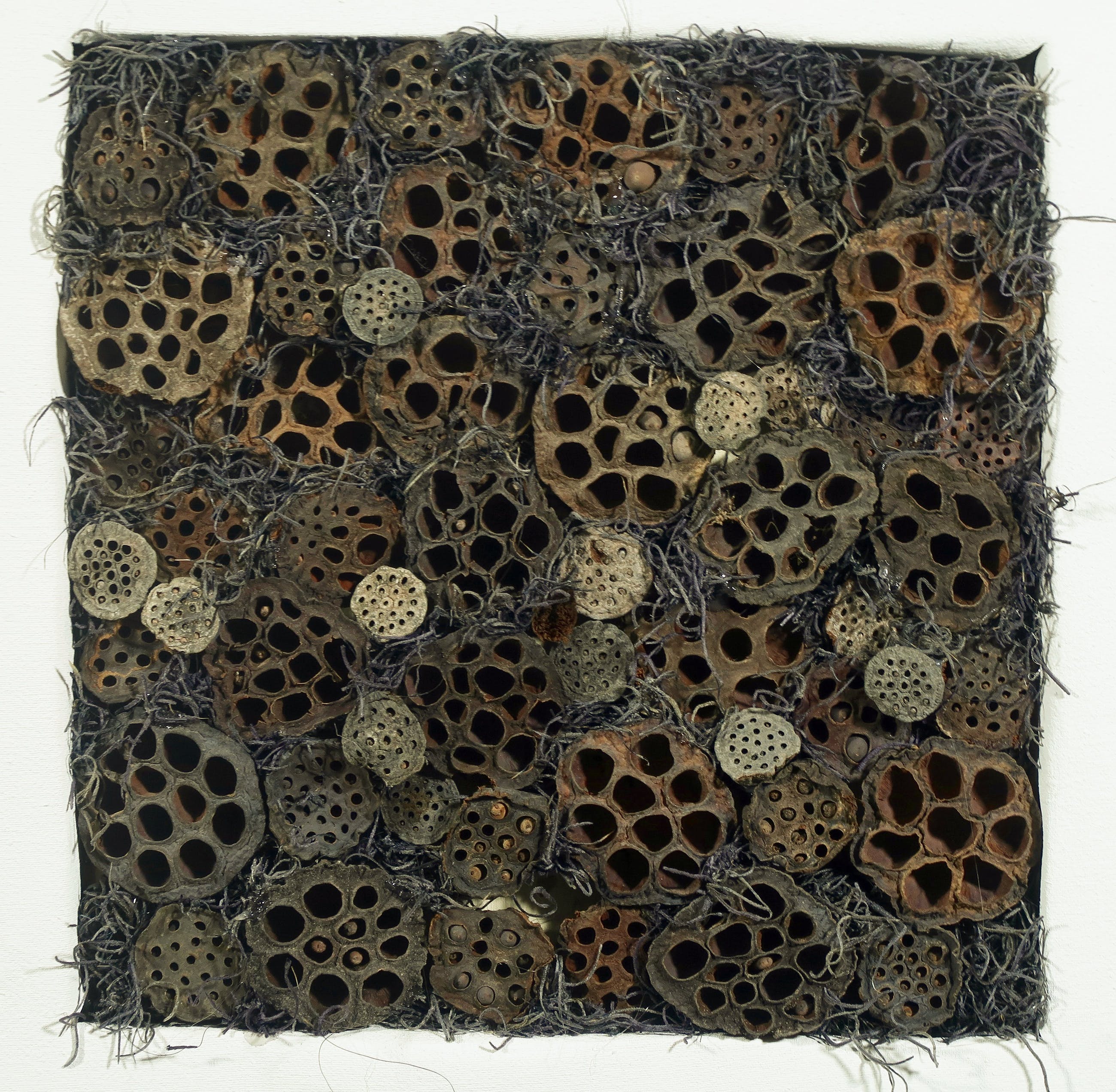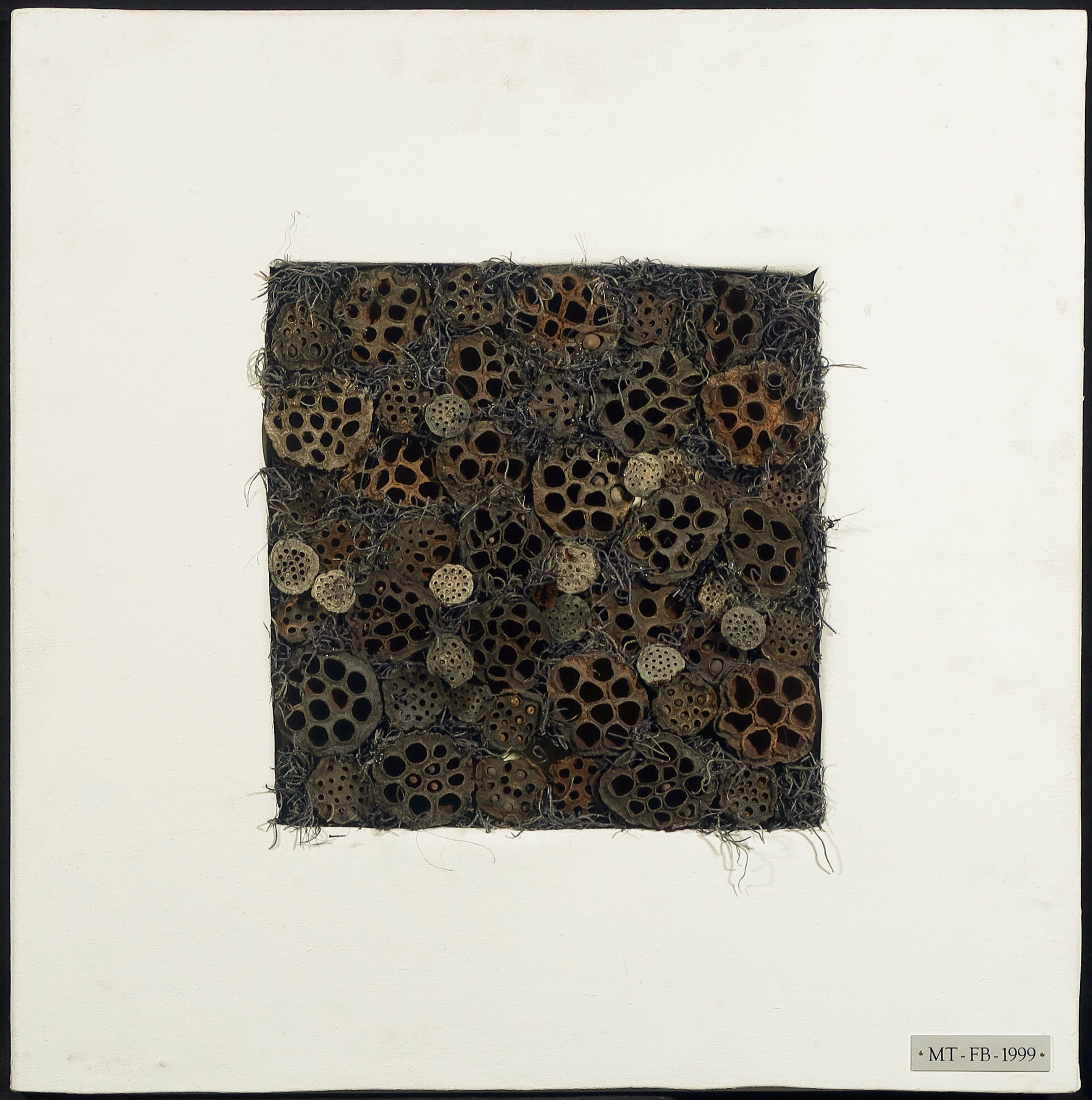 Gedroogde planten in een omlijsting bestaande uit canvas gespannen op paneel