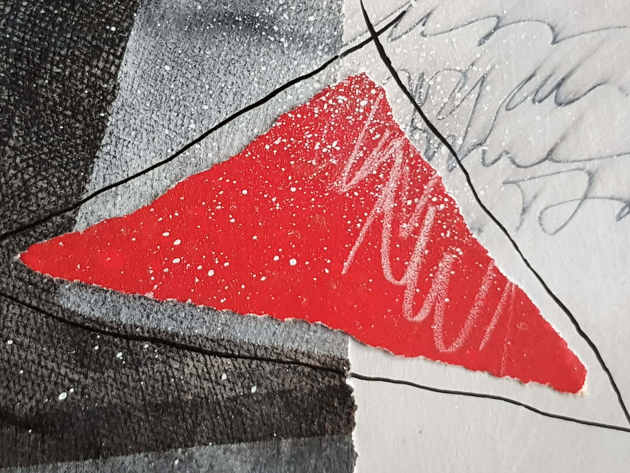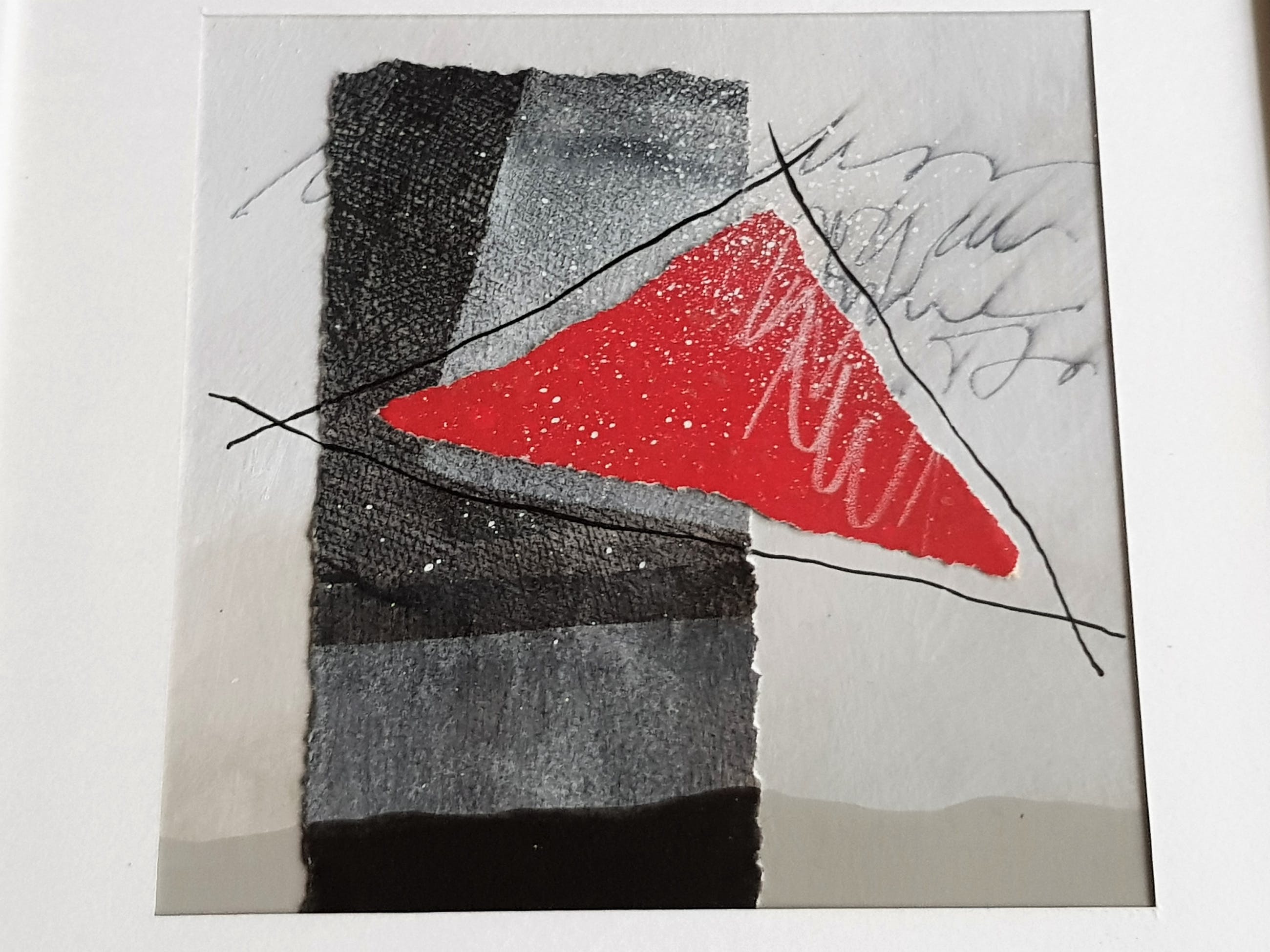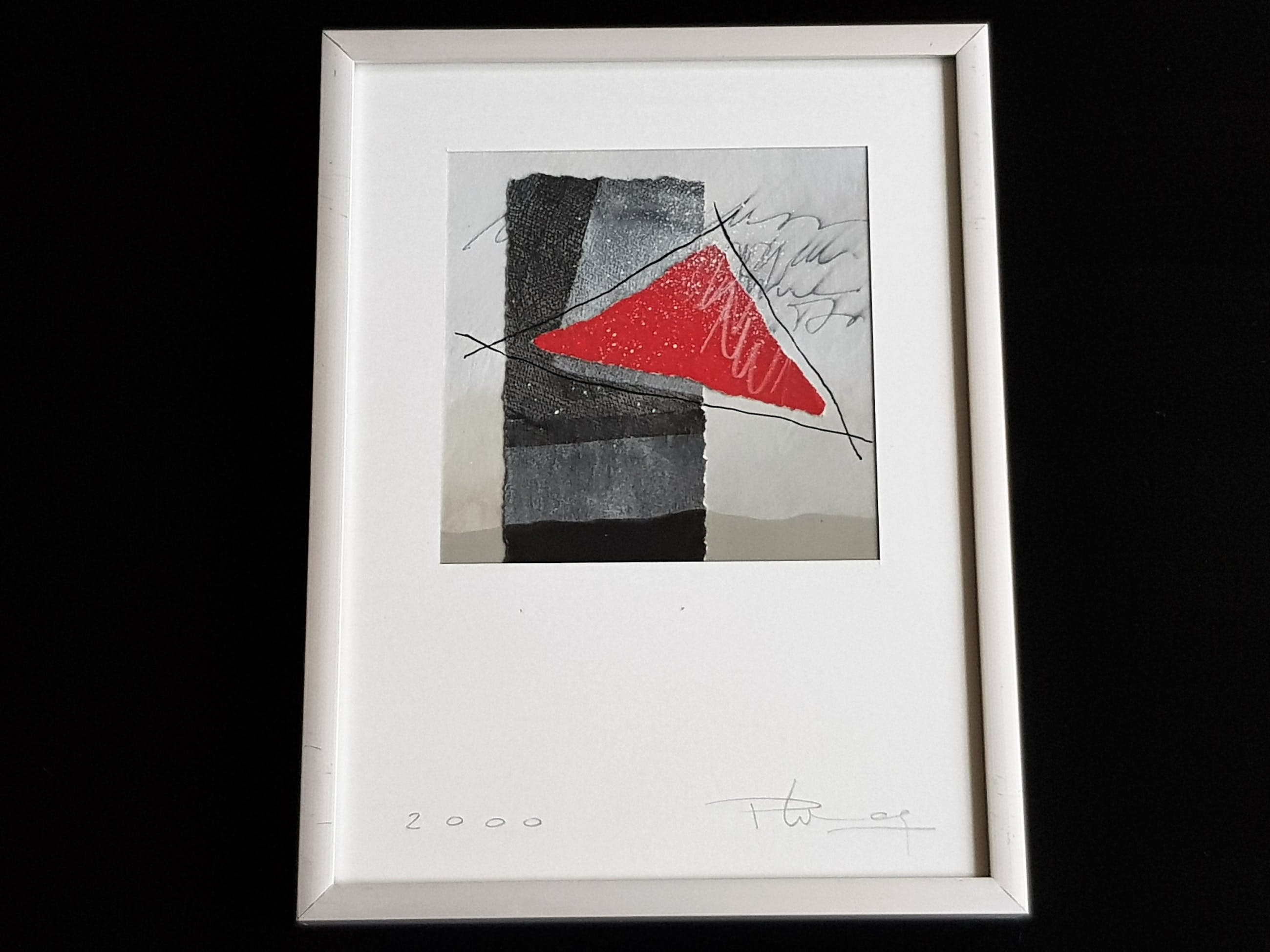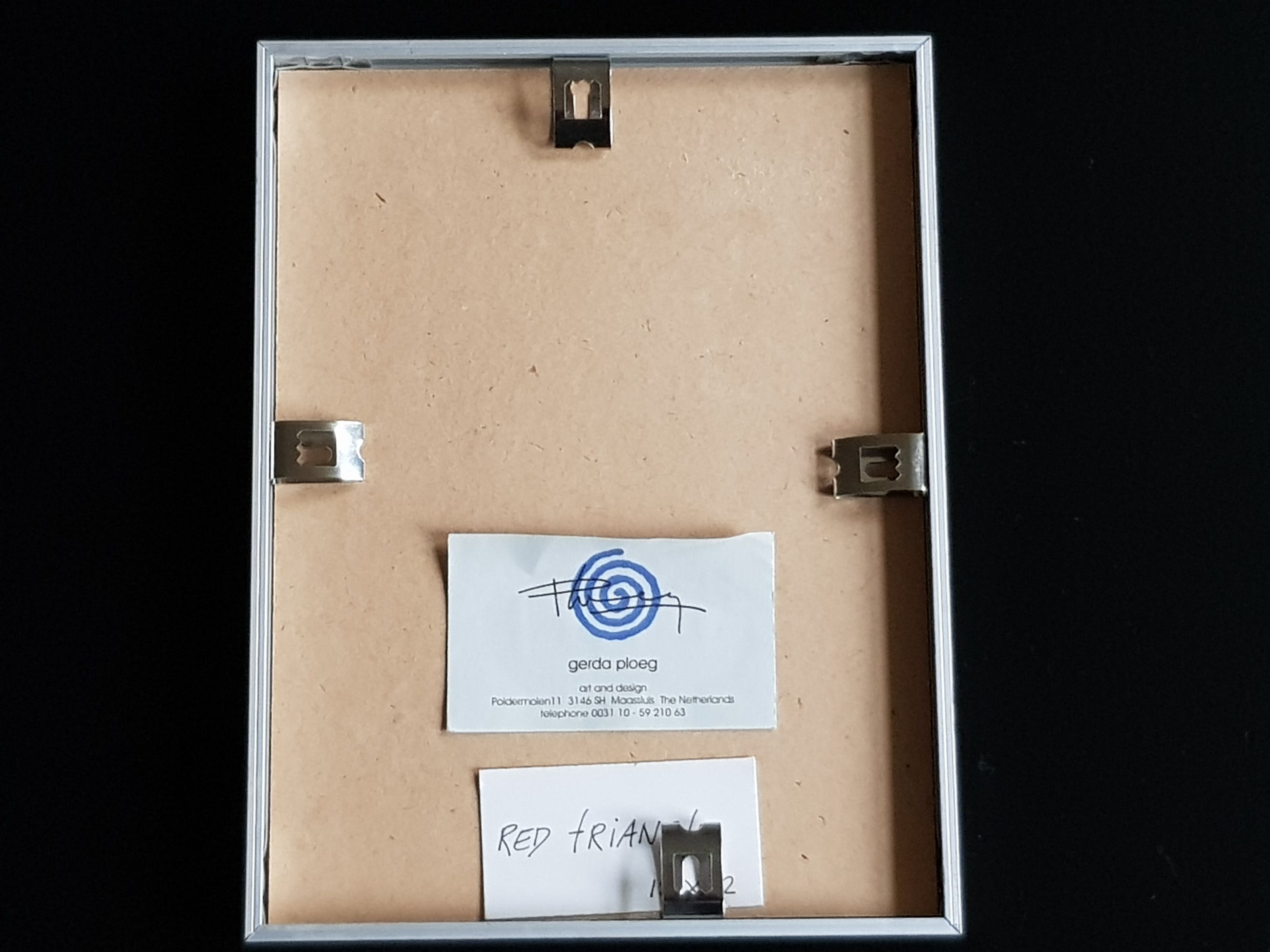 Gemengde Techniek. Gesigneerd en gedateerd 2000. Titel: Red Triangle. Voor mij onduidelijk gesigneerd. Afm totaal: 25 x 19 cm. Beeldformaat: 12 x 12 cm. Inclusief: Aluminium lijst, ophangmogelijkheid en glasplaat.  Conditie, in goede staat. Het wordt zorgvuldig ingepakt.