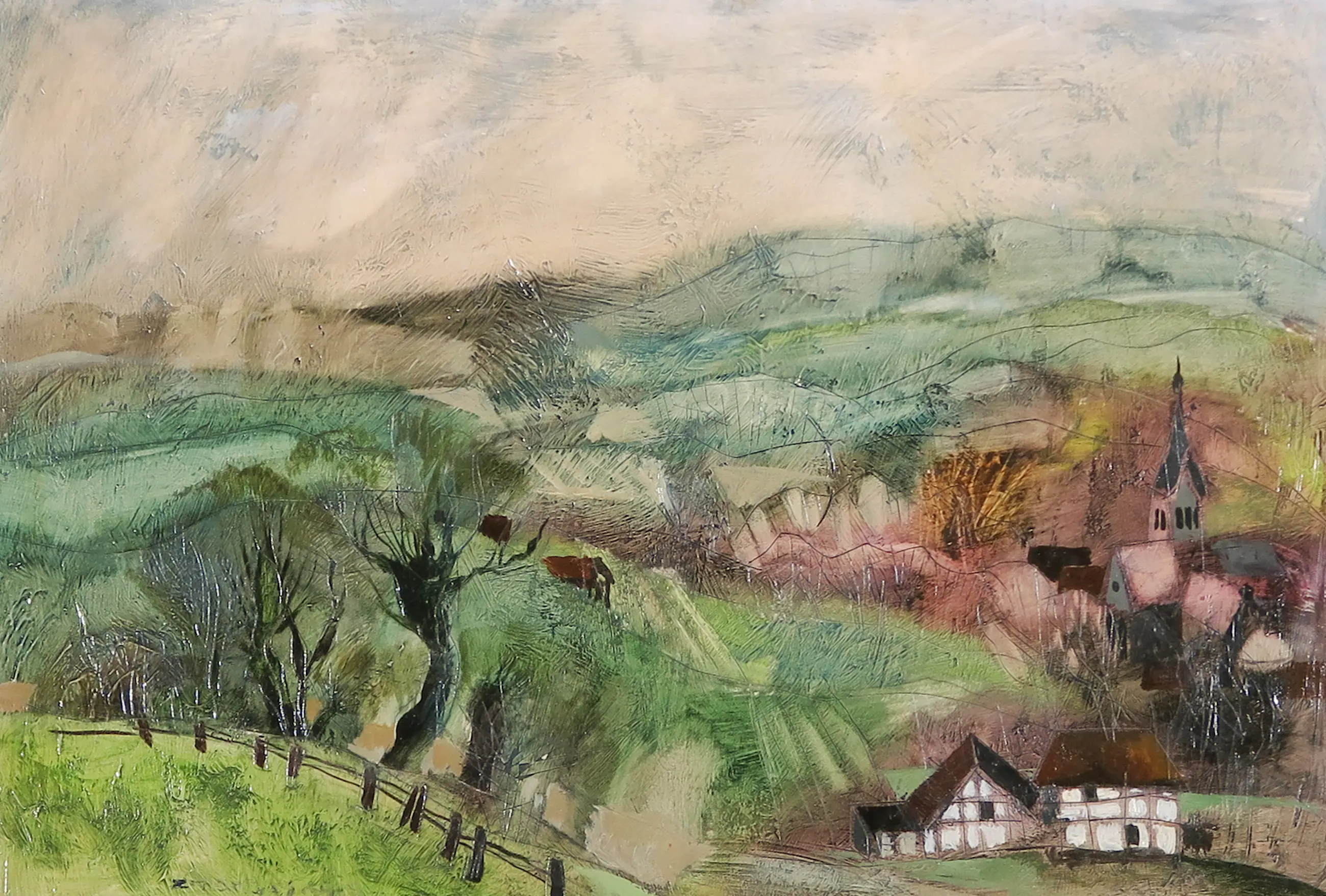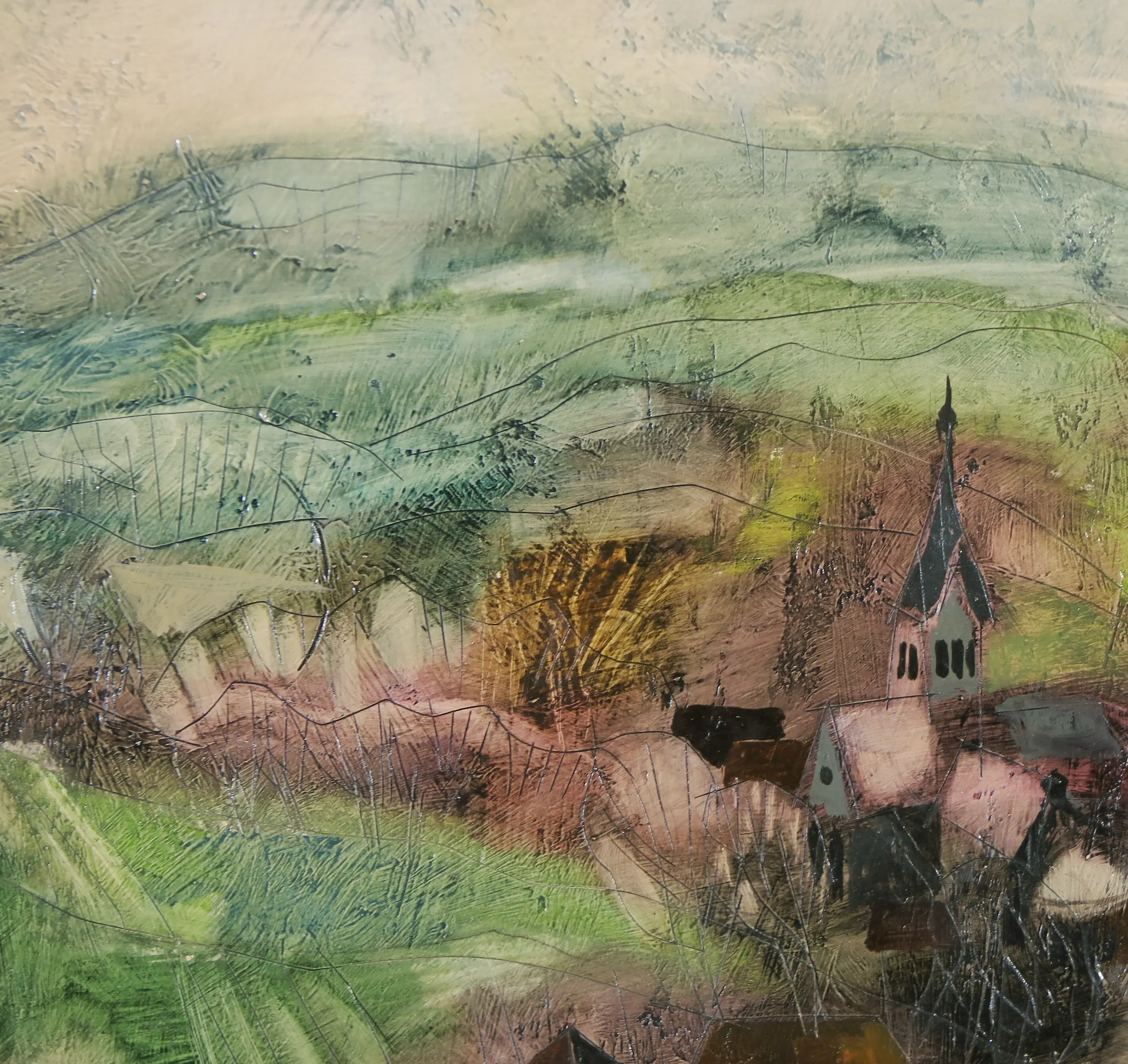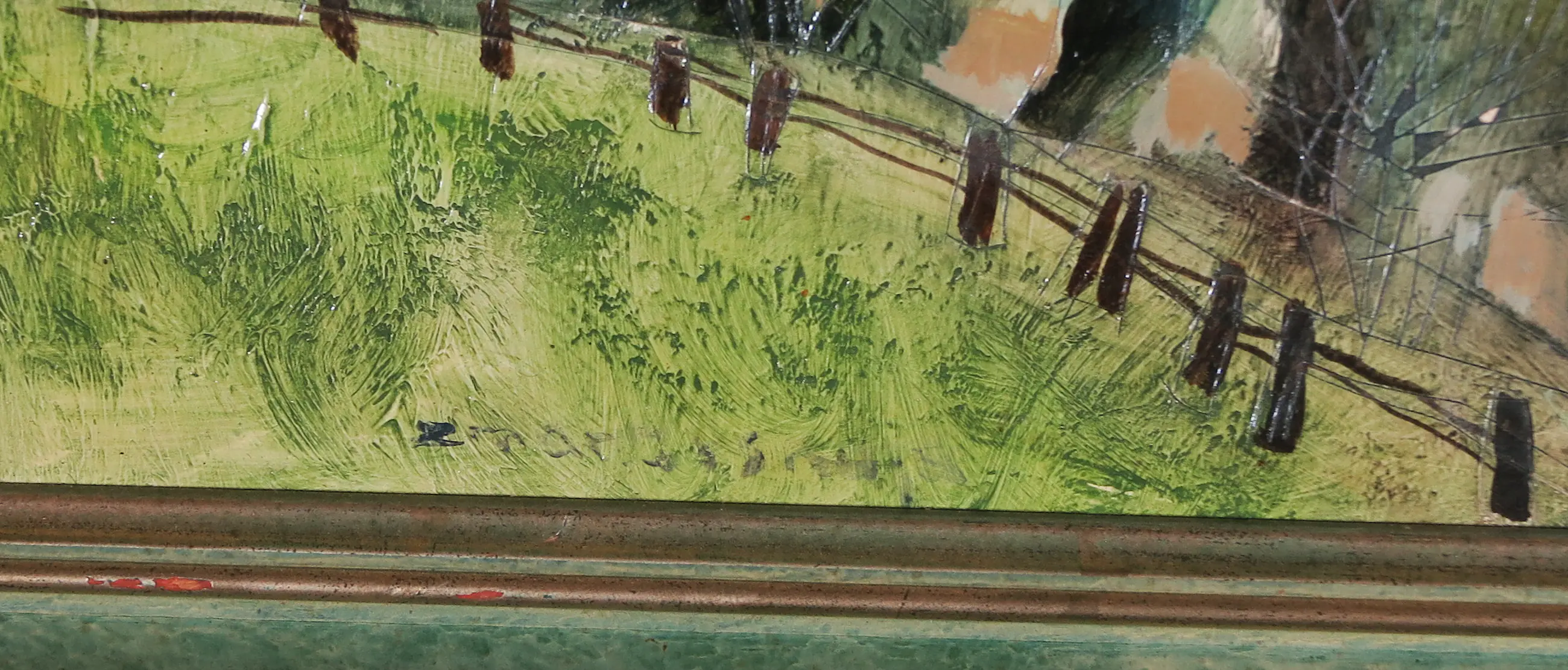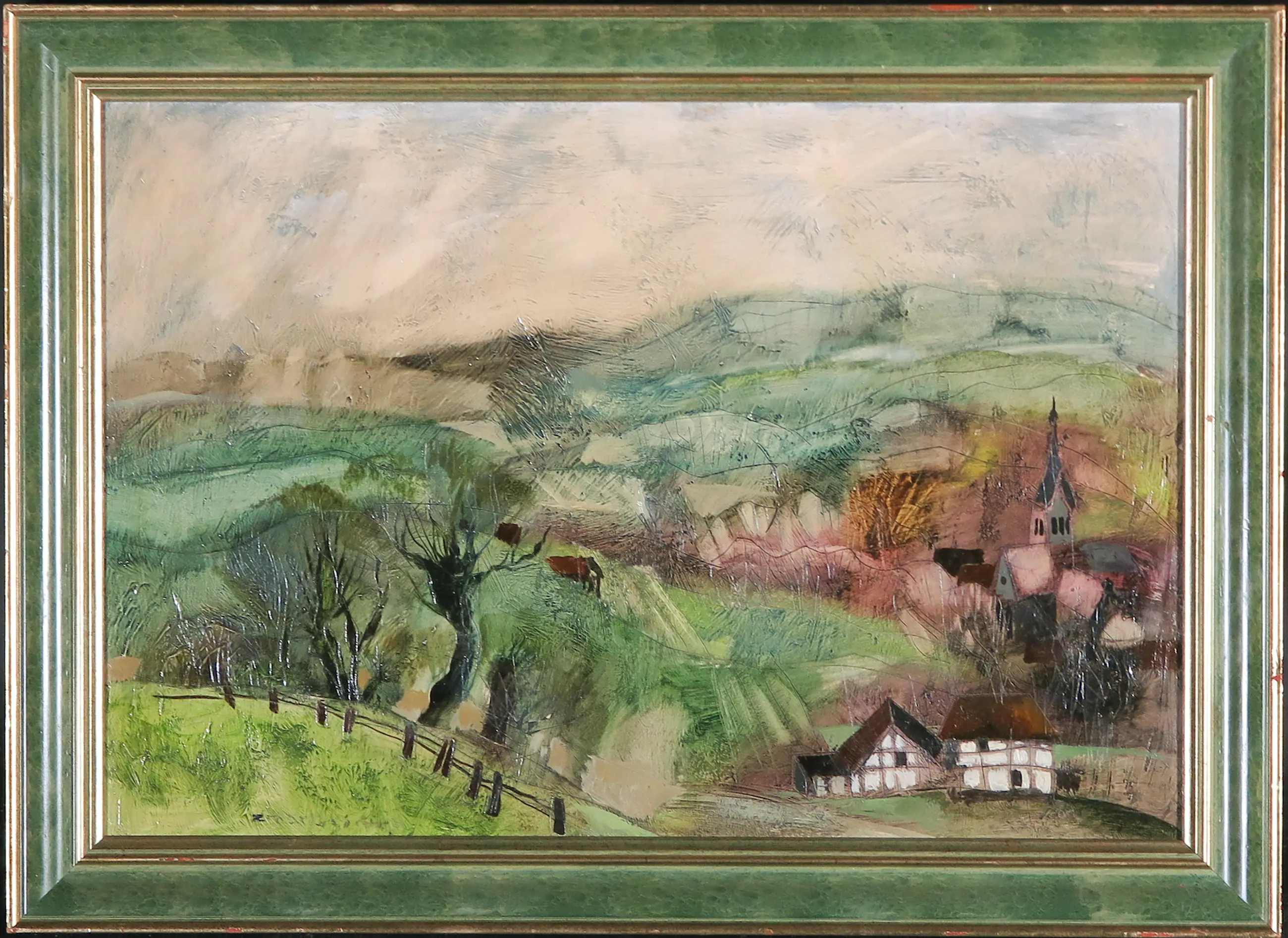Klein schilderij met voorstelling van Landschap Vroenhoven (notitie achterzijde) door een voor ons onbekende maker.