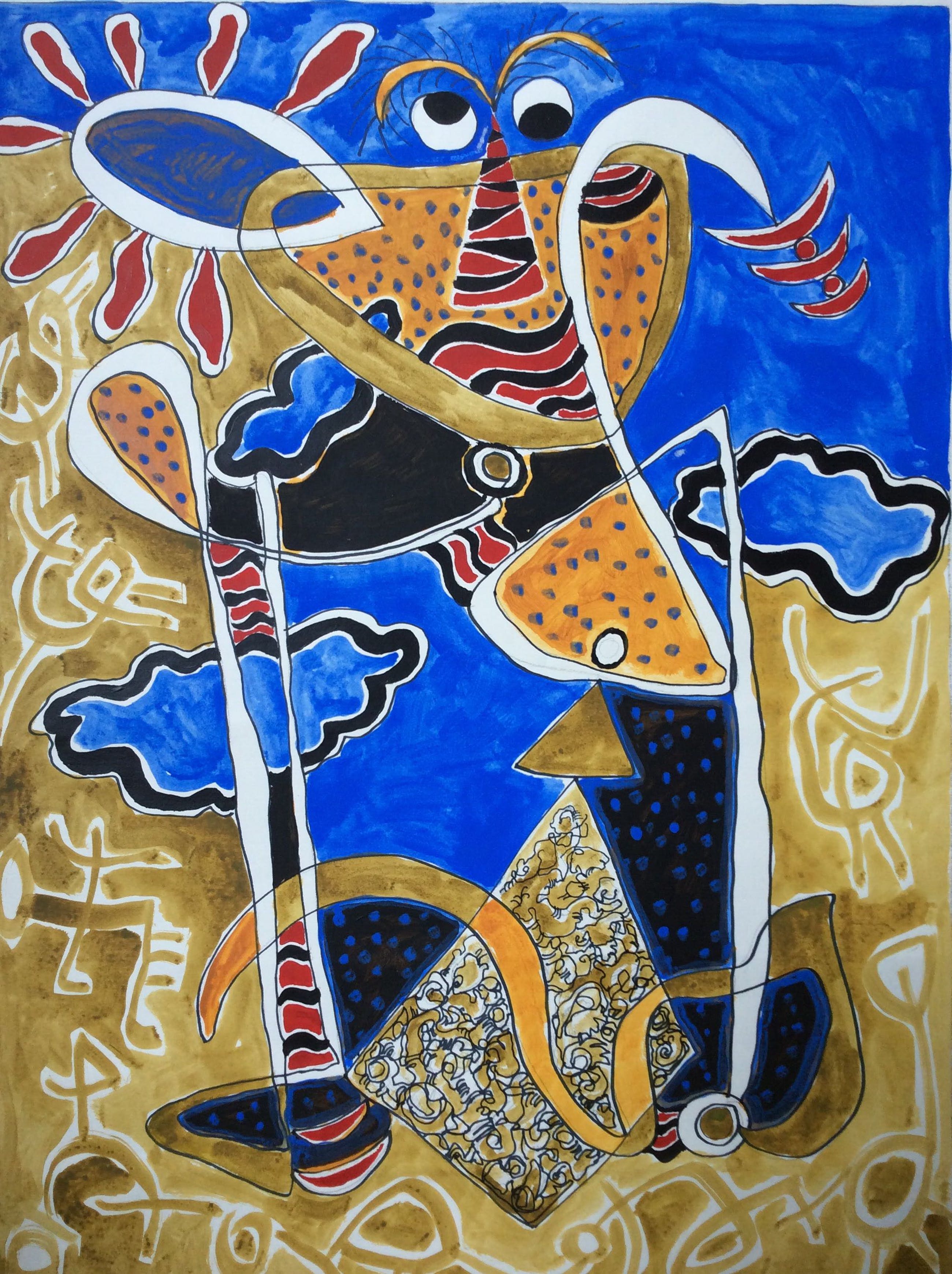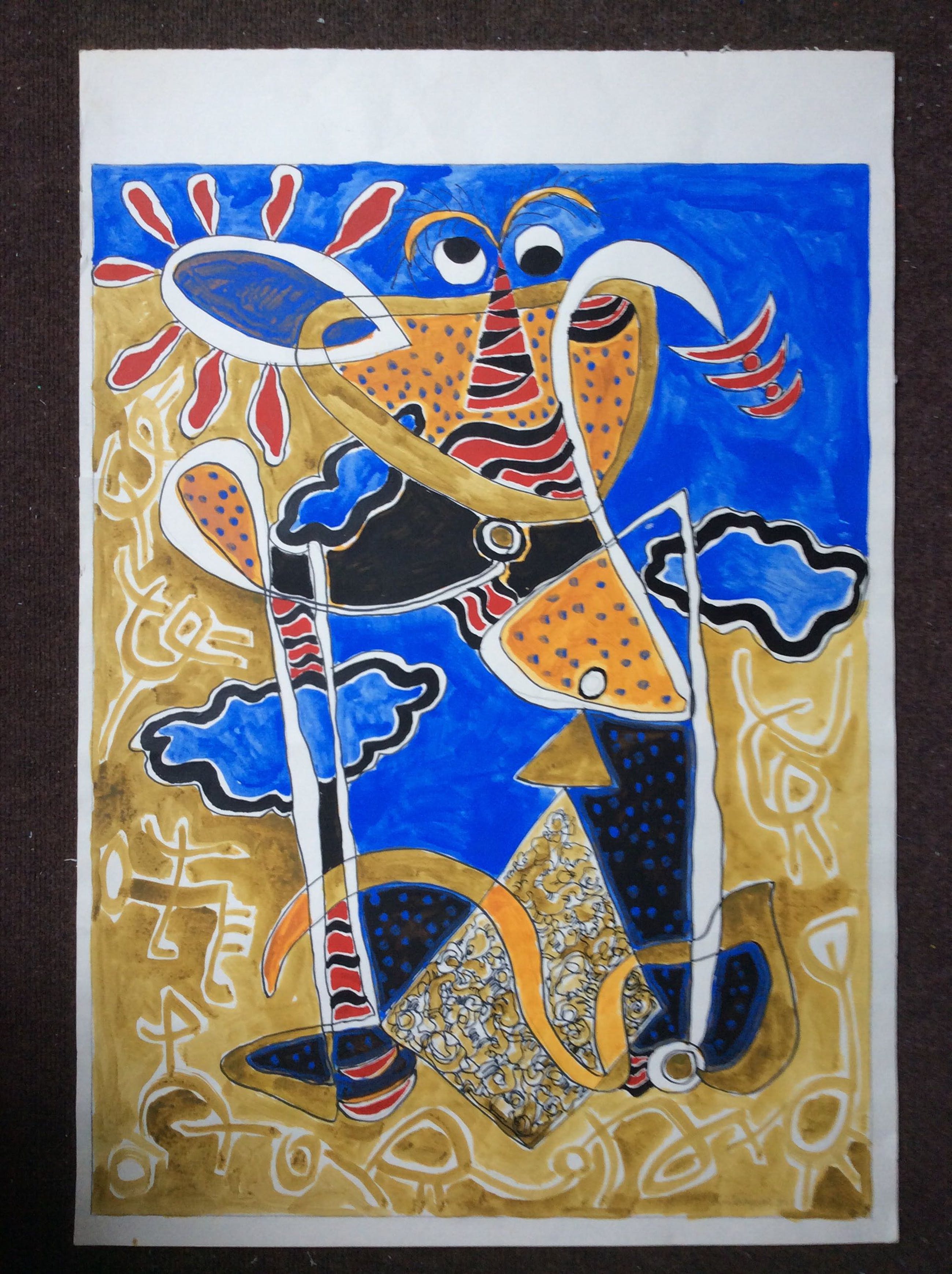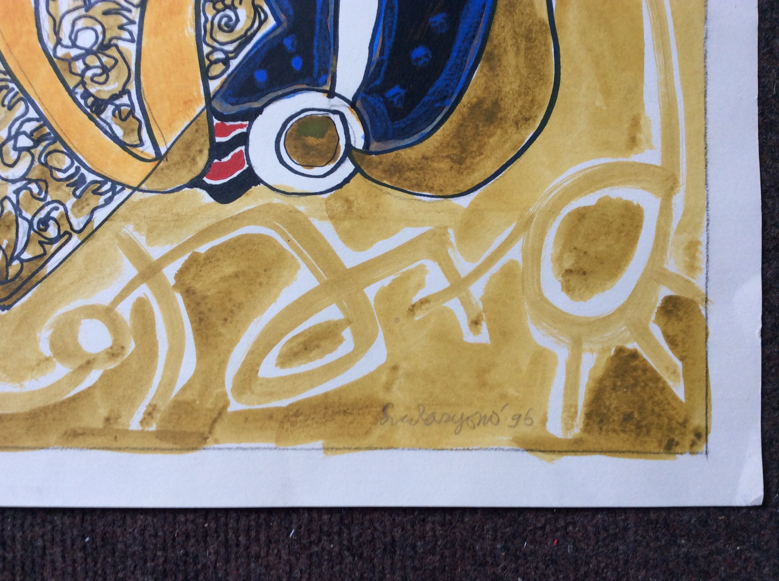 Boeiende voorstelling van onbekende kunstenaar. Rechtsonder potlood gesigneerd, 1996. Formaat incl 85 x 59 cm.
