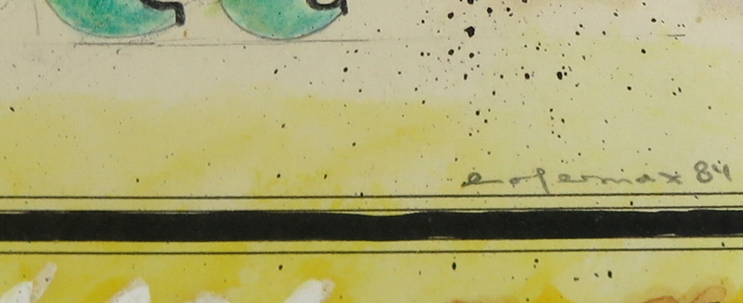 De tekening is in zeer goede staat. Het passe-partout heeft een grote vochtplek in de hoek linksonder. Meerdere stofjes/vuiltjes achter het glas. | |