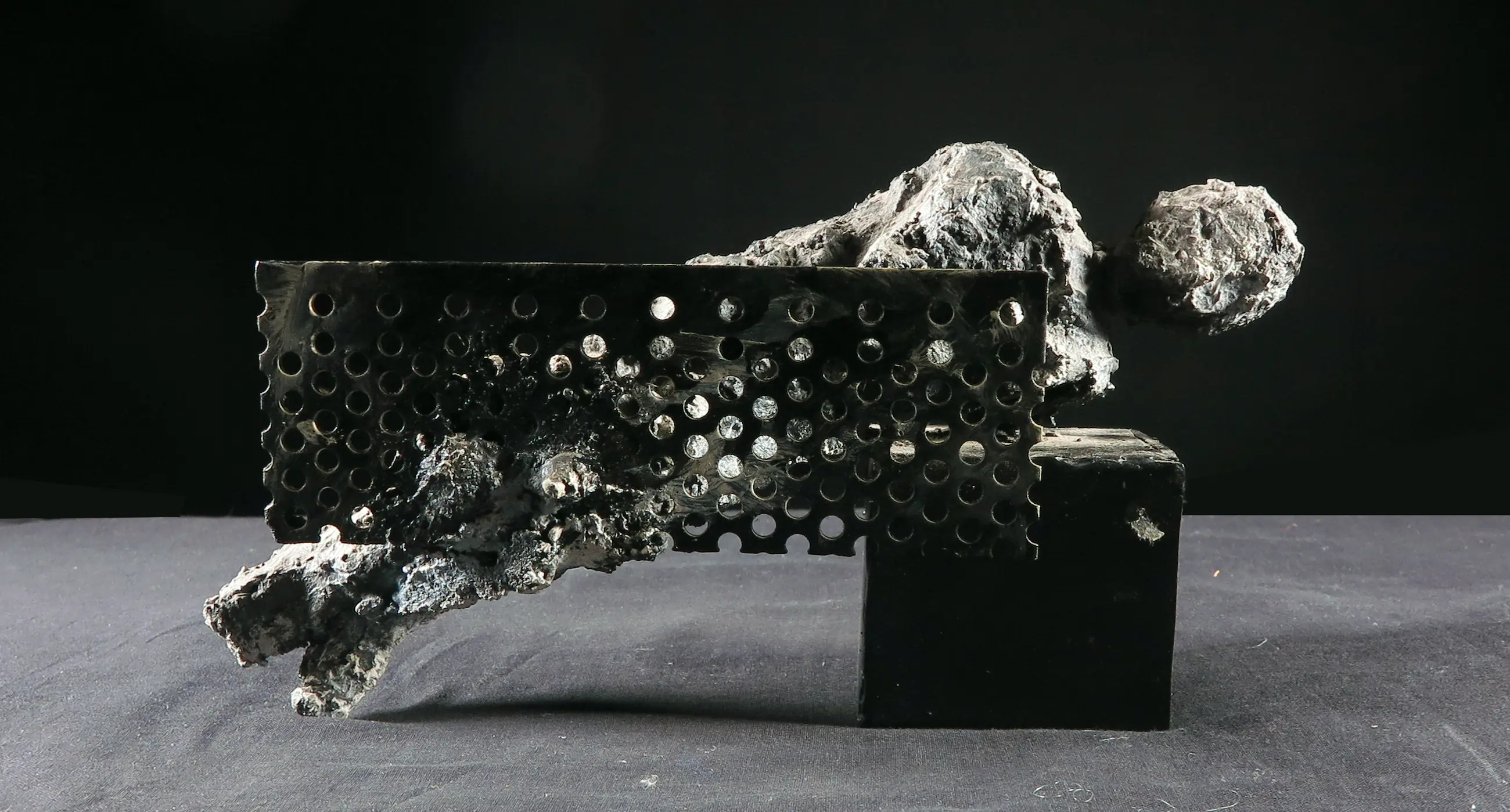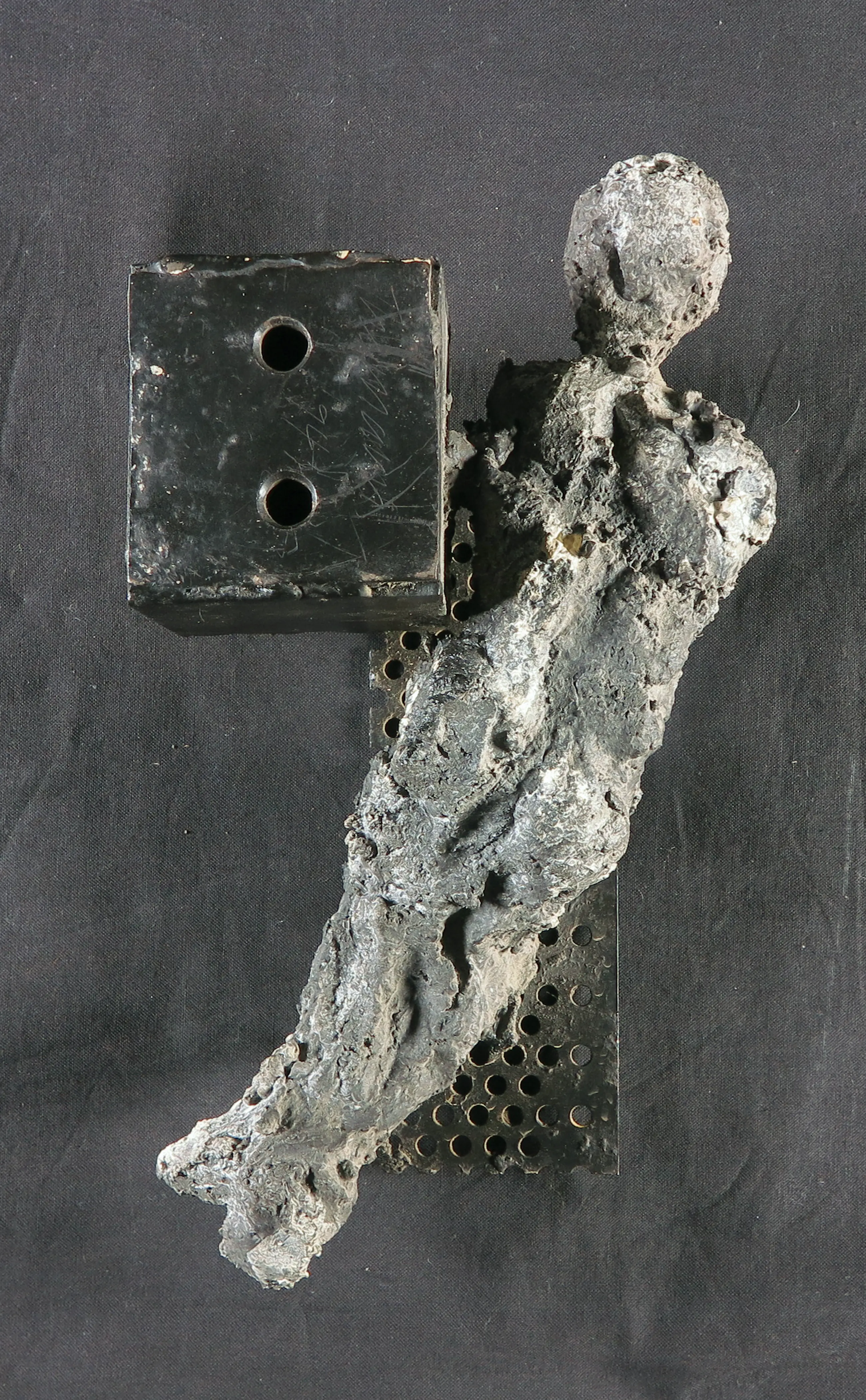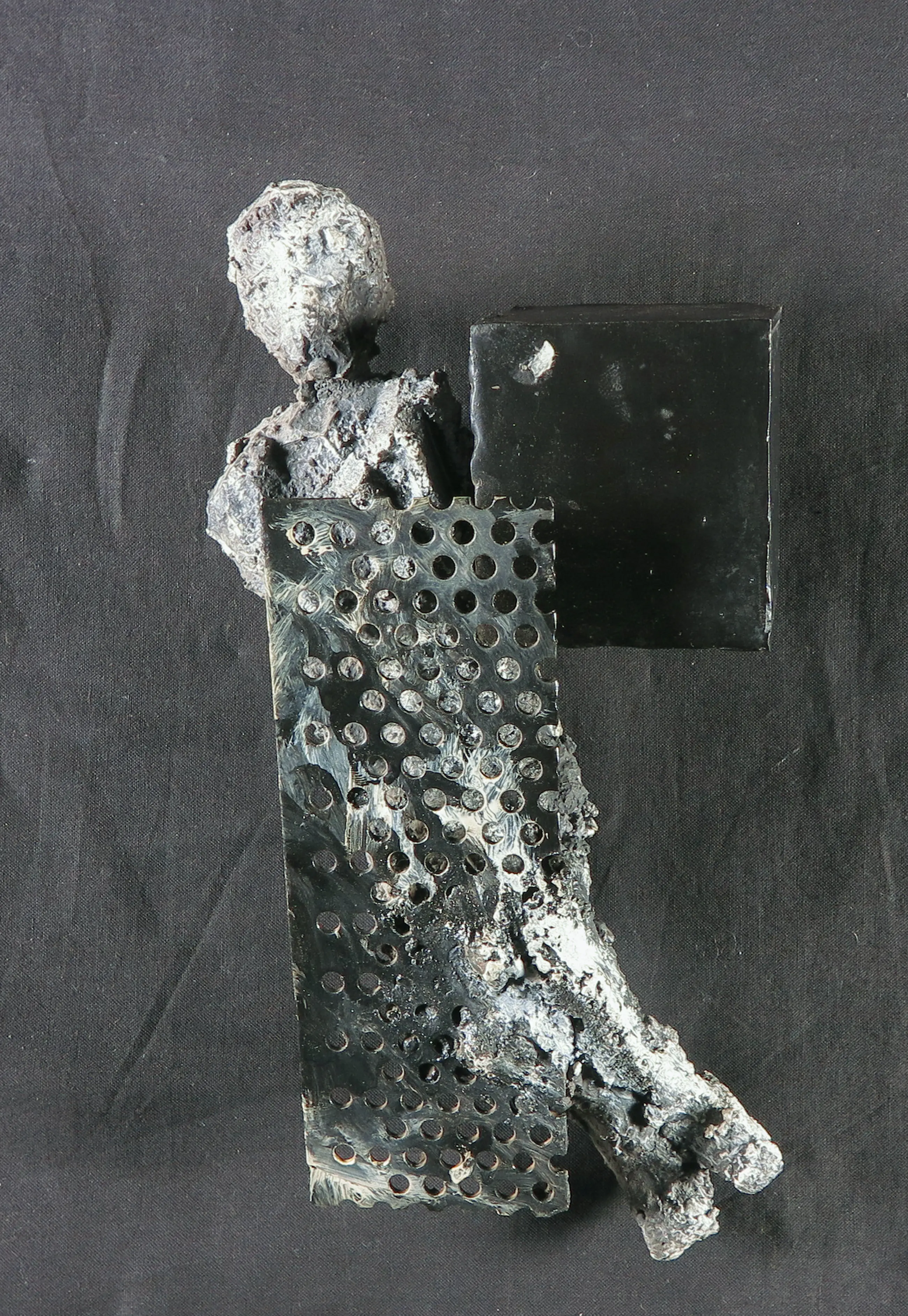 Gesigneerd Thielmann? Beeldje (metaallegering) achter metalen plaatje. Op een zwart metalen blokje dan aan de muur bevestigd kan worden