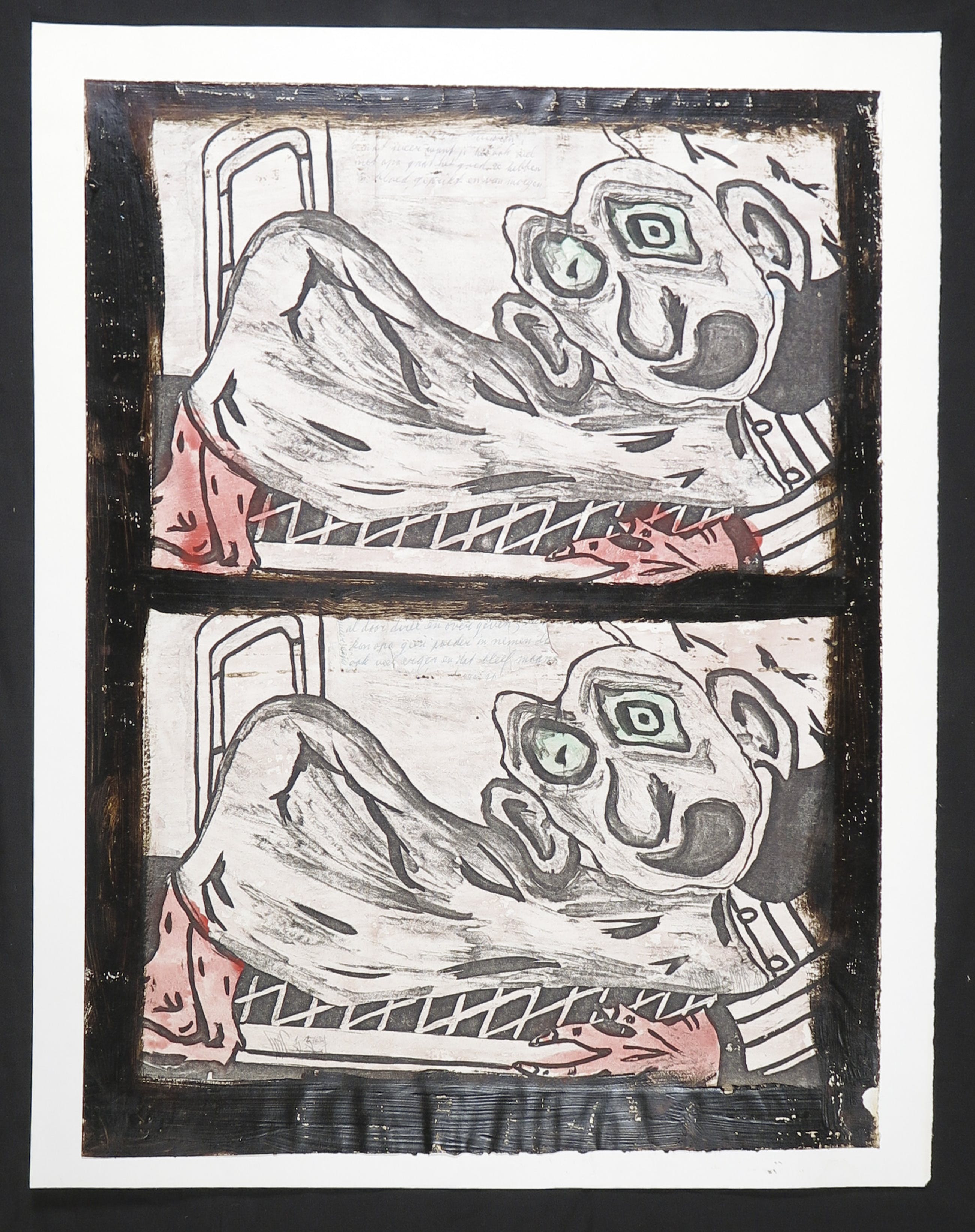 | Gebobbeld en met verfschade langs randen. Op onderblad bevestigd. | |||||||||||
